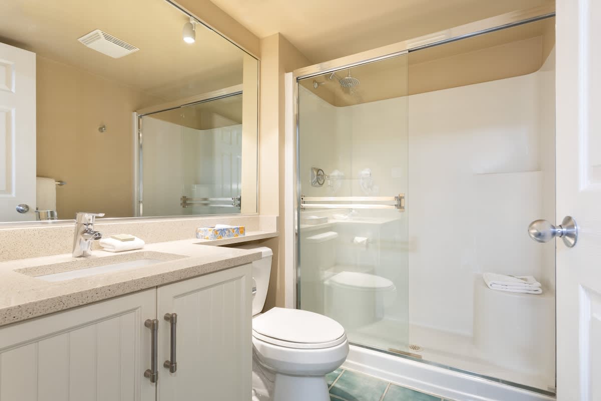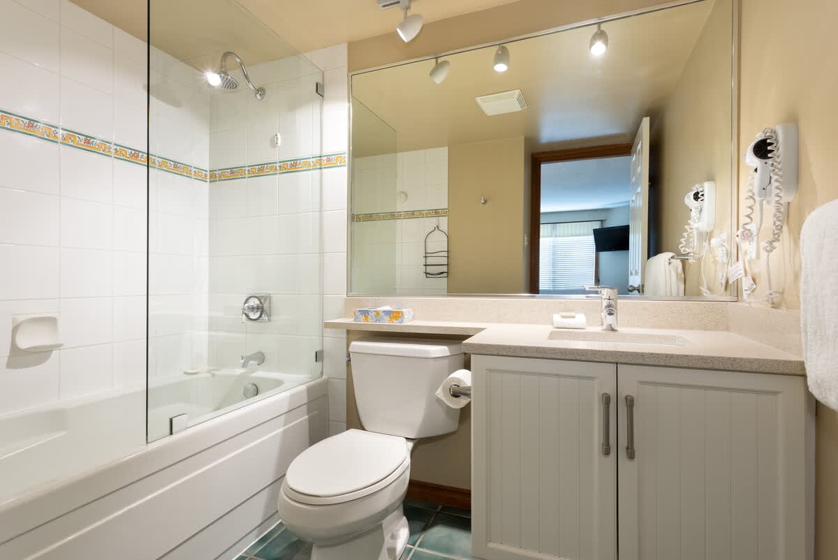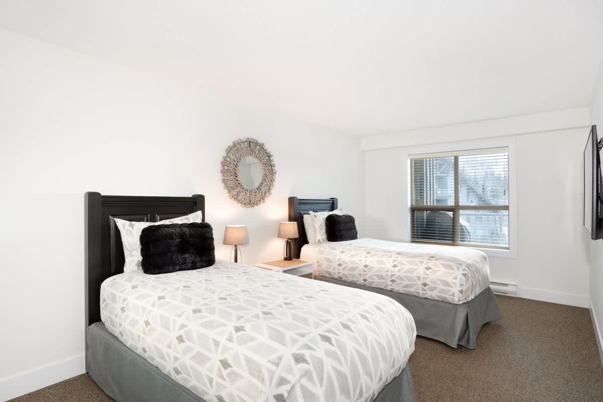 Designed for up to four guests, this two-bedroom, two-bath condo offers a restful layout after full days on the mountain. The spacious primary bedroom features a king bed, a TV, and an ensuite bathroom with a bathtub and overhead shower. The second bedroom includes two twin beds and convenient access to a separate full bathroom with a glass-enclosed shower.