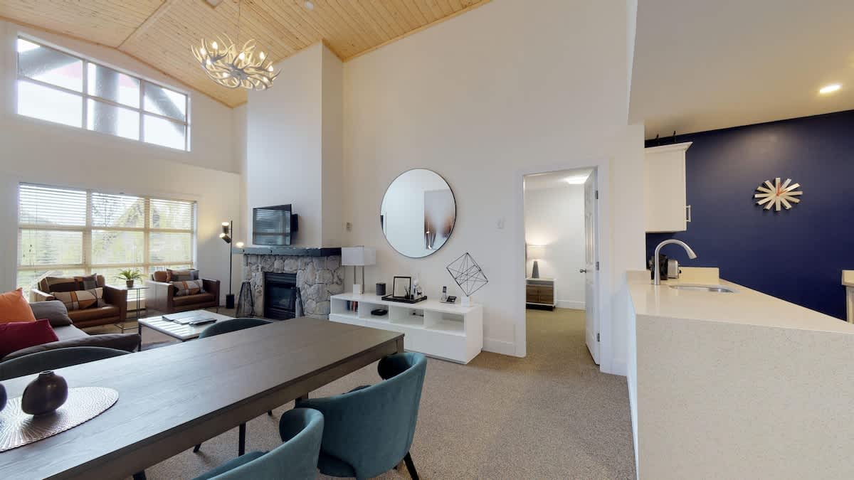 The open living room is a cozy place to unwind in winter. Settle into comfortable seating, watch TV, or warm up beside the indoor fireplace as the evening grows quiet outside. Vaulted ceilings and large windows bring in natural light and frame the surrounding alpine setting.