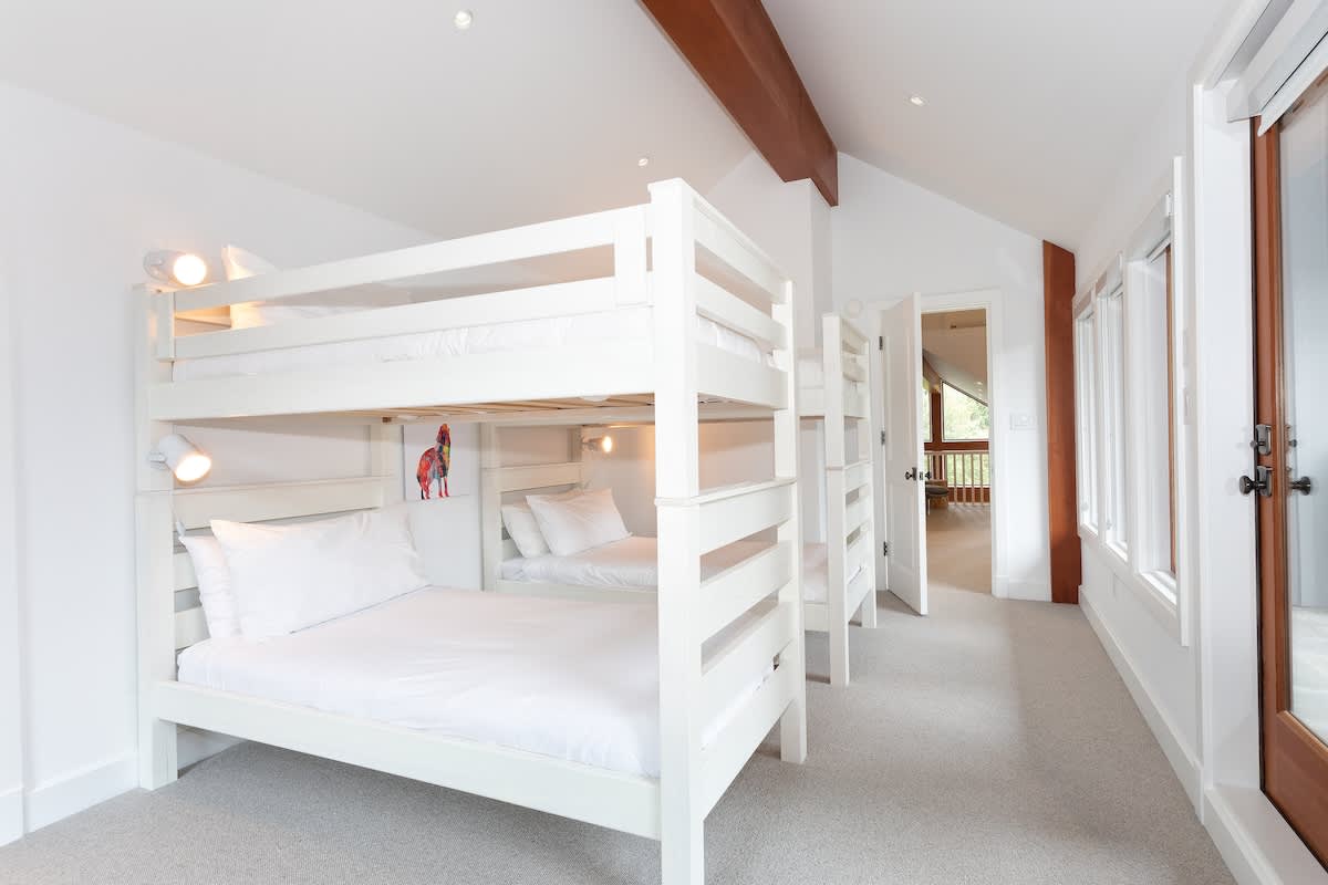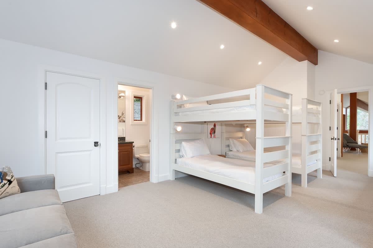 The upper level holds four bedrooms, each with its own ensuite bathroom. The primary suite includes a king-sized bed, fireplace, TV, and a private sundeck with scenic views. A second bedroom offers a queen bed, while the third includes a king bed. The fourth bedroom features two bunk beds, a TV, and a lounge area with bean bags and a sofa. A powder room on the main floor adds extra convenience.