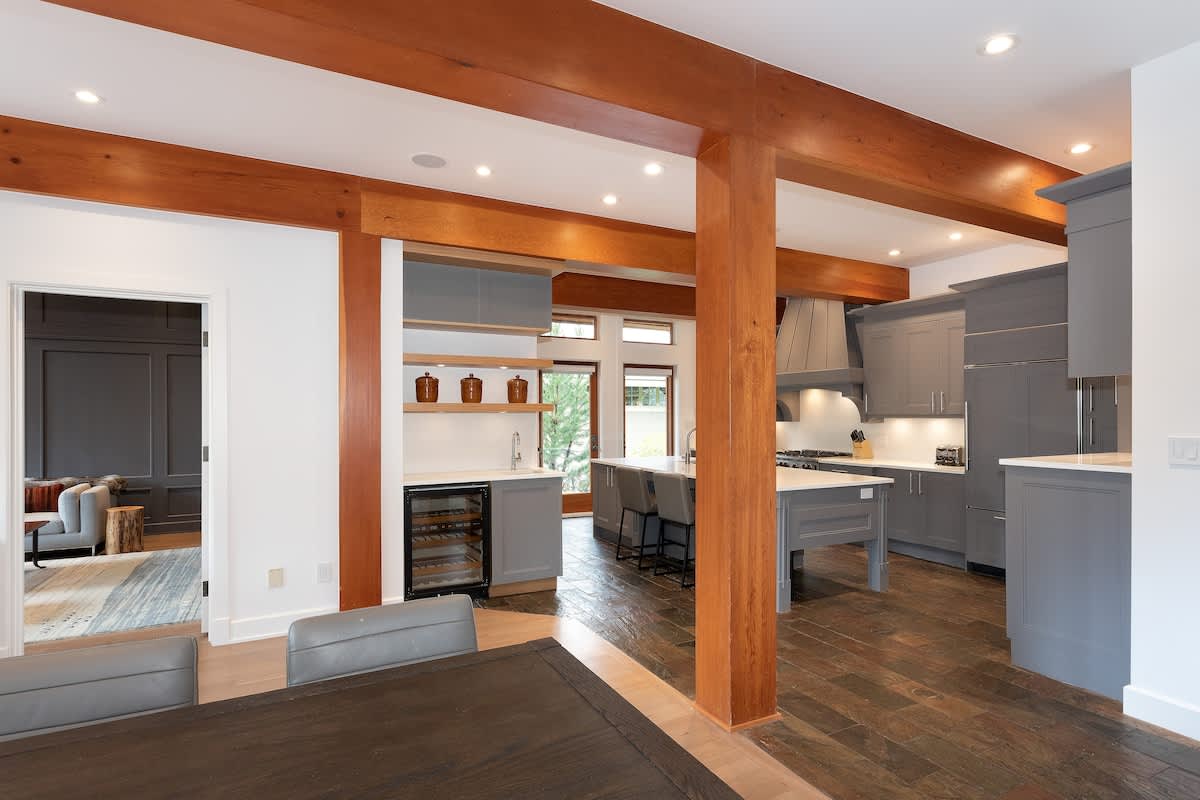 Set beside the first tee of the Nicklaus North, this two-level chalet offers inviting spaces for gathering and unwinding. Natural stone accents and exposed log beams create a classic Whistler atmosphere, while an upgraded media room and TV make cozy nights in especially easy. Whether you’re returning from the slopes or enjoying a slow afternoon indoors, the open living area stays connected to the mountain views beyond the glass.