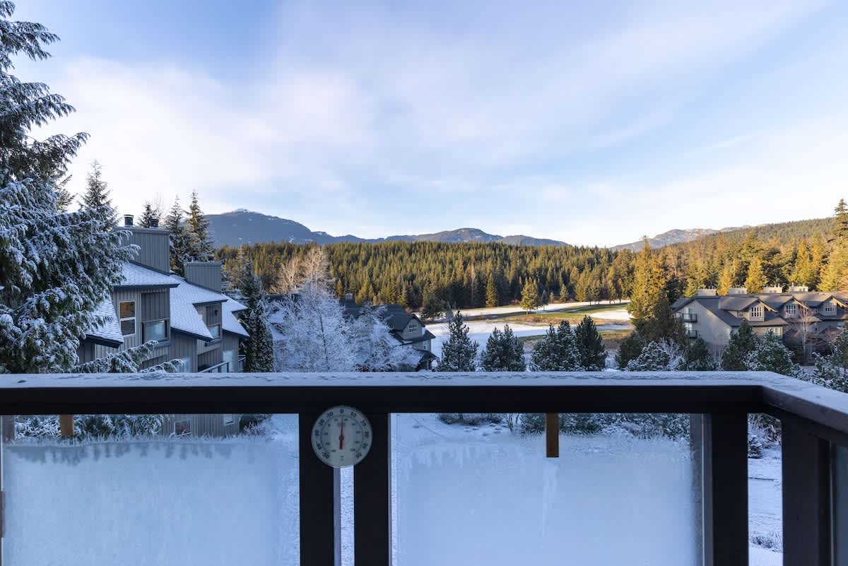 The private balcony offers a simple spot to breathe in alpine air or use the BBQ between winter outings. A shared hot tub is available on the property, providing a shared space to warm up and ease tired muscles after skiing or snowy adventures. Outdoor furniture adds an inviting touch for taking in the forested surroundings.
