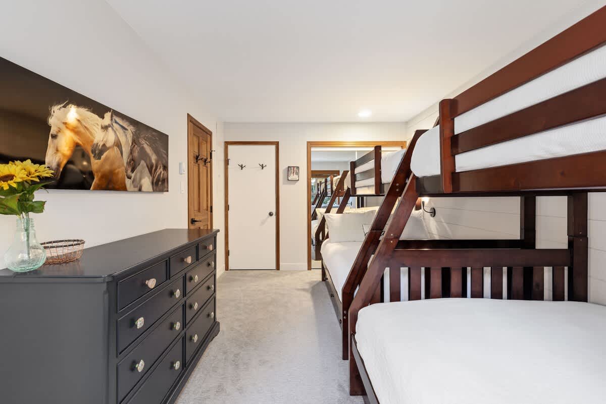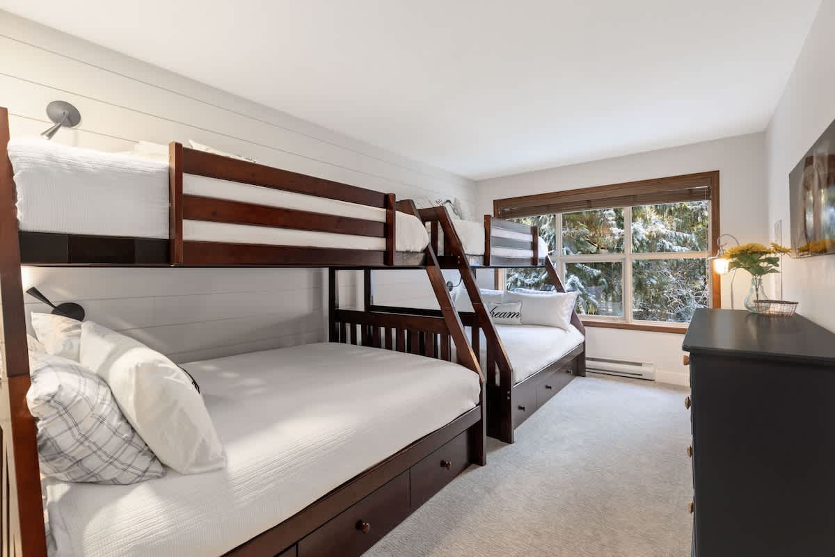 Set across two levels, the home accommodates up to six guests with three bedrooms and two bathrooms. The upper-level primary bedroom features a king bed, its own TV, and a private deck, along with an ensuite bathroom that includes a deep-soaking bathtub and an enclosed shower. On the main level, a second bedroom offers a king-split bed for adaptable setups, while the third bedroom includes two tri-bunks (double + single) suited to families or groups. A full bathroom with a glass-enclosed shower serves the main floor.