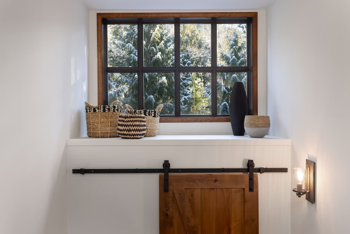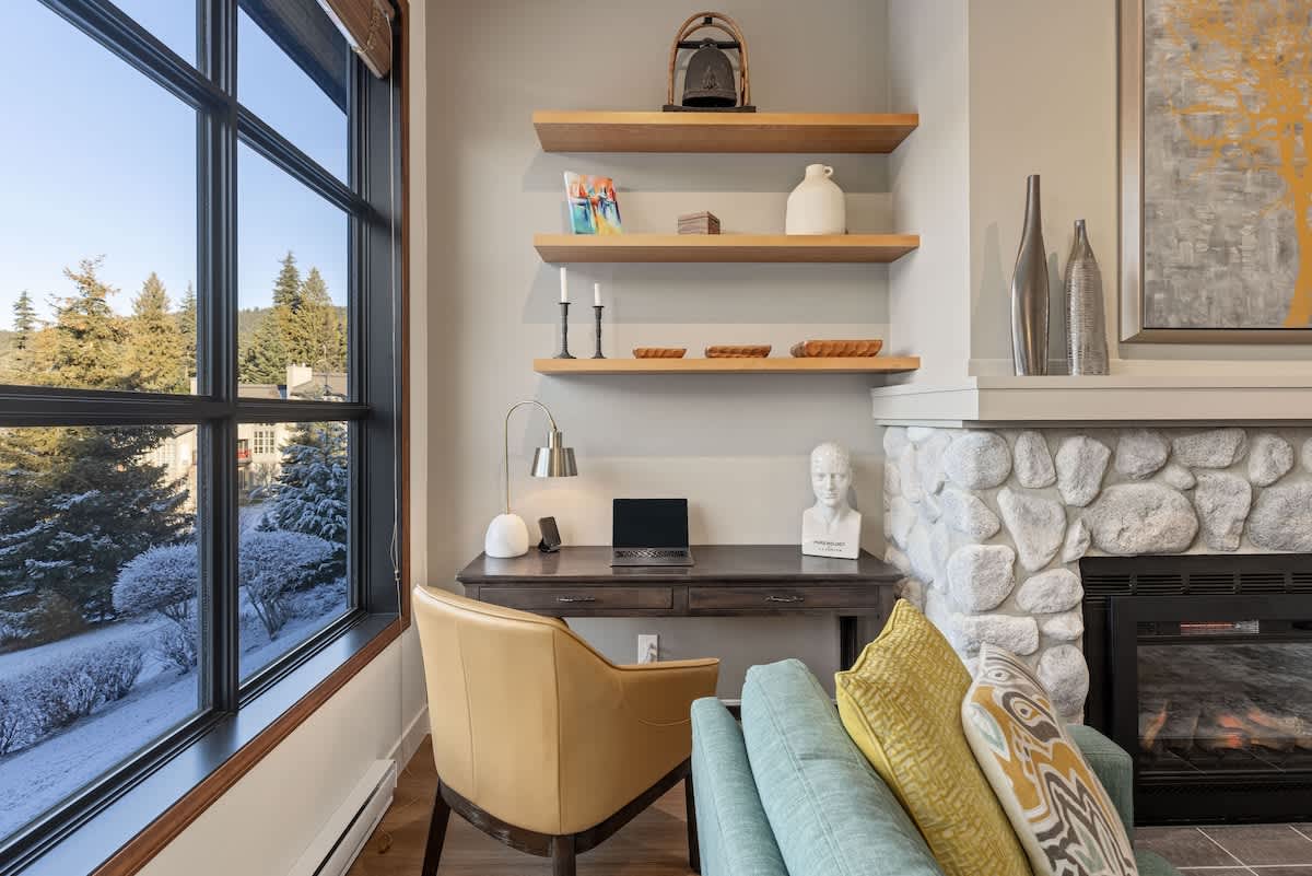 Vaulted ceilings and large windows frame the surrounding evergreens, giving the main living area an open and calming atmosphere. You can unwind beside the indoor fireplace, make use of the dedicated workspace with wifi, or settle into the quiet after exploring Whistler. Heating, portable fans, in-suite laundry, and a private entrance support comfort throughout your stay.