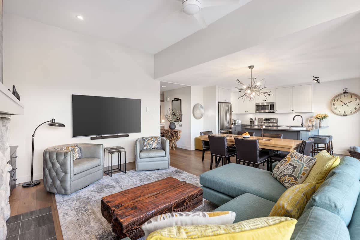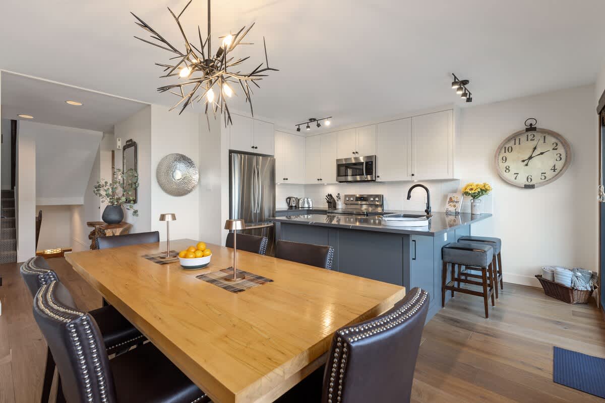 The fully equipped kitchen provides space to prepare meals at your own pace, whether it is breakfast before catching the free shuttle or dinner after returning from snowy trails. An adjoining dining area seats six and creates an easy gathering place for shared meals and relaxed conversations.