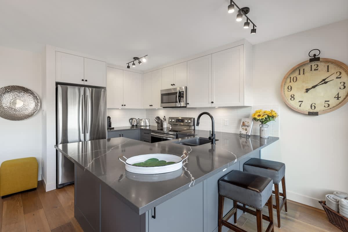 Bathroom essentials, washer and dryer, clothing storage, a safe, TV, heating, smoke alarm, carbon monoxide alarm, fire extinguisher, and smart lock self check-in are provided. The kitchen includes essentials for cooking and dining, along with a refrigerator, stove, oven, dishwasher, microwave, freezer, coffee maker, hot water kettle, and dining table. Wifi and a dedicated workspace support both leisure and remote work needs. Guests have access to a free parking garage on premises and free street parking. Luggage dropoff and long term stays are allowed.