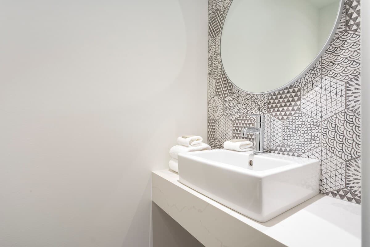 Up to eight guests can rest comfortably across four sleeping areas. The upstairs primary bedroom features a king bed, cable TV, a private balcony, and an ensuite bathroom with a walk-in glass shower, soaking bathtub, and double vanity. On the lower level, one bedroom includes a queen bed and ensuite bath, while another offers a king-split bed that can be arranged as two twins. A separate den hosts a tri-bunk bed. While this space is designed as a den and does not have an external window, it offers a comfortable and private sleeping space. The lower level also includes a third full bathroom with a bathtub and double vanity, and a powder room sits on the main floor for added convenience.