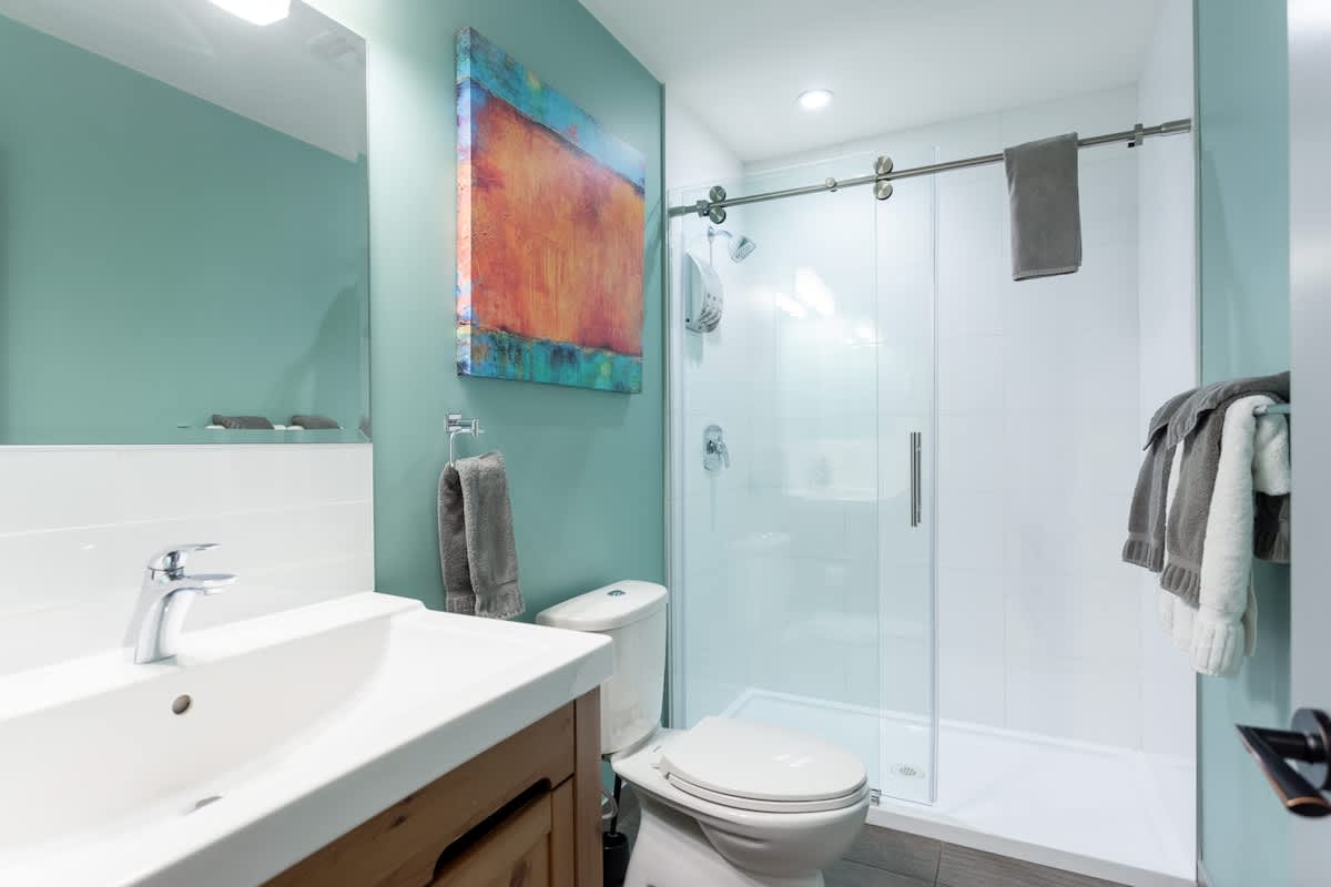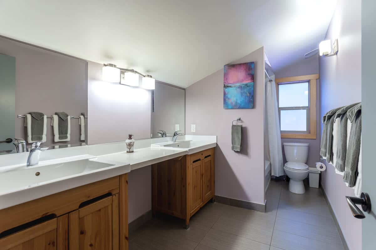 Sleeps 20 with eight ensuite bedrooms designed to accommodate families and groups comfortably under one roof. On the main level, six bedrooms feature a mix of king and queen beds, each with a private step-in shower and single vanity. Upstairs, two additional bedrooms continue the ensuite layout with one king and one queen bed. A powder room with a shower is located conveniently near the hot tub area.