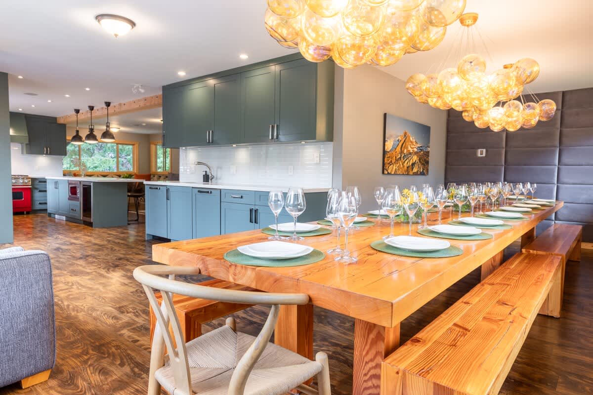 Cooking and gathering come naturally here, thanks to a chef’s kitchen equipped with a 48" Viking range, double refrigerators, and double dishwashers. The long harvest-style dining table stretches 18 feet and seats eighteen guests, making shared meals a central part of the experience.