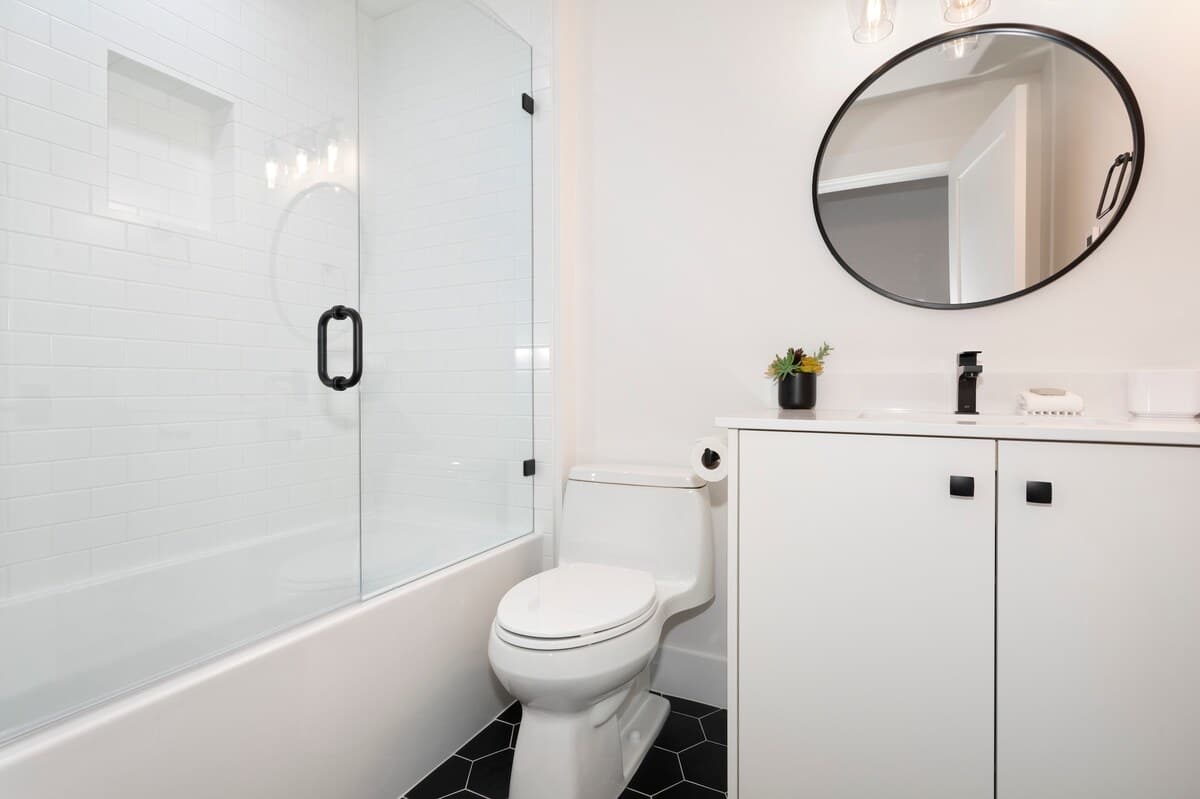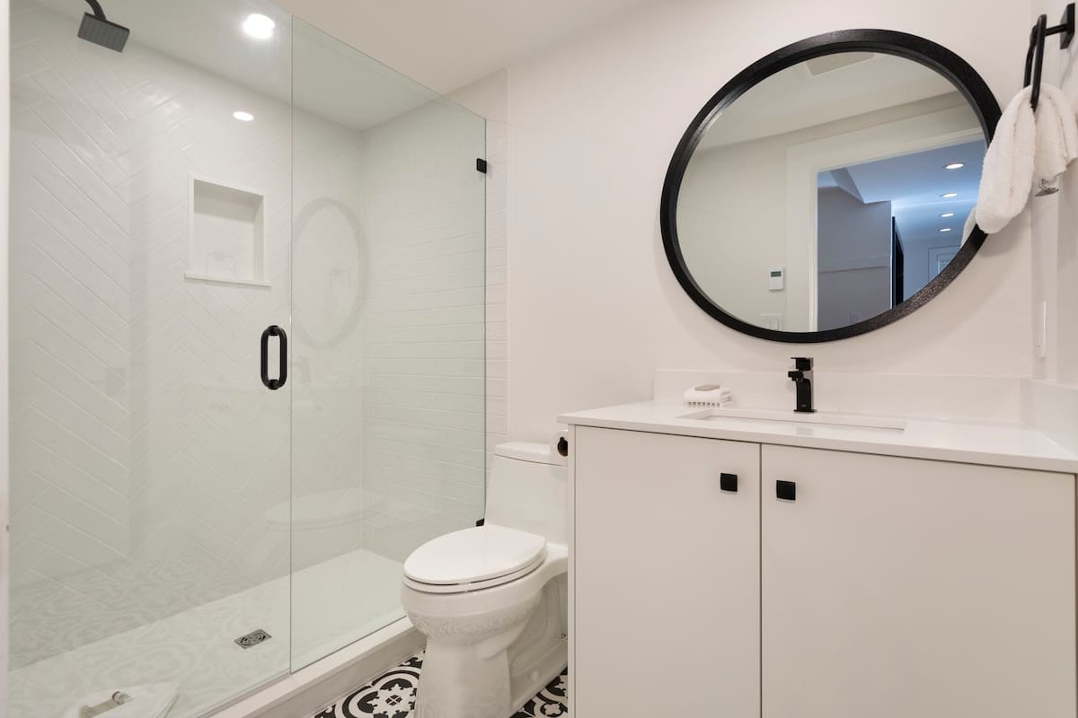 Three bathrooms provide convenience across the home. The ground-floor bath includes a shower along with the washer and dryer, while the upper-level bathroom features a single vanity and glass-enclosed shower.