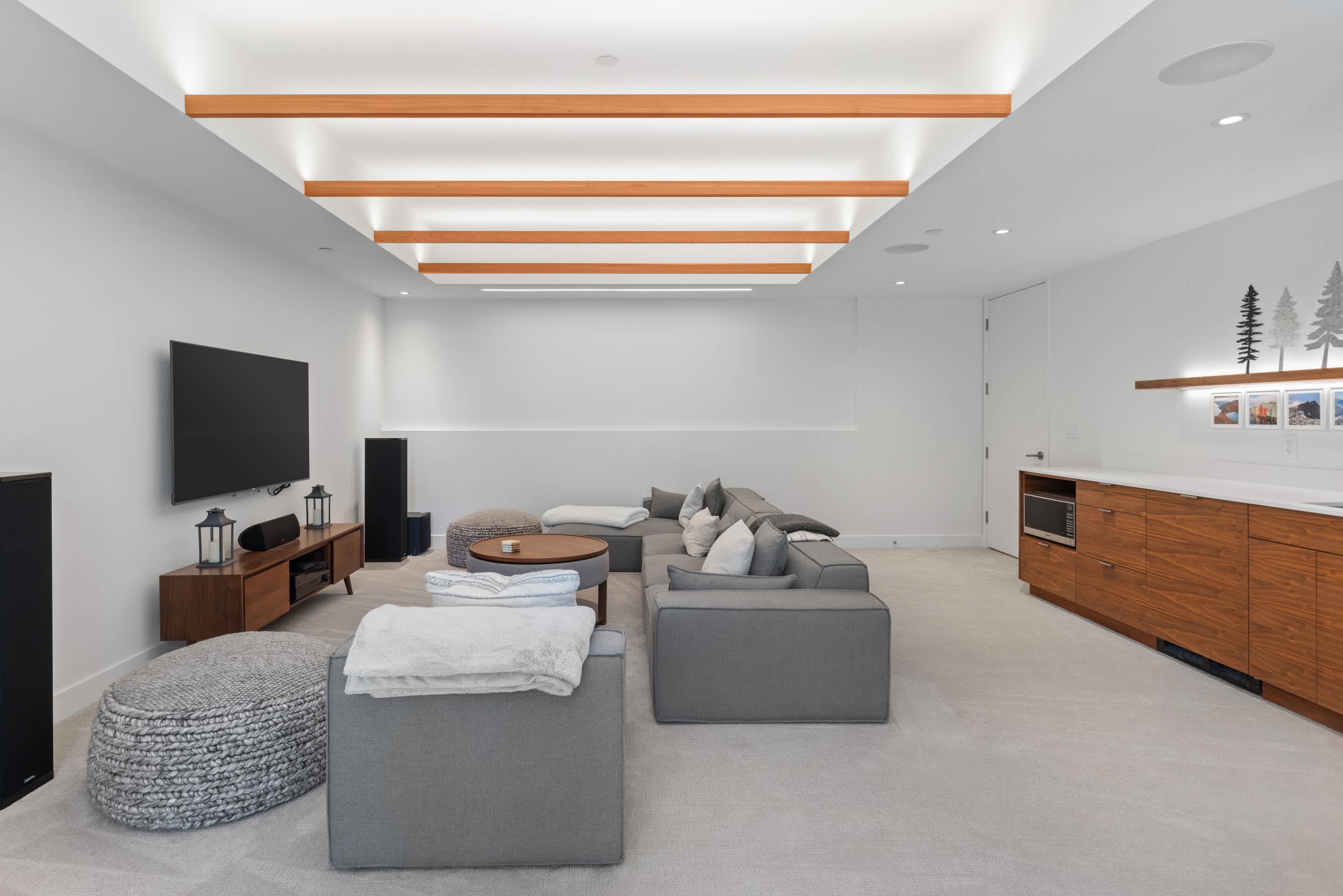 The main living area is open and inviting, designed for coming together after winter days outdoors. Wood-beamed ceilings and floor-to-ceiling windows frame mountain views, while the stone fireplace anchors the room. Comfortable seating and a TV make it easy to unwind, and a separate media lounge with wet bar offers a more relaxed spot for movie nights or quiet conversation. Heating, air conditioning, and portable fans support comfort throughout the year.