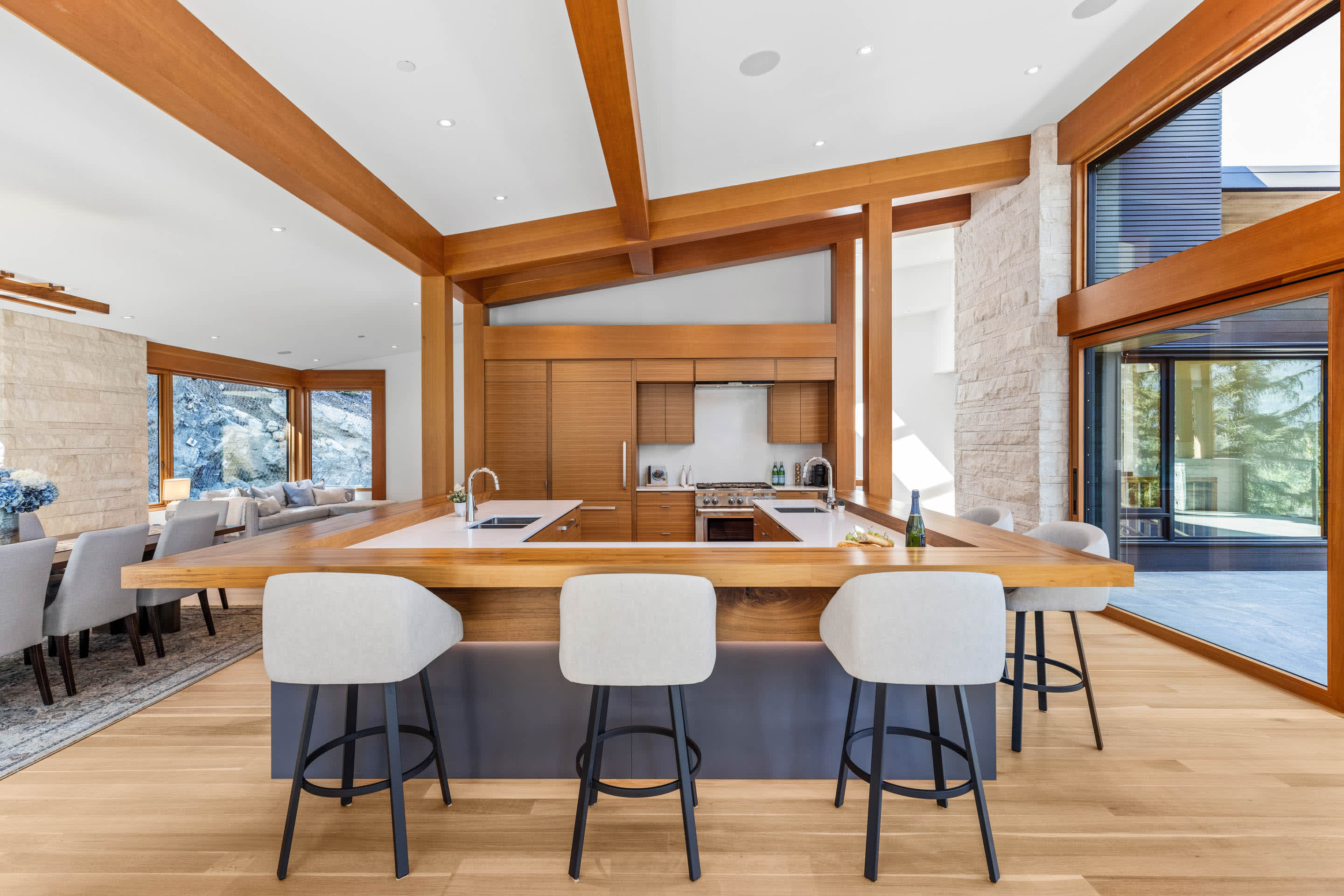 The kitchen sits at the center of the home’s layout, encouraging shared mornings and evenings. It is fully equipped for preparing meals at home, with generous counter space and a breakfast bar. The adjacent dining area seats eight, making it a natural place to linger over dinner after a day on the mountain.