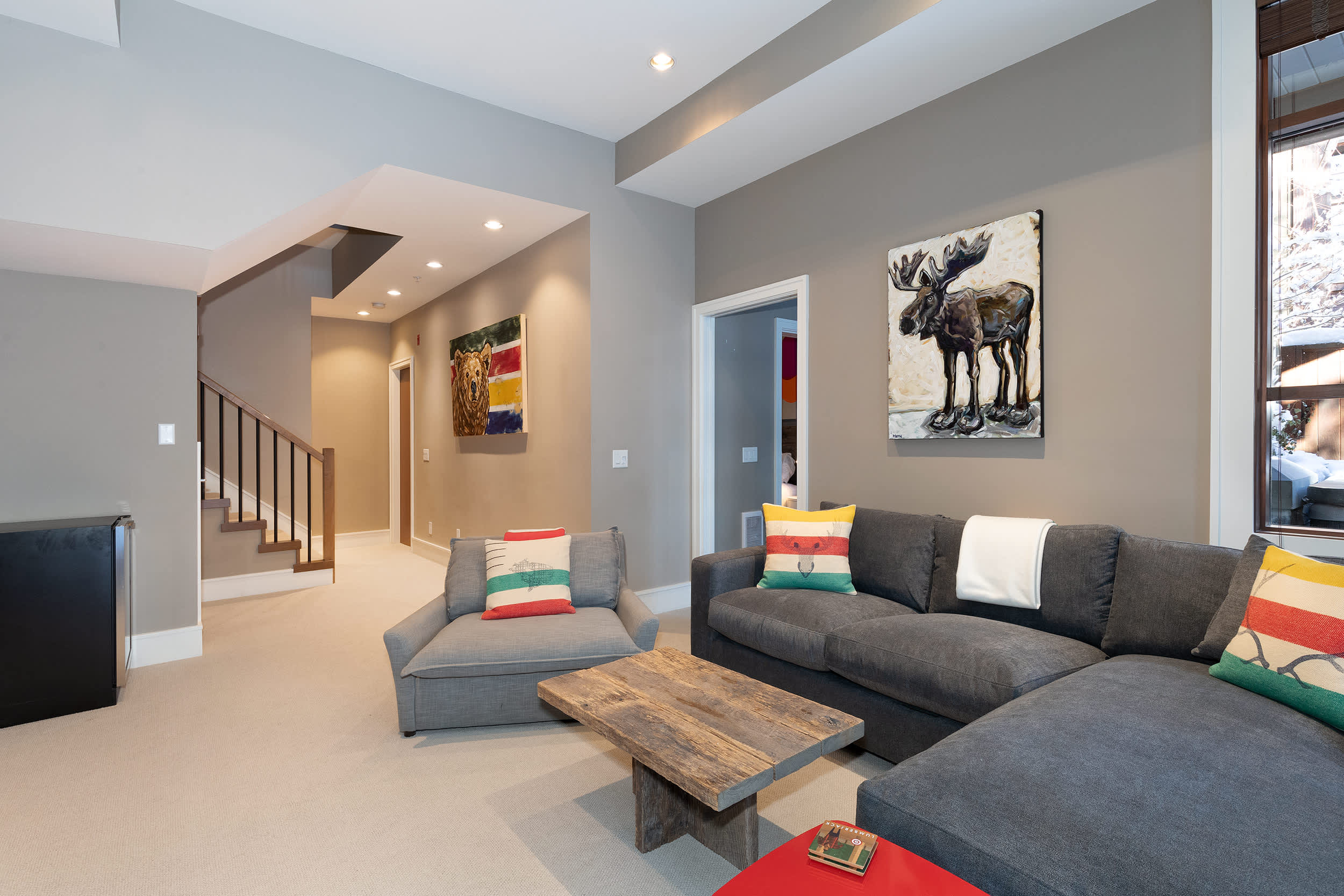 Mountain views frame the main lounge, where comfortable seating and a TV create a welcoming setting to warm up after winter excursions. A separate media room with a large TV and a queen sofa bed offers another place to unwind. Air conditioning, heating, portable fans, and an indoor fireplace support comfort throughout your stay.