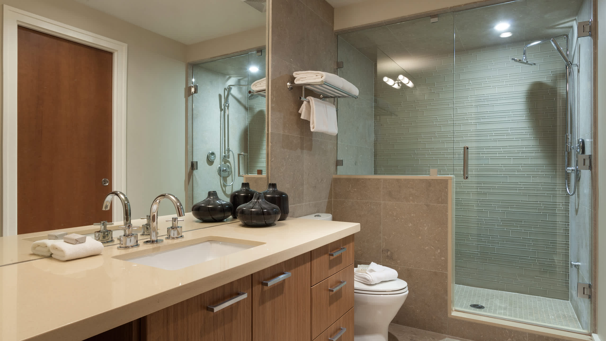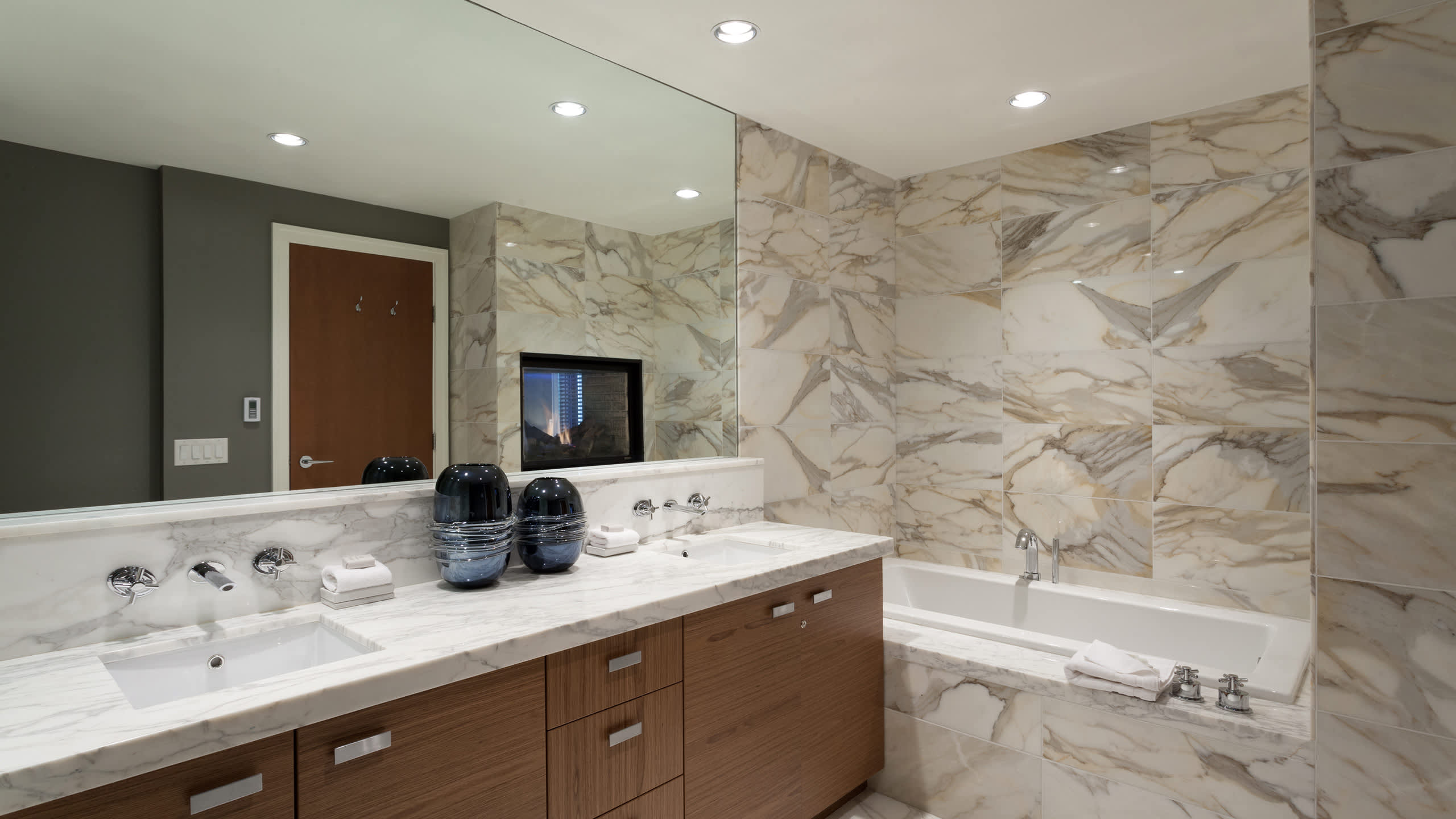 This townhouse accommodates up to 8 guests across three levels, offering 4 bedrooms and 3.5 baths designed for restful nights after full days outdoors. The upper-level primary bedroom includes a king bed, TV, and a double-sided indoor fireplace that continues into its ensuite with a deep-soaking bathtub, glass-enclosed shower, and double vanity. A second bedroom with a queen bed shares an ensuite with a third bedroom that features twin beds and a TV, together providing a deep-soaking tub and rain shower. On the lower level, a fourth bedroom includes a king-split bed, TV, desk, and an ensuite with a glass-enclosed shower. A powder room near the entrance adds additional convenience.