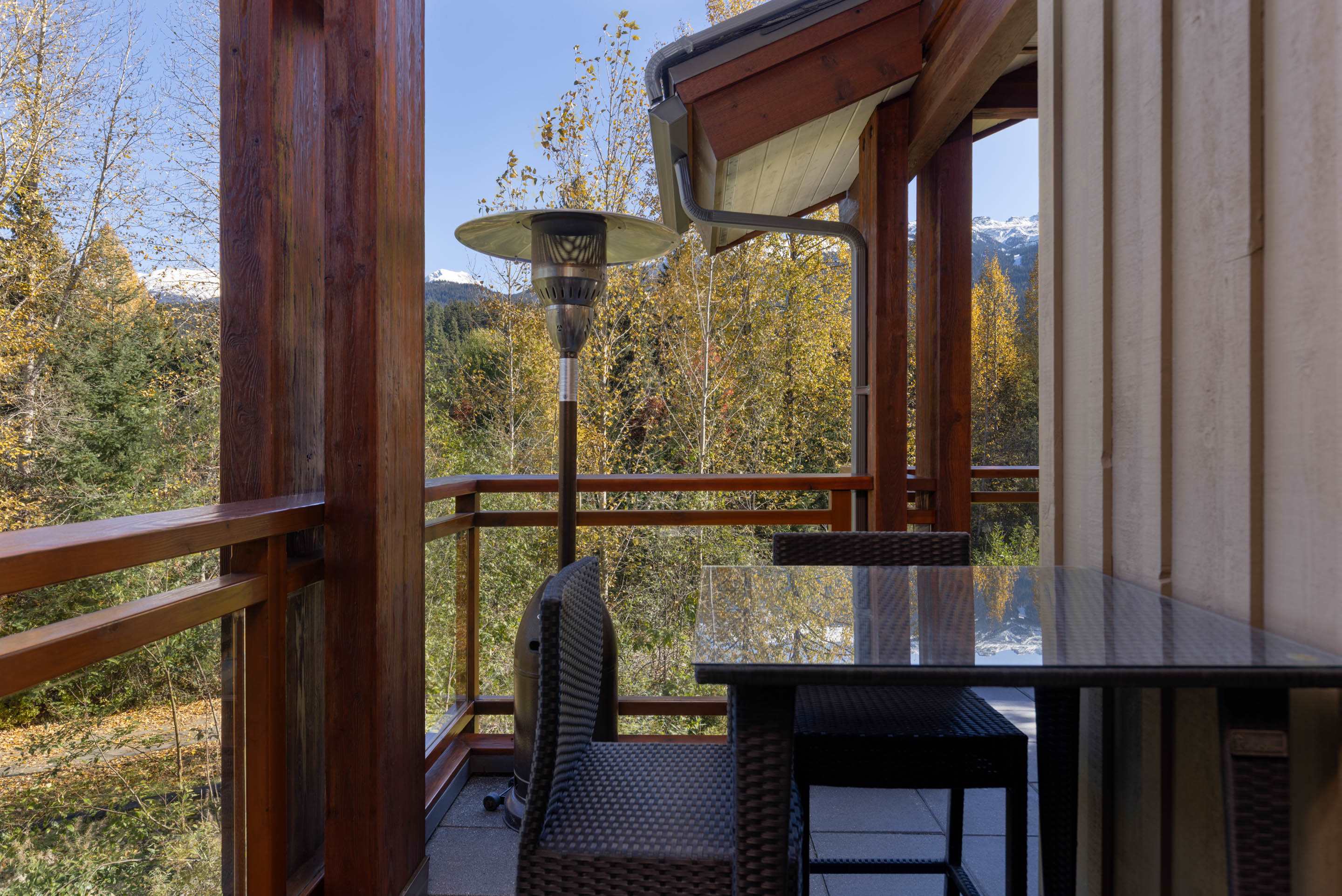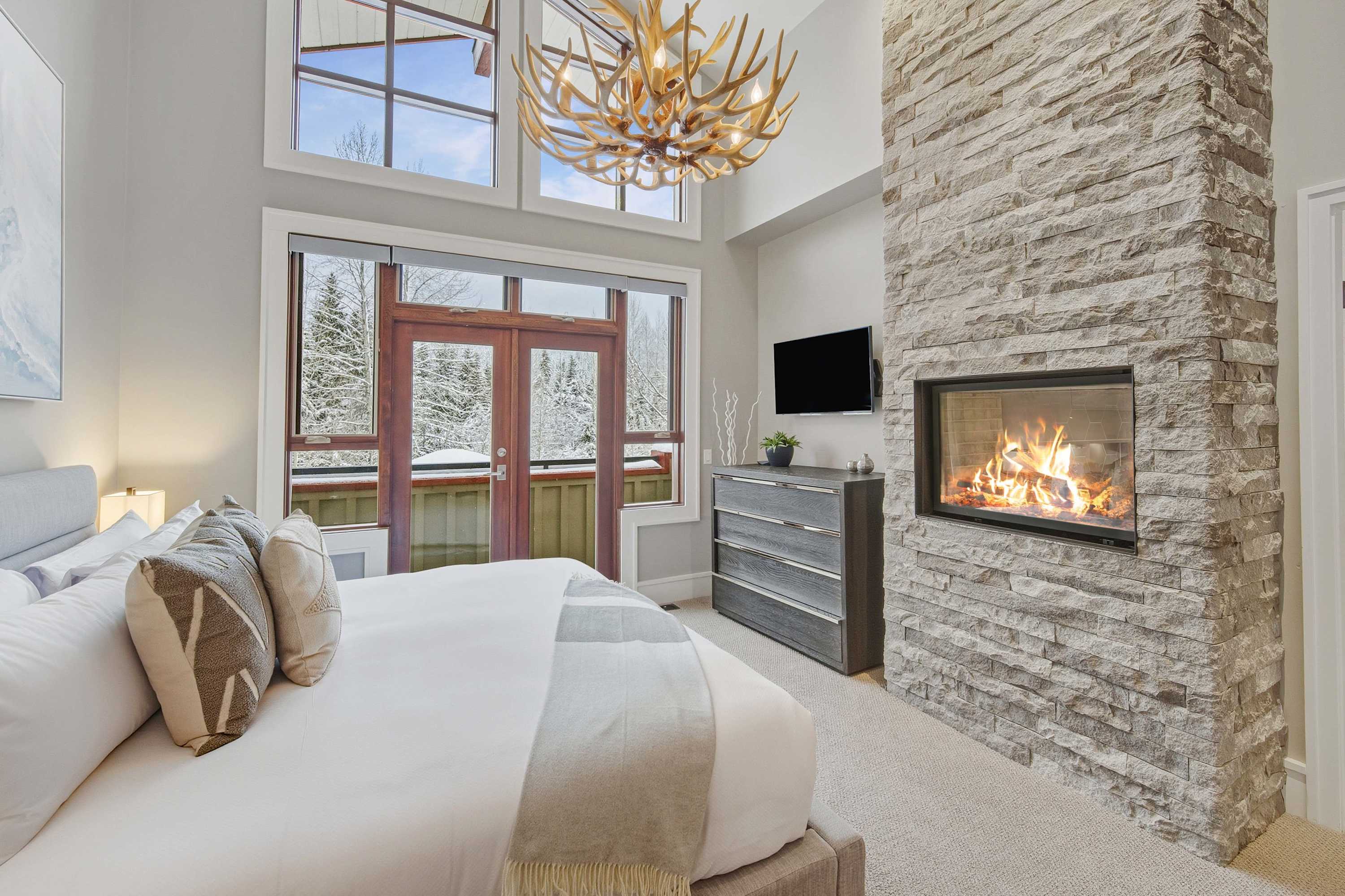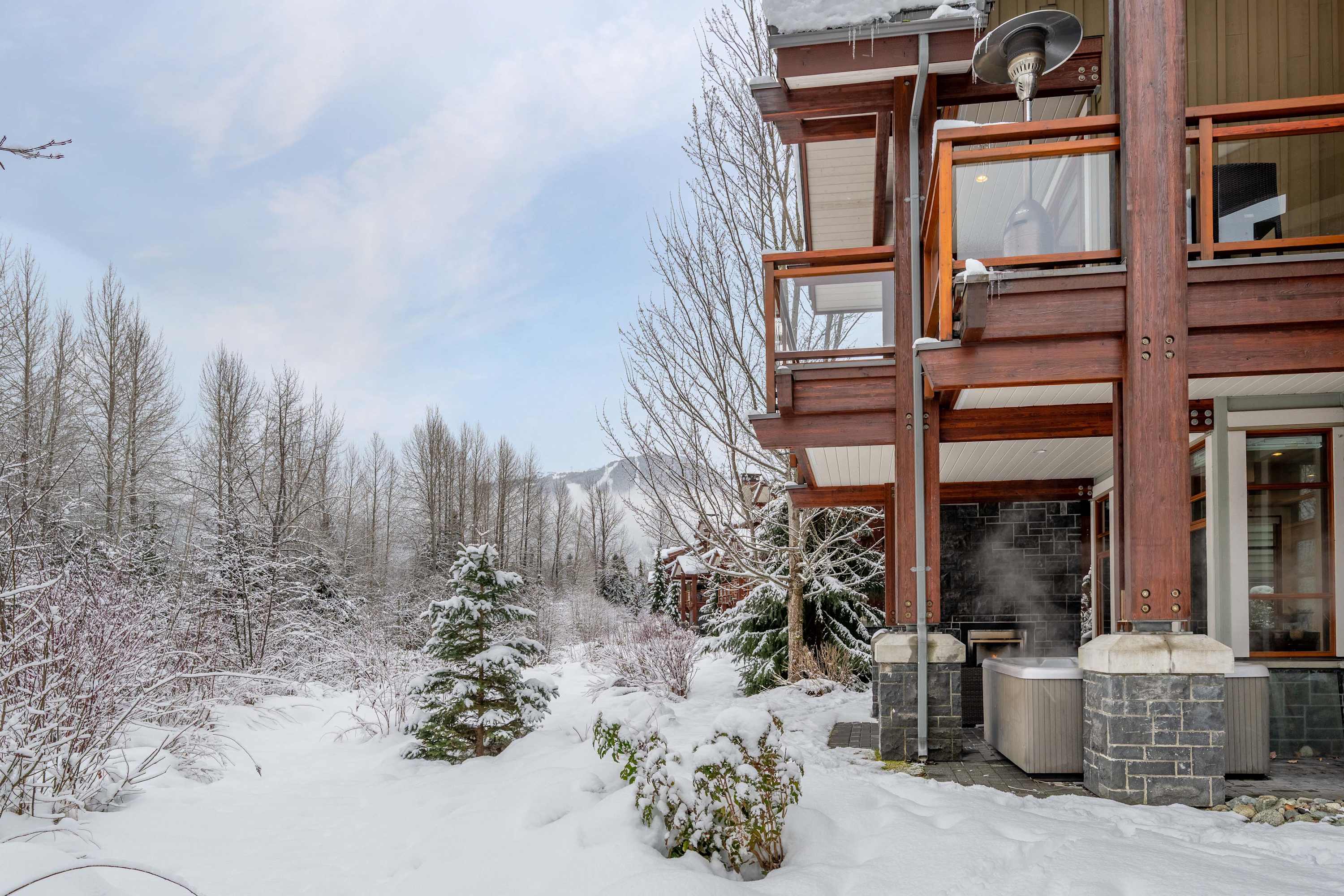 Winter evenings are best spent outdoors here, soaking in the hot tub or gathering around the outdoor fireplace as the creek flows nearby. Balconies and patios provide peaceful spots to pause, breathe in the mountain air, and enjoy the setting year-round.