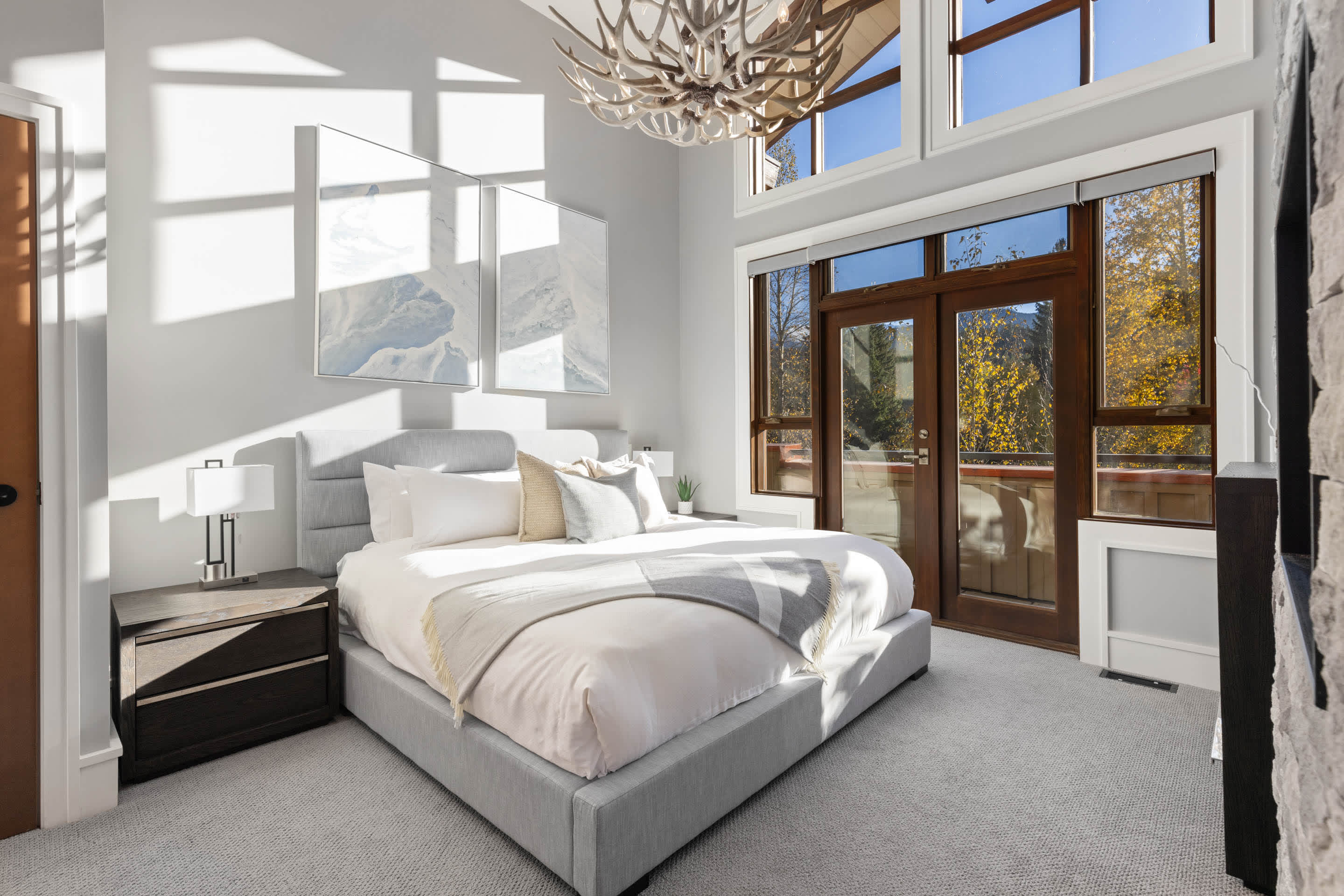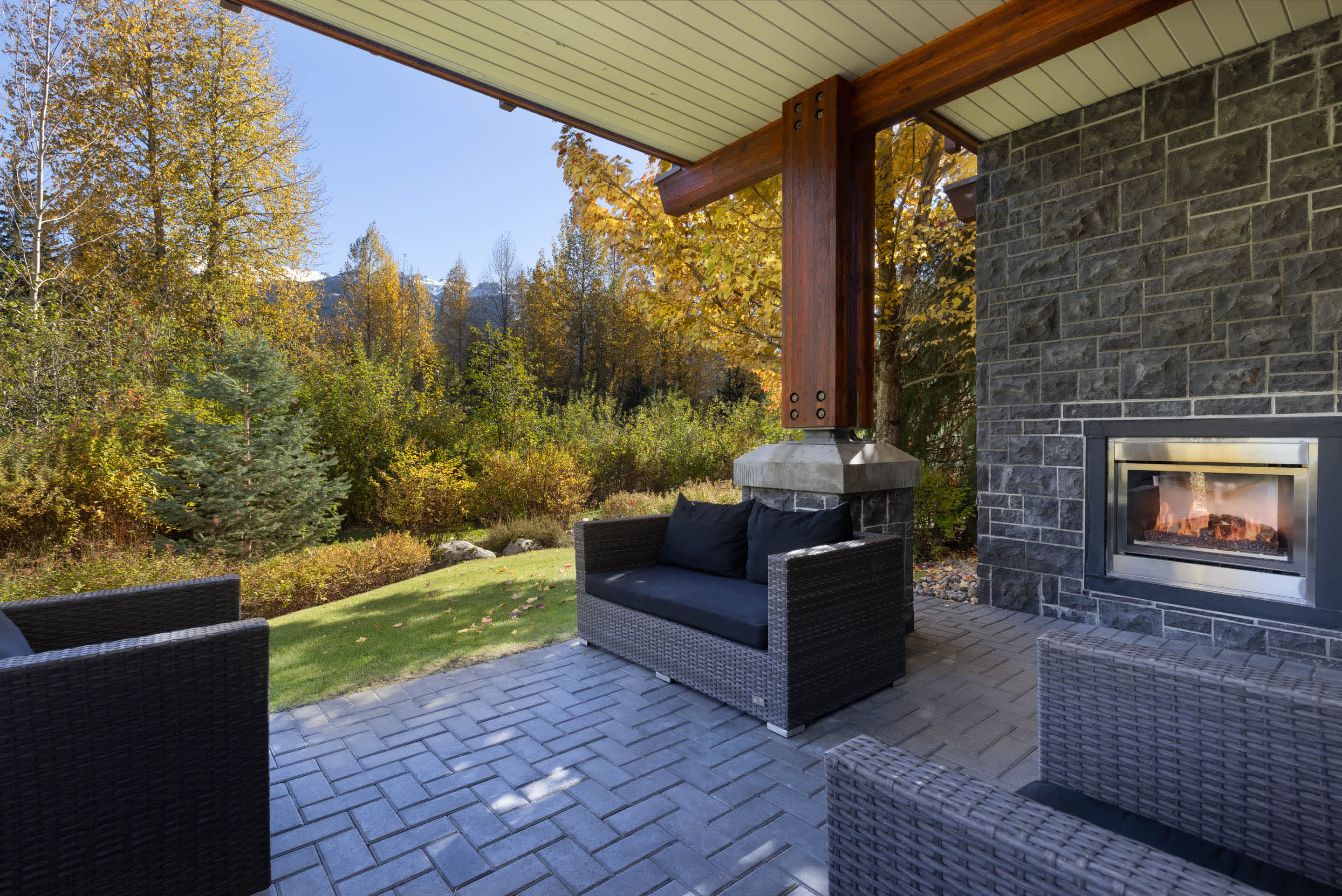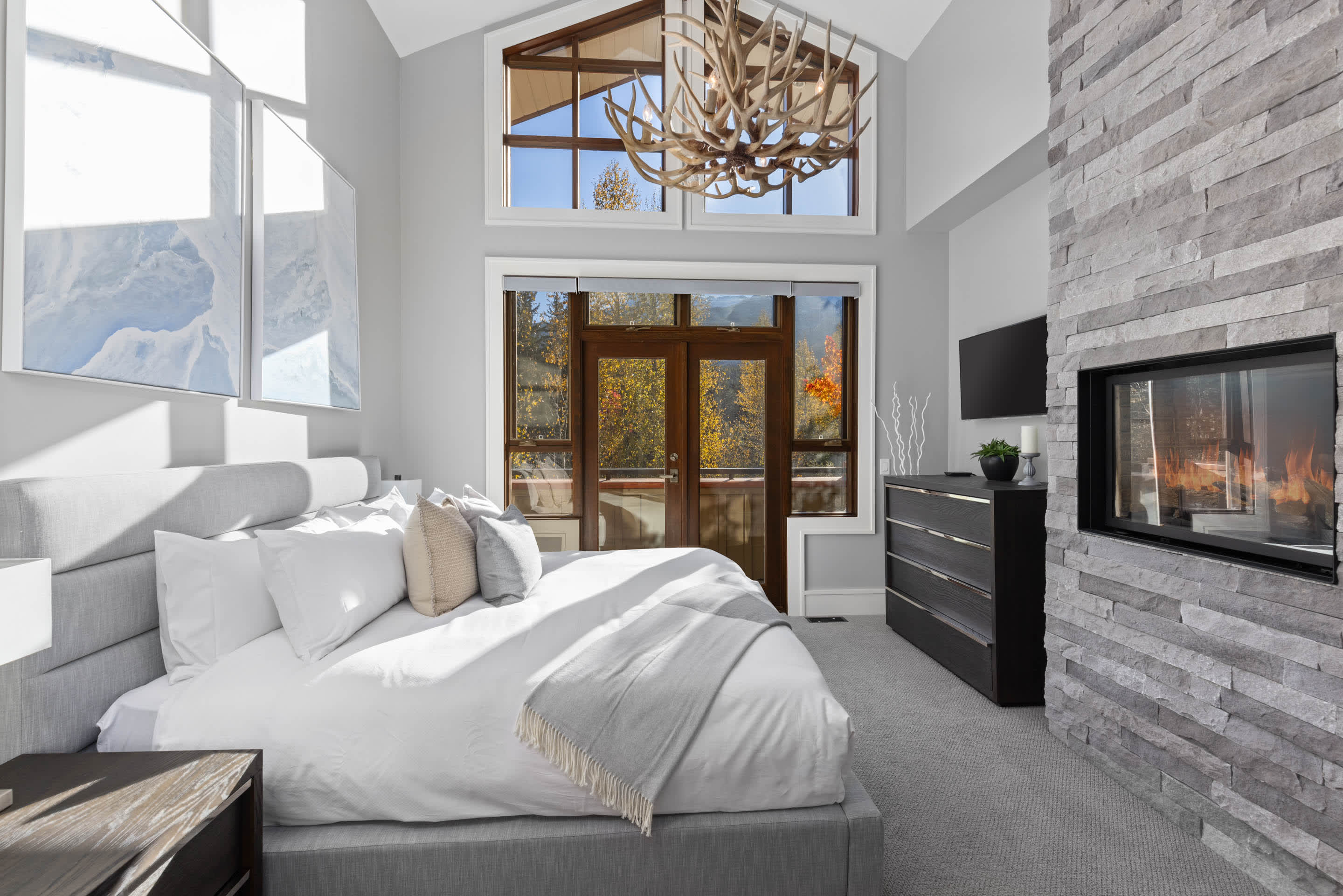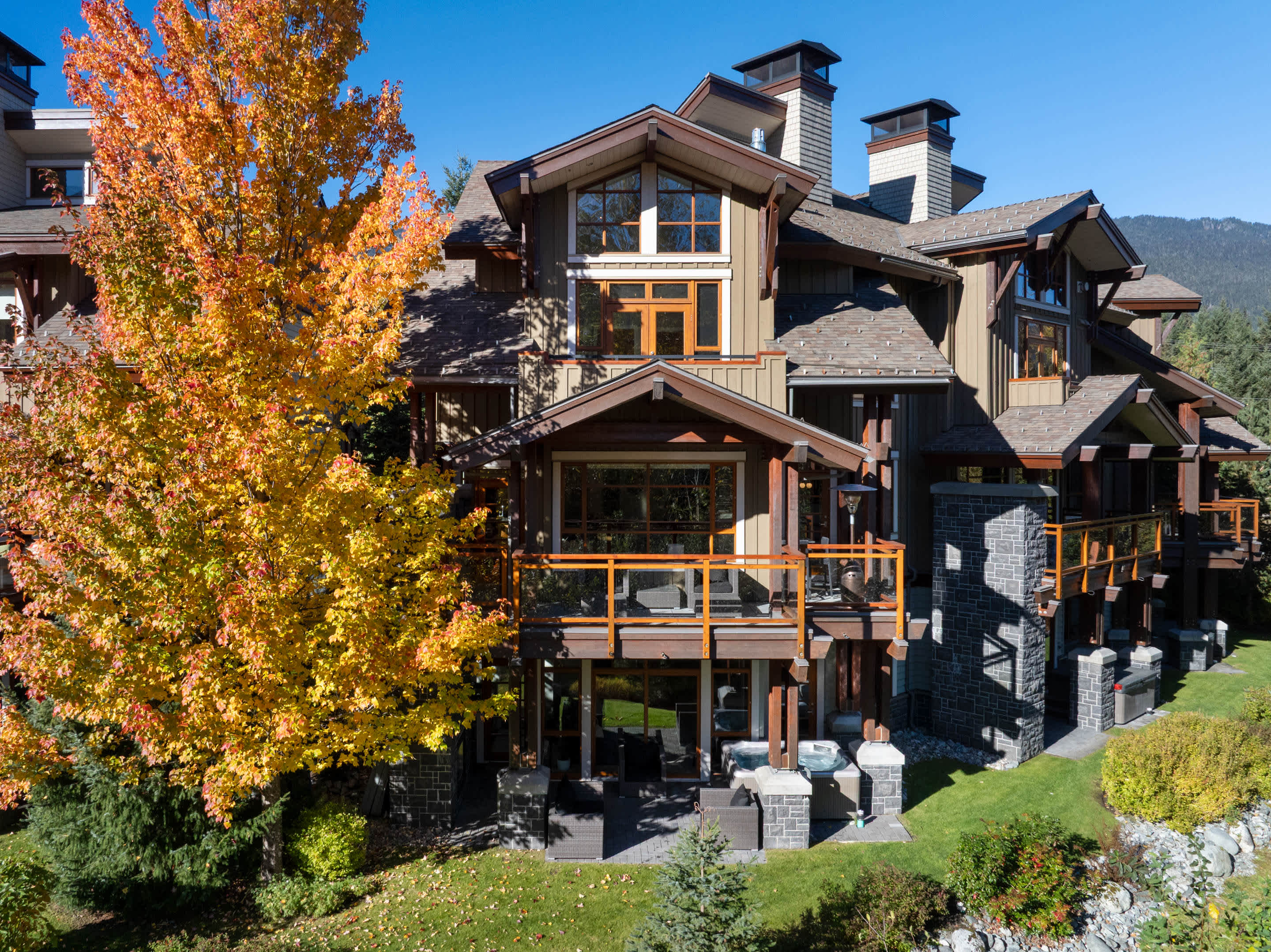 Winter evenings are best spent outdoors here, soaking in the hot tub or gathering around the outdoor fireplace as the creek flows nearby. Balconies and patios provide peaceful spots to pause, breathe in the mountain air, and enjoy the setting year-round.