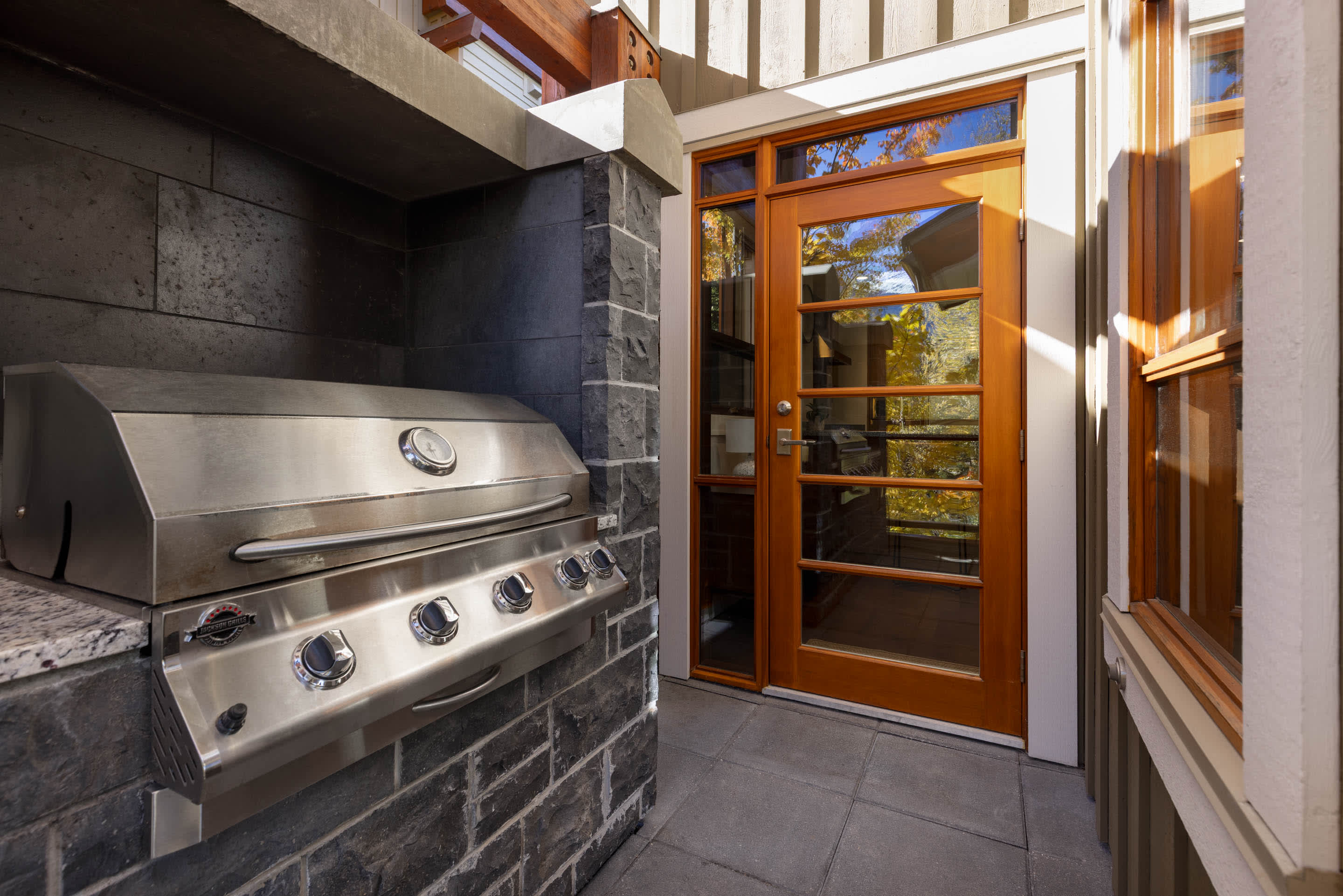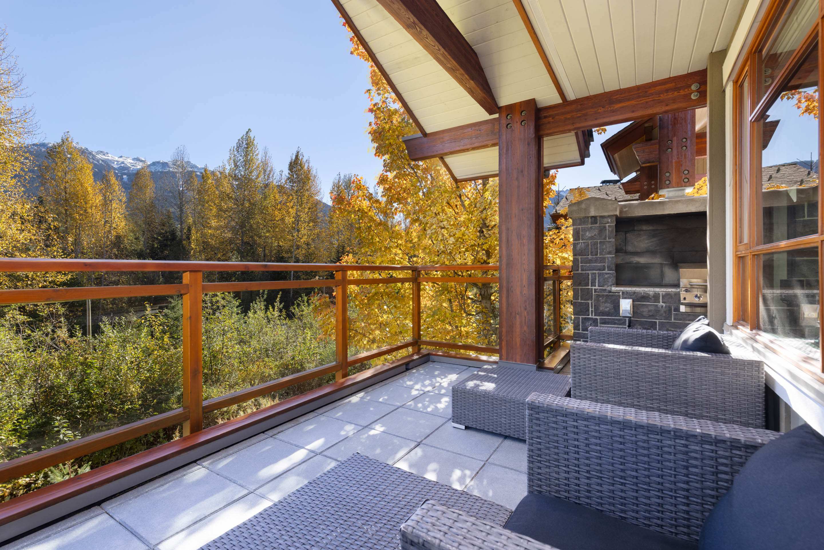 The kitchen is built for shared cooking and relaxed mornings, offering generous counter space, a full kitchen setup, and a central island that keeps conversation going. Just outside, the patio includes outdoor furniture and a BBQ grill, making it easy to step out for fresh mountain air between meals.