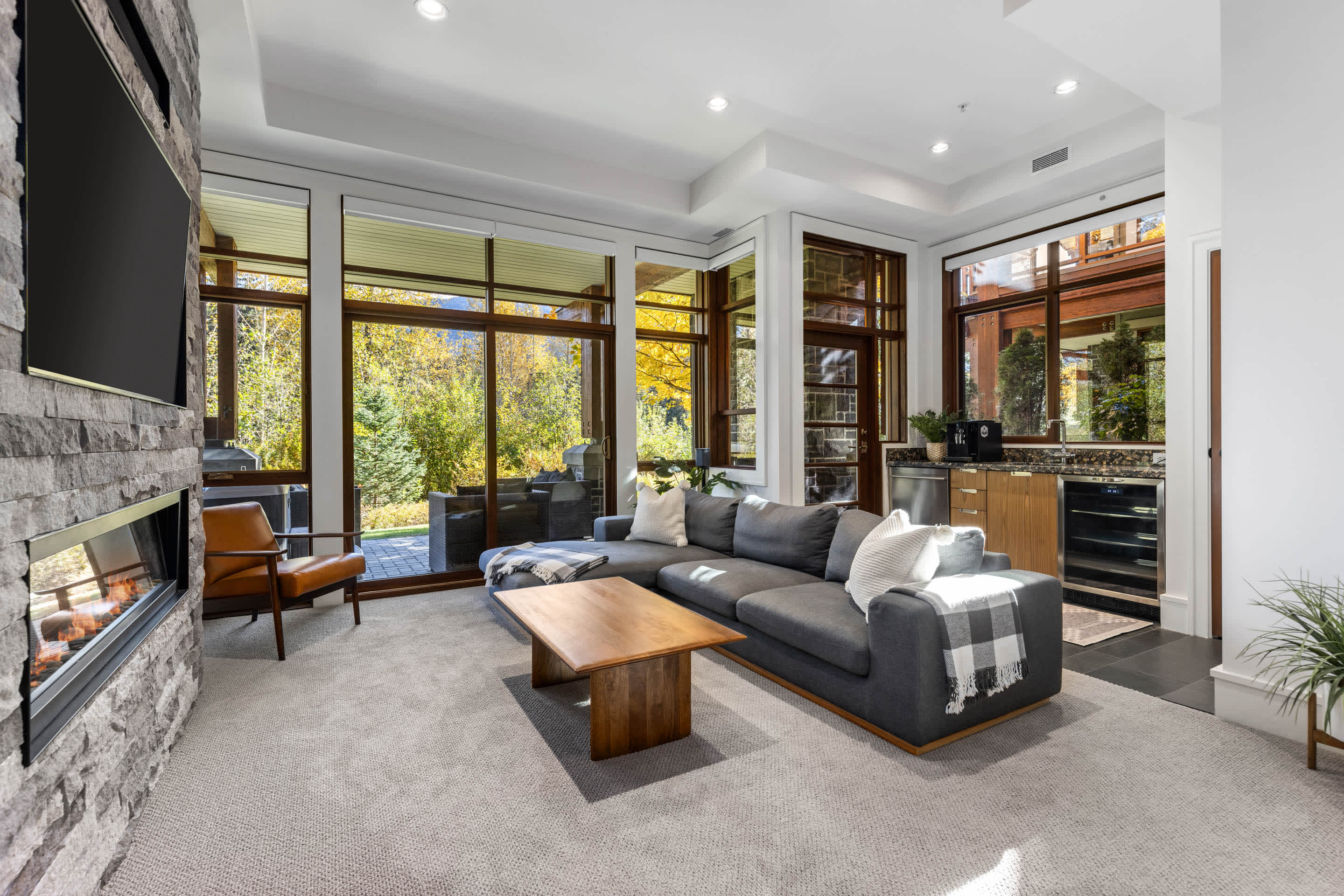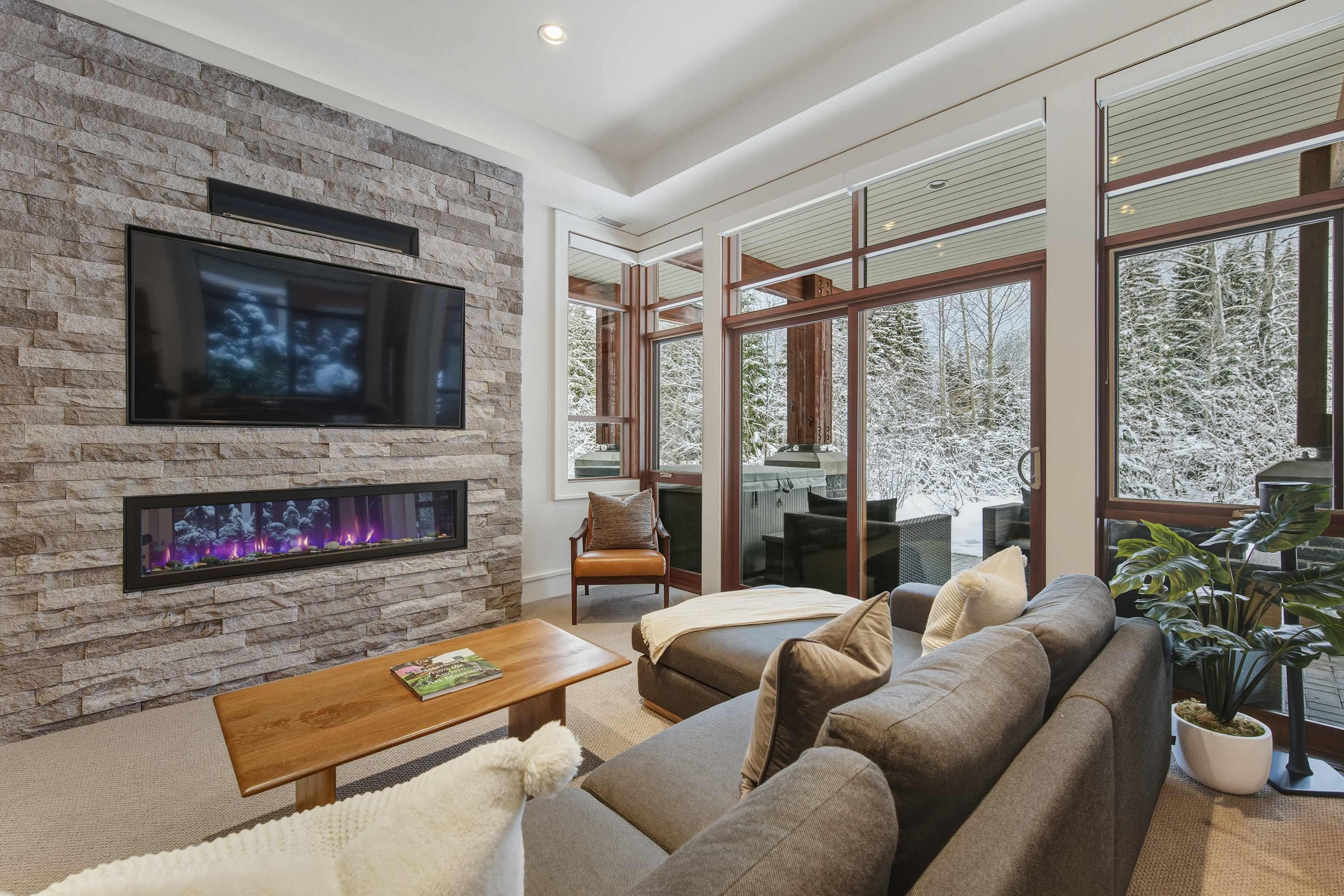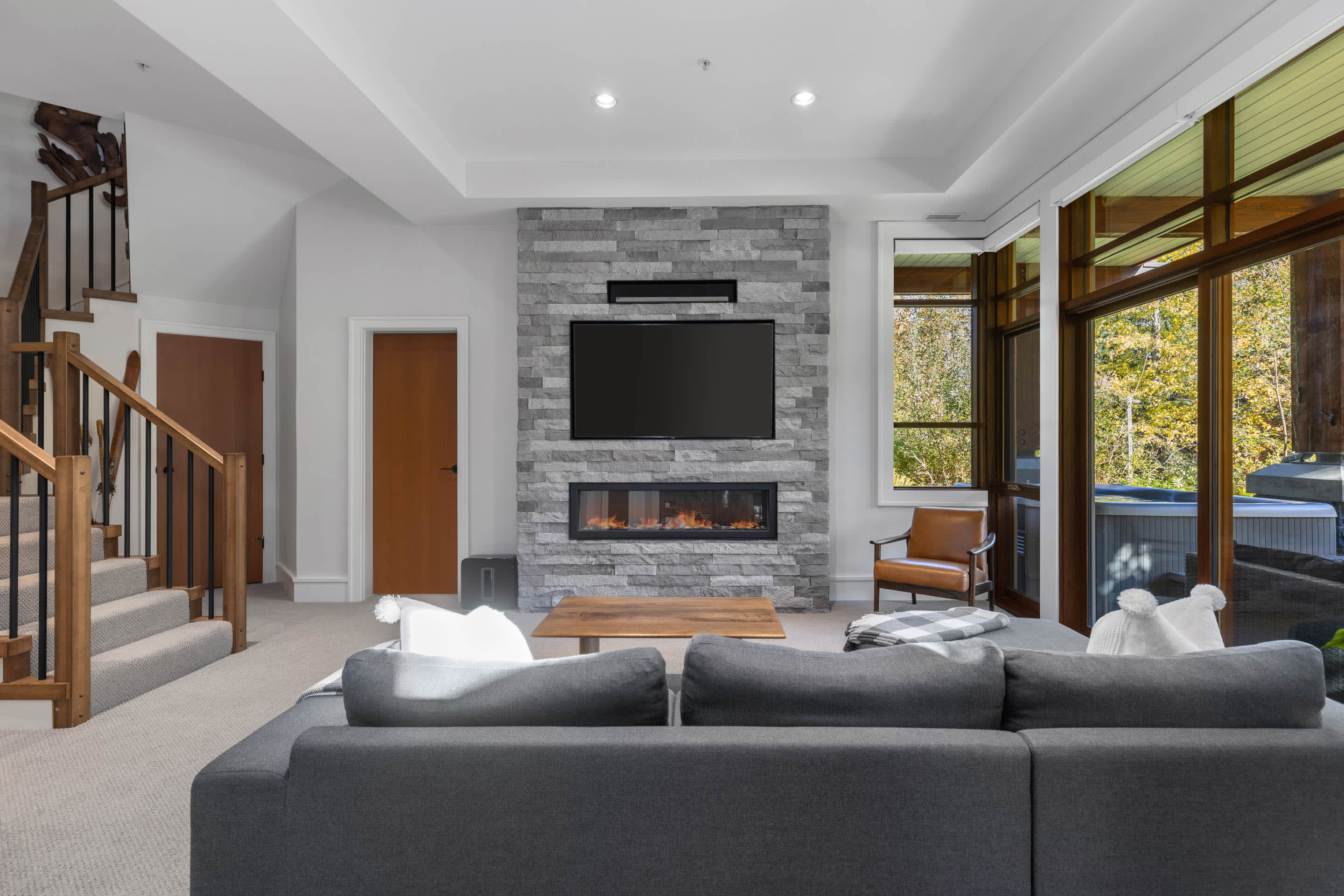 A second living area on the lower level creates a relaxed spot for movie nights or downtime, complete with a wet bar and comfortable seating. Whether you’re watching a game or winding down after skiing, it’s an easy space to settle in.