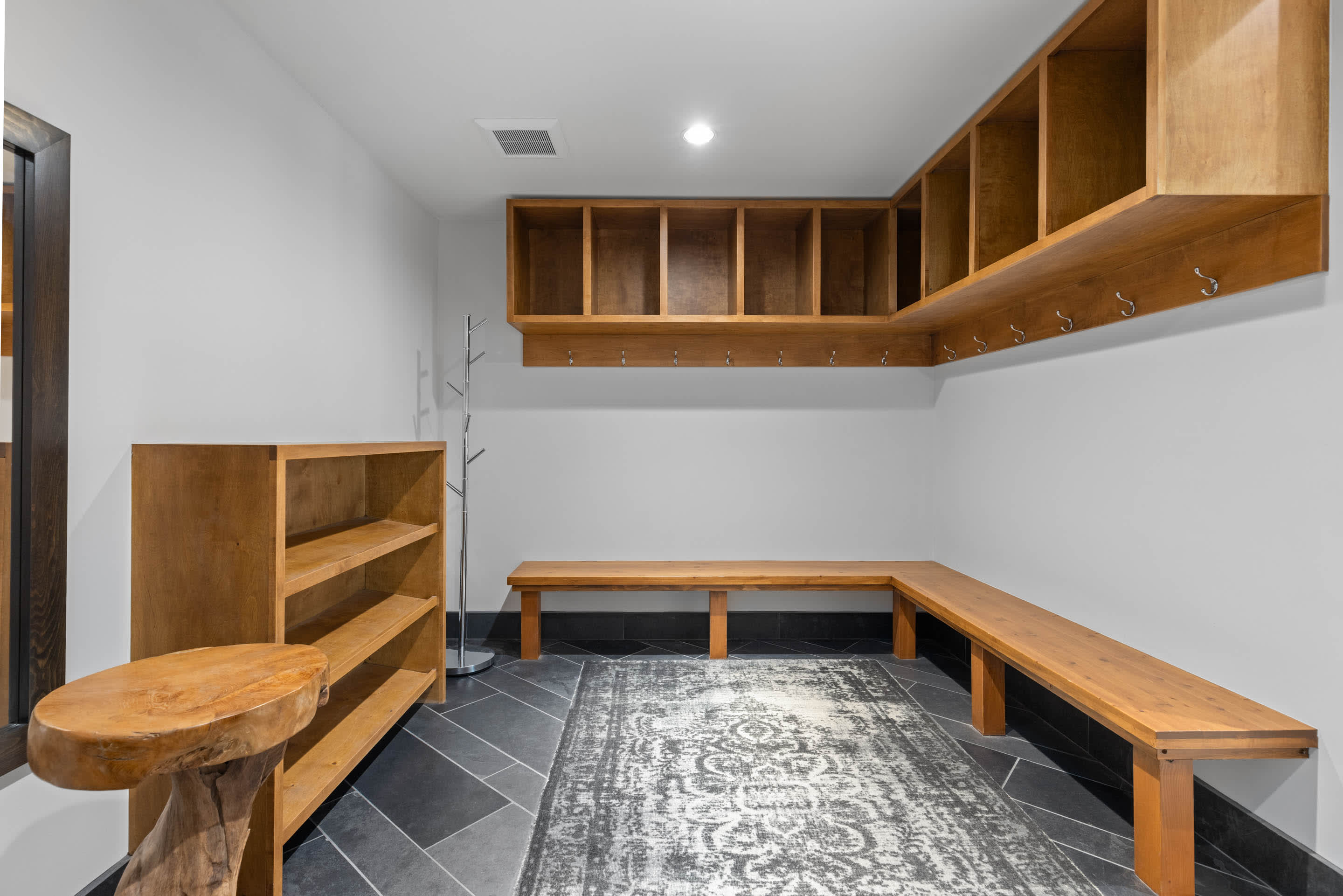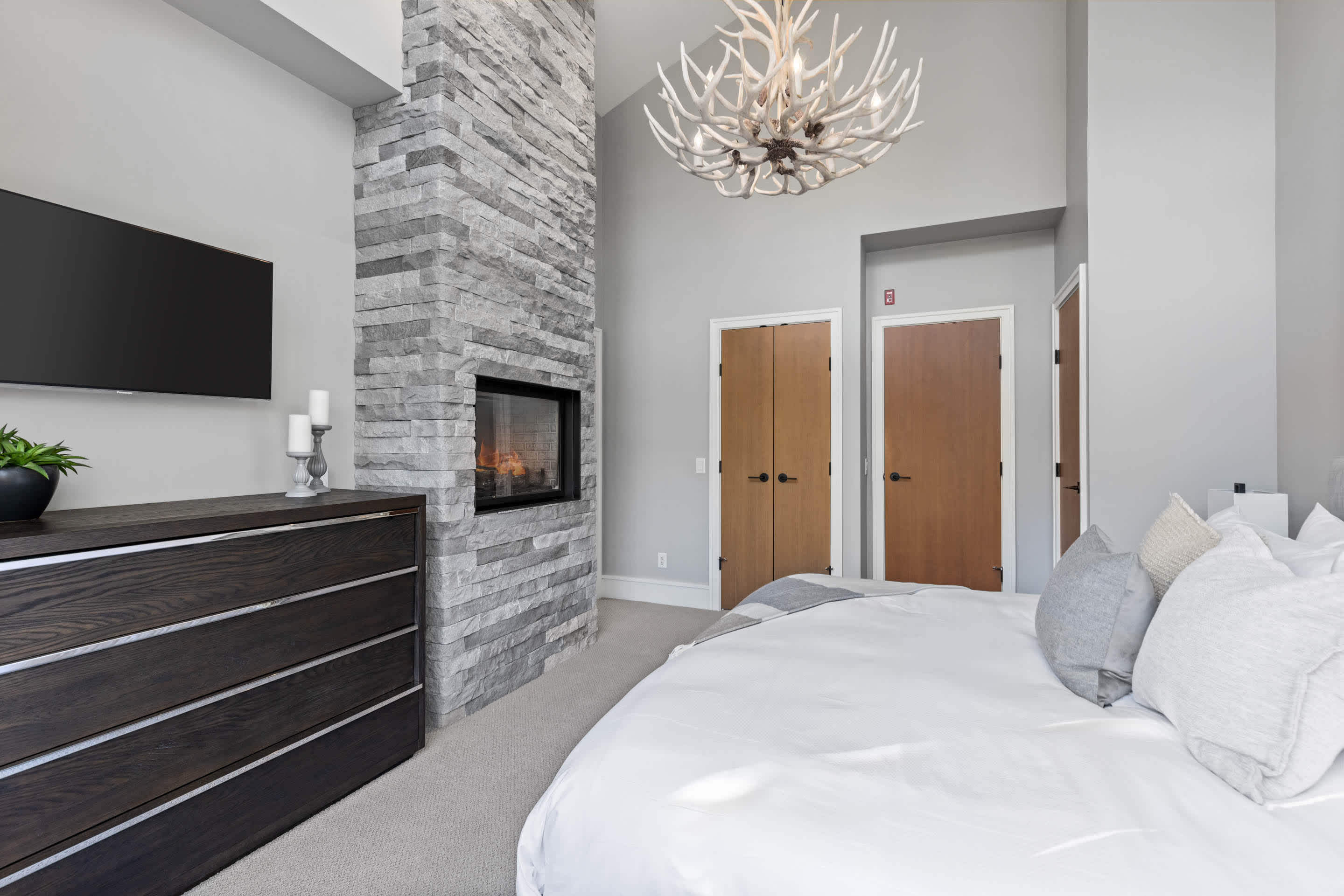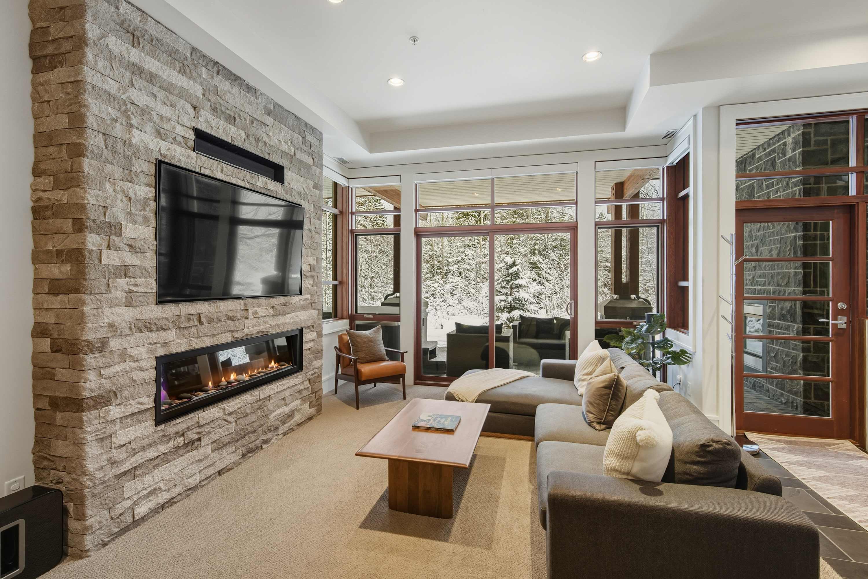 A second living area on the lower level creates a relaxed spot for movie nights or downtime, complete with a wet bar and comfortable seating. Whether you’re watching a game or winding down after skiing, it’s an easy space to settle in.
