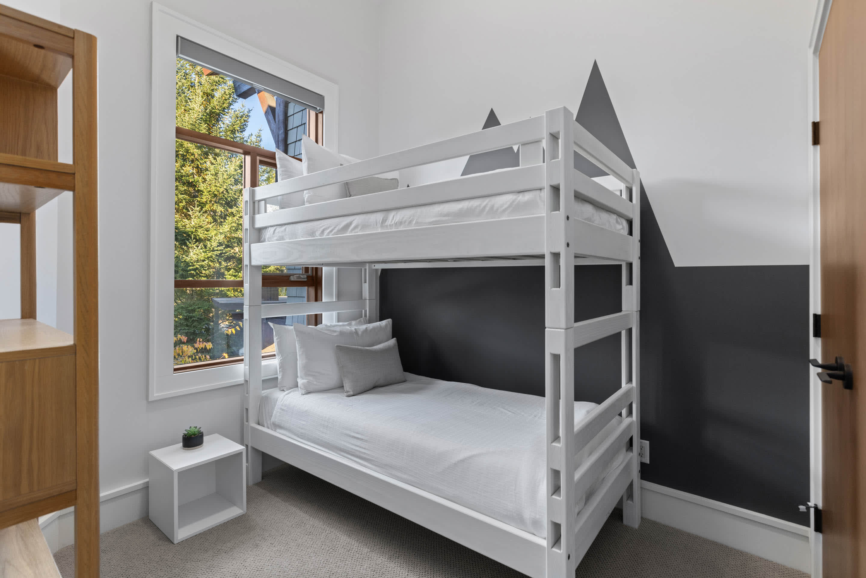 The upper level is home to the primary suite, where you’ll find a king bed, private balcony, and an ensuite bathroom with a double vanity, soaker tub, and glass-enclosed shower. Two additional bedrooms on this level include a queen bed with mountain views and a twin bunk bed, served by a shared bathroom with a shower-over-tub. On the lower level, a fourth bedroom with a queen bed offers extra privacy, along with a nearby bathroom featuring a glass-enclosed shower.