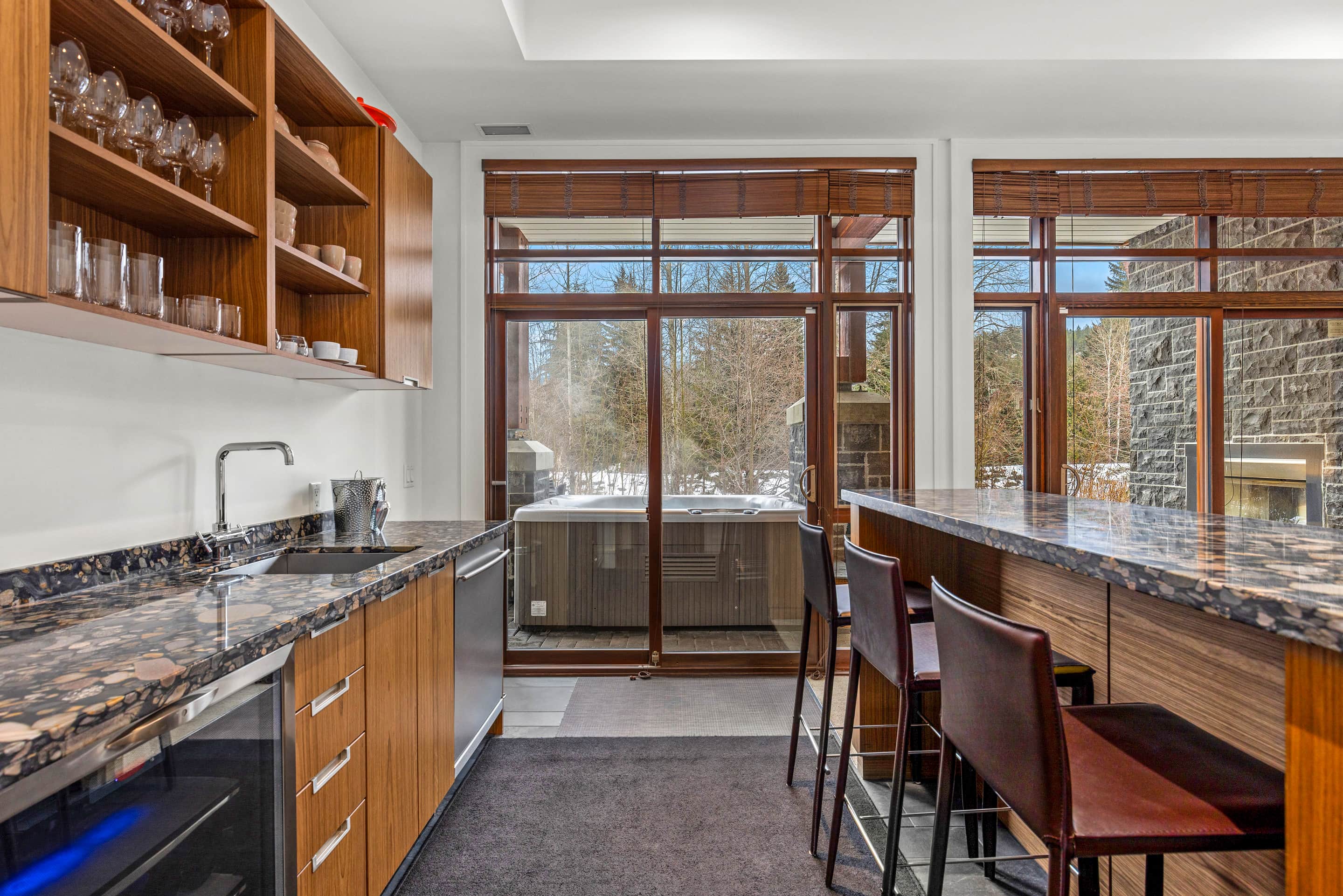 The main level features an airy, open layout with high ceilings and a wood-burning fireplace as the focal point of the main living space. Whether you’re reading, enjoying dinner together, or relaxing with entertainment after skiing or hiking, the space accommodates it all comfortably. The lower level includes an additional lounge that functions as a media room complete with a wet bar - perfect for film evenings or peaceful downtime.