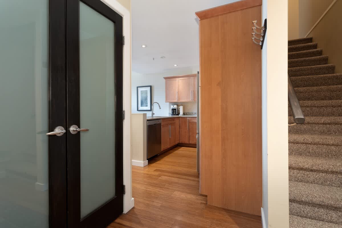 A private balcony offers a fresh breath of winter air, with nearby paths connecting you to Upper Village cafes, forested walking routes, and the Fitzsimmons path that leads to Whistler Village in about ten minutes on foot. Lake access is available via a nearby path or dock, offering a quiet outdoor element even in the colder months.