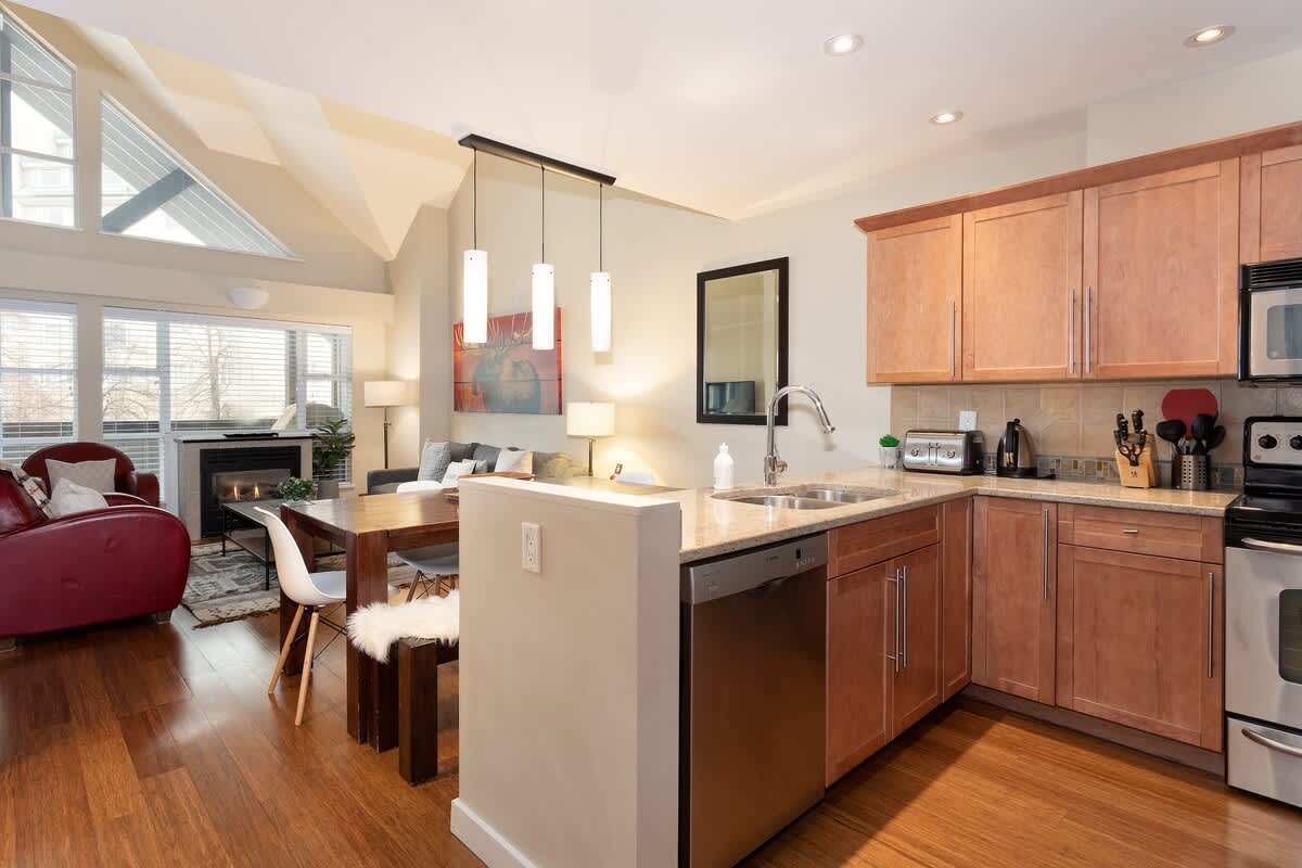 The kitchen provides everything needed for preparing simple meals, with an open flow that keeps cooking and dining naturally social. Whether you're fueling up before heading toward the Blackcomb Gondola or returning from the cold, the setup supports relaxed mornings and easy evenings.