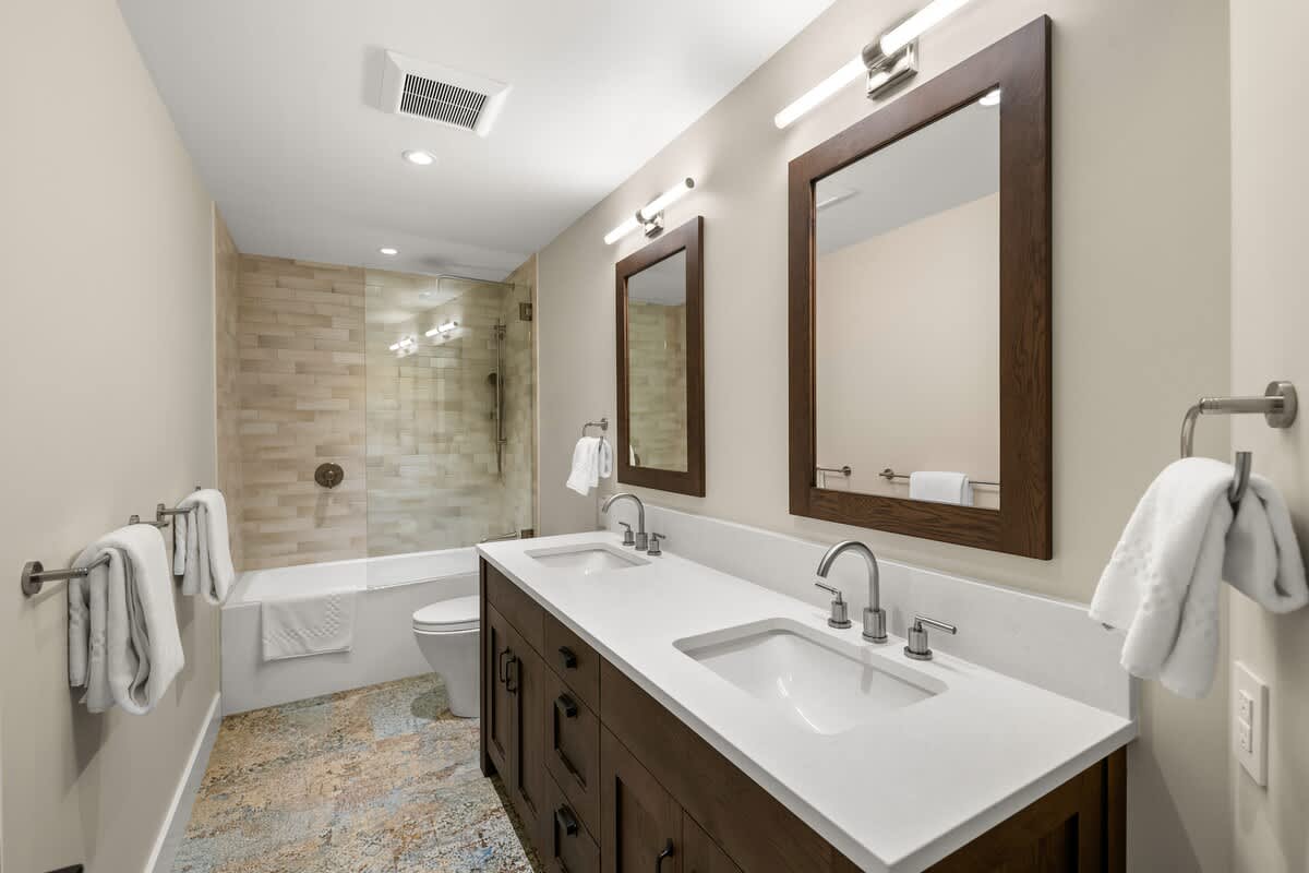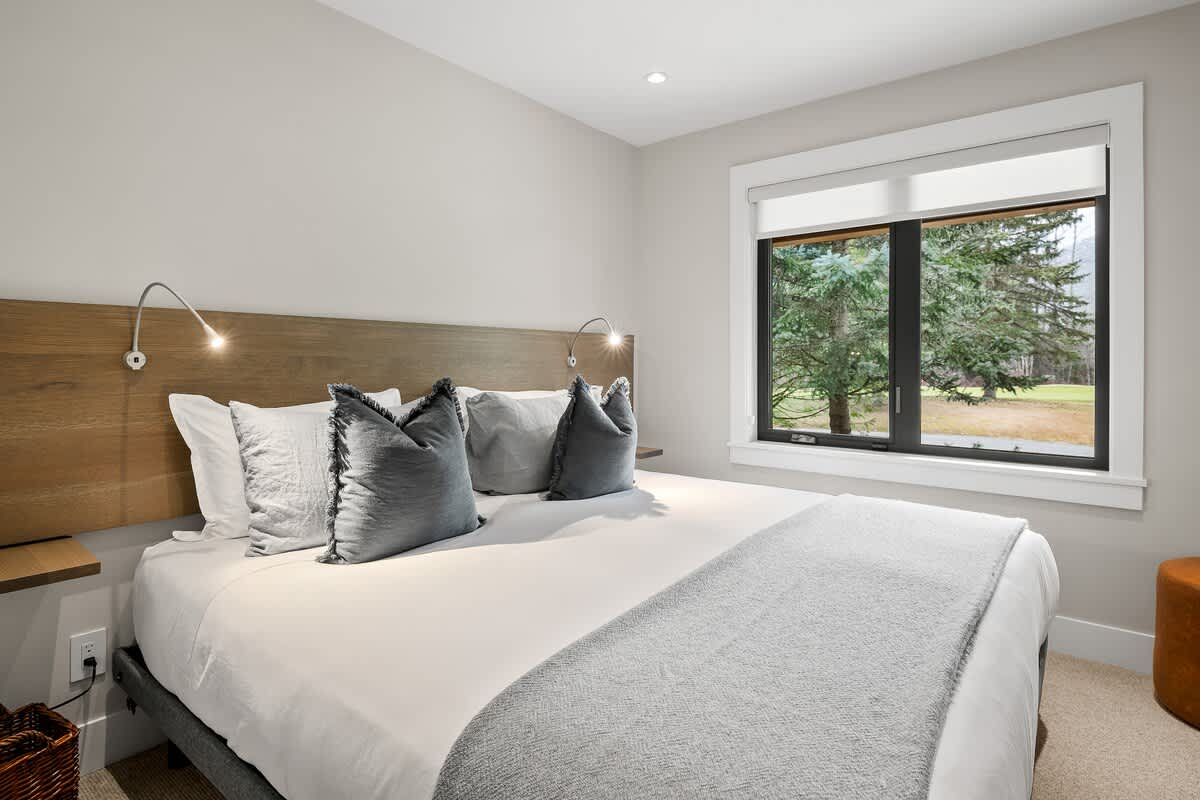 The home sleeps 10 across five bedrooms. On the lower level, the primary suite includes a king bed, TV, desk, and an ensuite with a deep soaker tub, glass-enclosed shower, and double vanity. A second bedroom offers a queen bed, while the third and fourth bedrooms each feature a king split bed that can be arranged as one king or two twin beds. The fifth bedroom, located on the main level, includes a queen bed, its own ensuite bathroom, and access to the BBQ deck. A powder room adds extra convenience.
