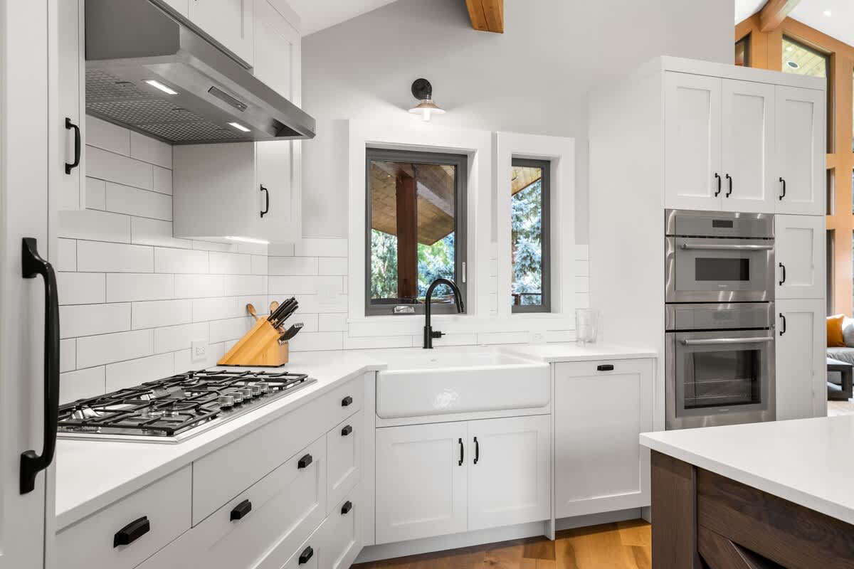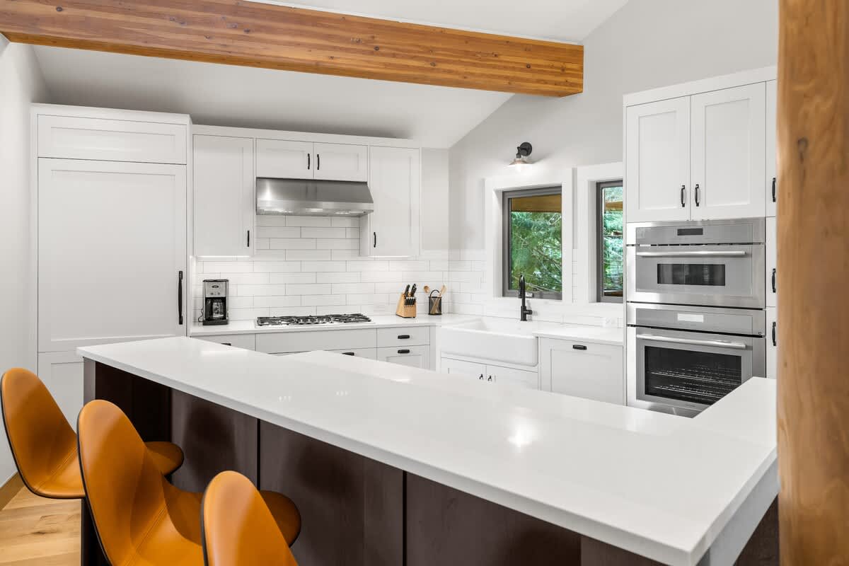 The fully equipped kitchen is set up for shared meals and easy evenings at home, featuring a 6-burner gas range and double ovens. Enjoy casual mornings at the breakfast bar or come together at the dining table with seating for eight. Cooking and dining essentials are provided, making it simple to settle in for longer stays.