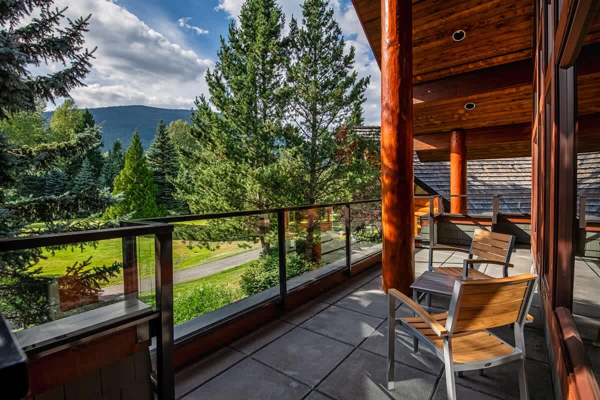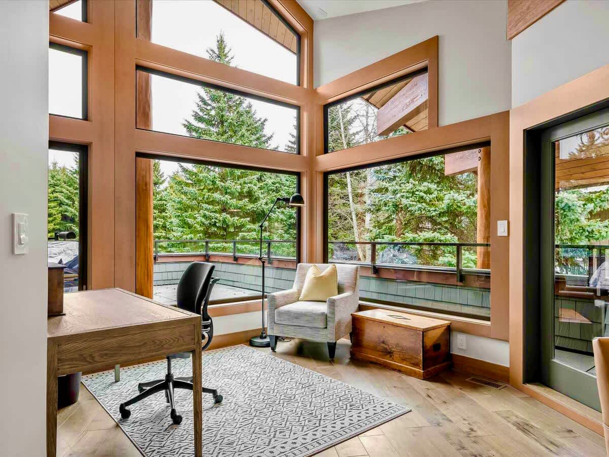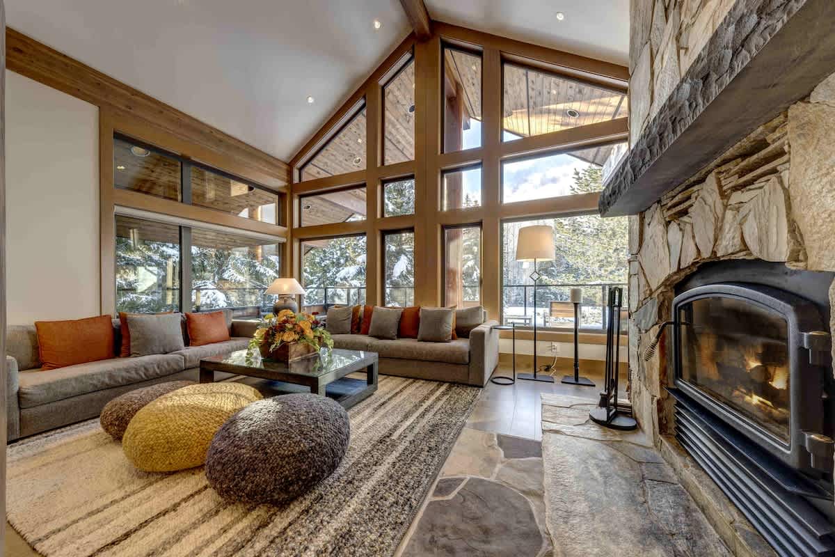 Glacier View Chalet offers spacious open-concept gathering areas designed for families and groups. Two distinct lounges create space to relax in different ways - one with a wood-burning fireplace and sweeping views, and another with a Smart TV and a dedicated workspace. Vaulted ceilings, floor-to-ceiling windows, in-floor heating, and air conditioning keep the home comfortable in every season.