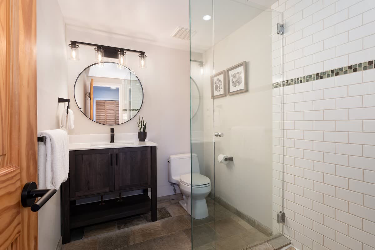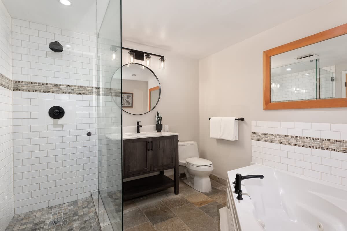The main-level primary bedroom includes a queen bed, TV, and direct access to the deck. Its en-suite bathroom features a jetted bath, glass-enclosed shower, single vanity, and a second entrance from the hallway. Upstairs, a secondary bedroom with a queen bed offers its own balcony and en-suite bathroom with a glass-enclosed shower. Two additional upper-level bedrooms include one with a king-split bed and another with a twin bunk bed and desk, both served by a shared bathroom with a single vanity and glass-enclosed shower.