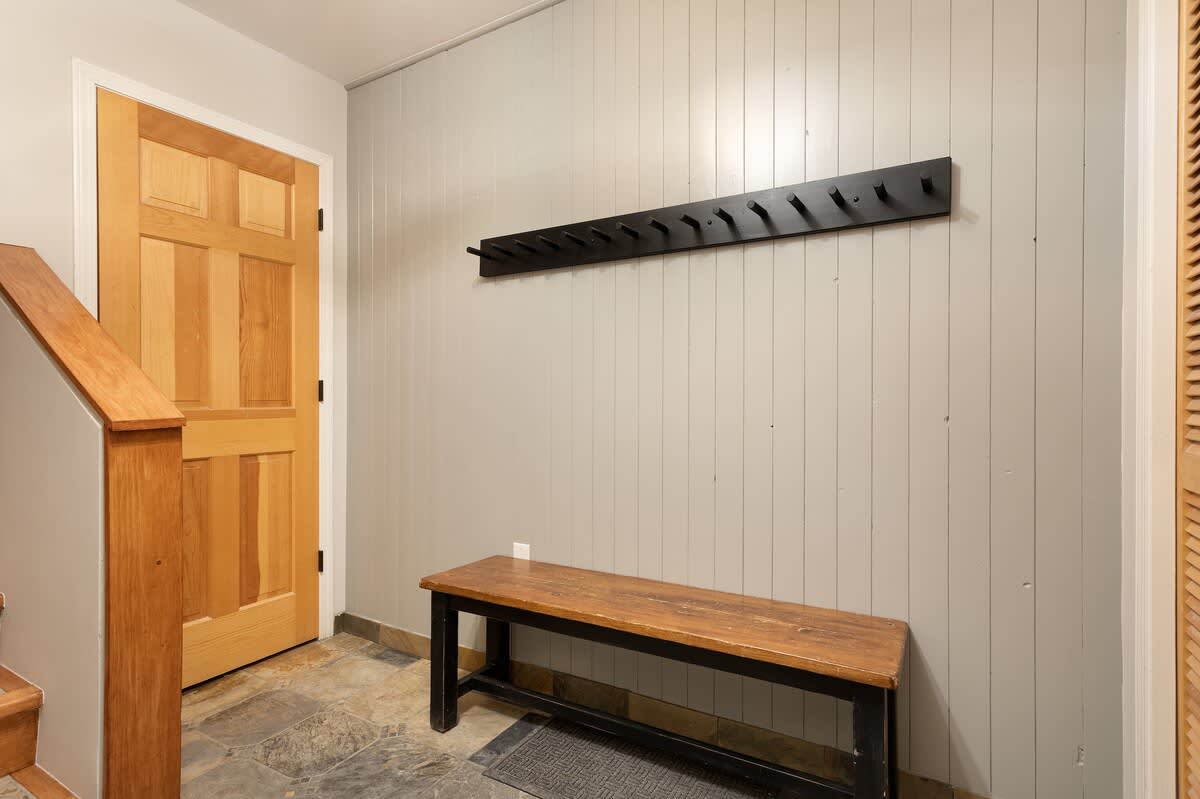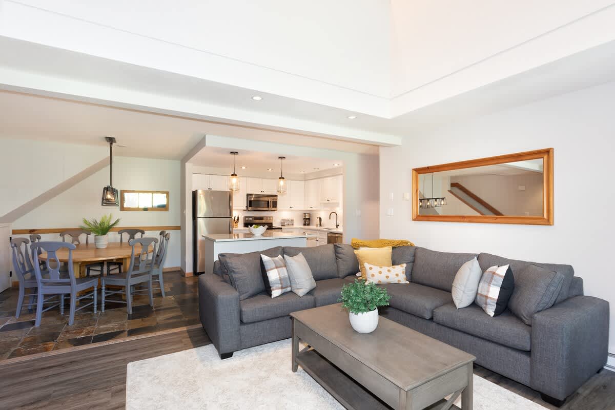 The main level brings everyone together with an open-concept layout, vaulted ceilings, and large windows that frame the winter landscape. You can stretch out on the sectional couch, watch TV, or simply enjoy the warmth of the indoor fireplace after time outdoors. A small deck extends off the living area for moments of fresh air, while the lower-level mudroom provides practical storage for winter gear and easy transitions in and out of the home.