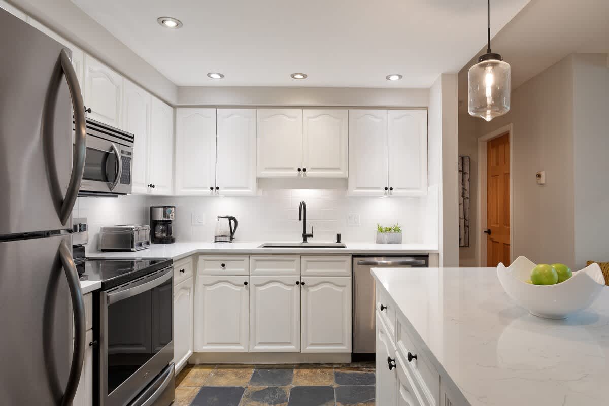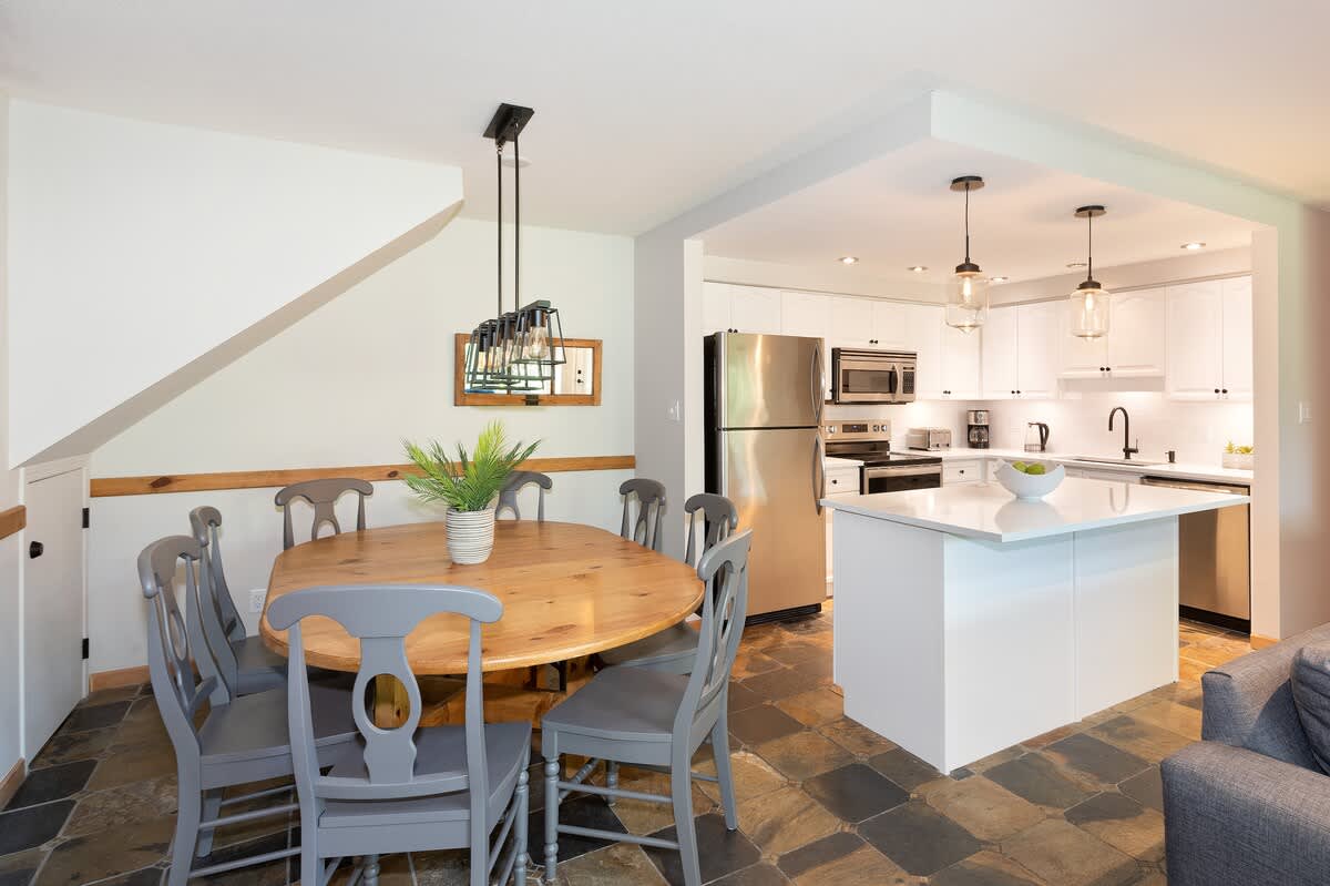 A kitchen equipped for everyday cooking allows you to prepare meals at your own pace, complete with marble counters, stainless steel appliances, and a breakfast bar that connects naturally with the living room. The dining table seats eight, making it easy to gather for shared meals before relaxing into the evening. In-suite laundry adds convenience for longer stays or winter layering.