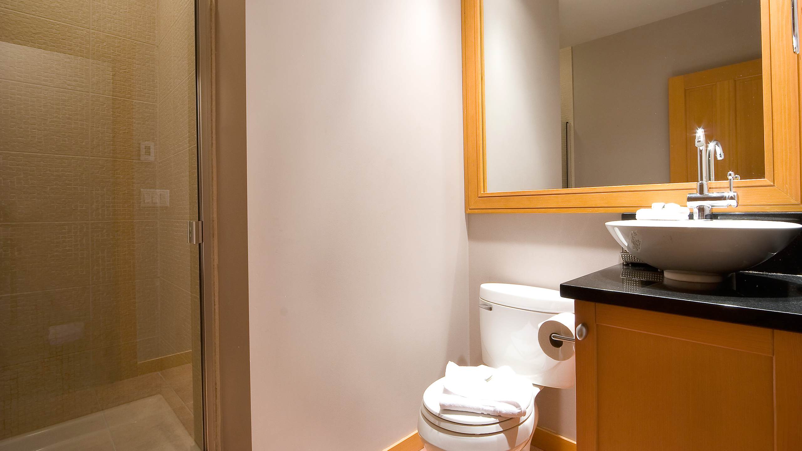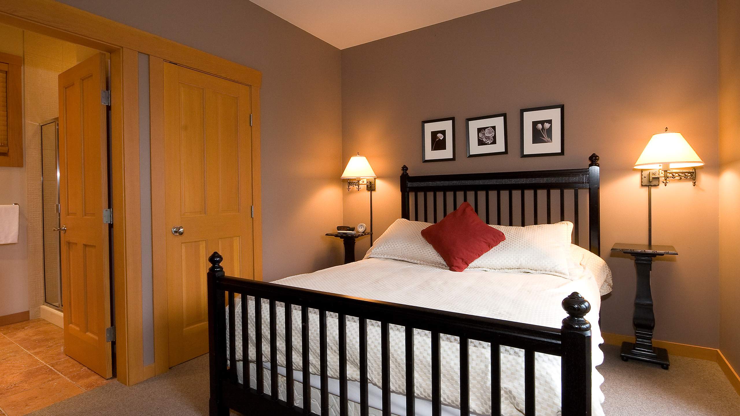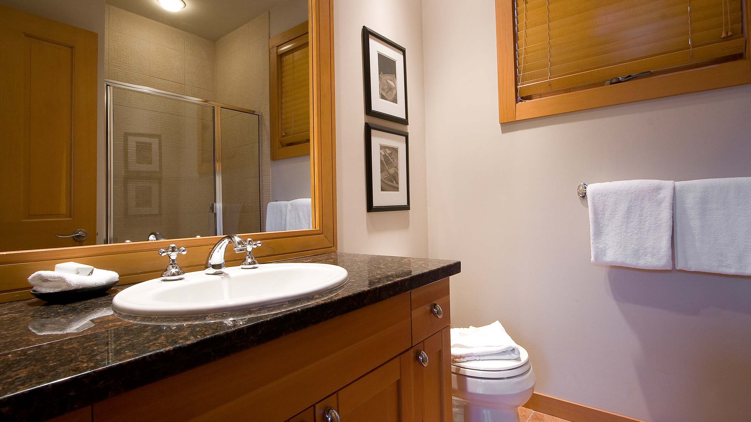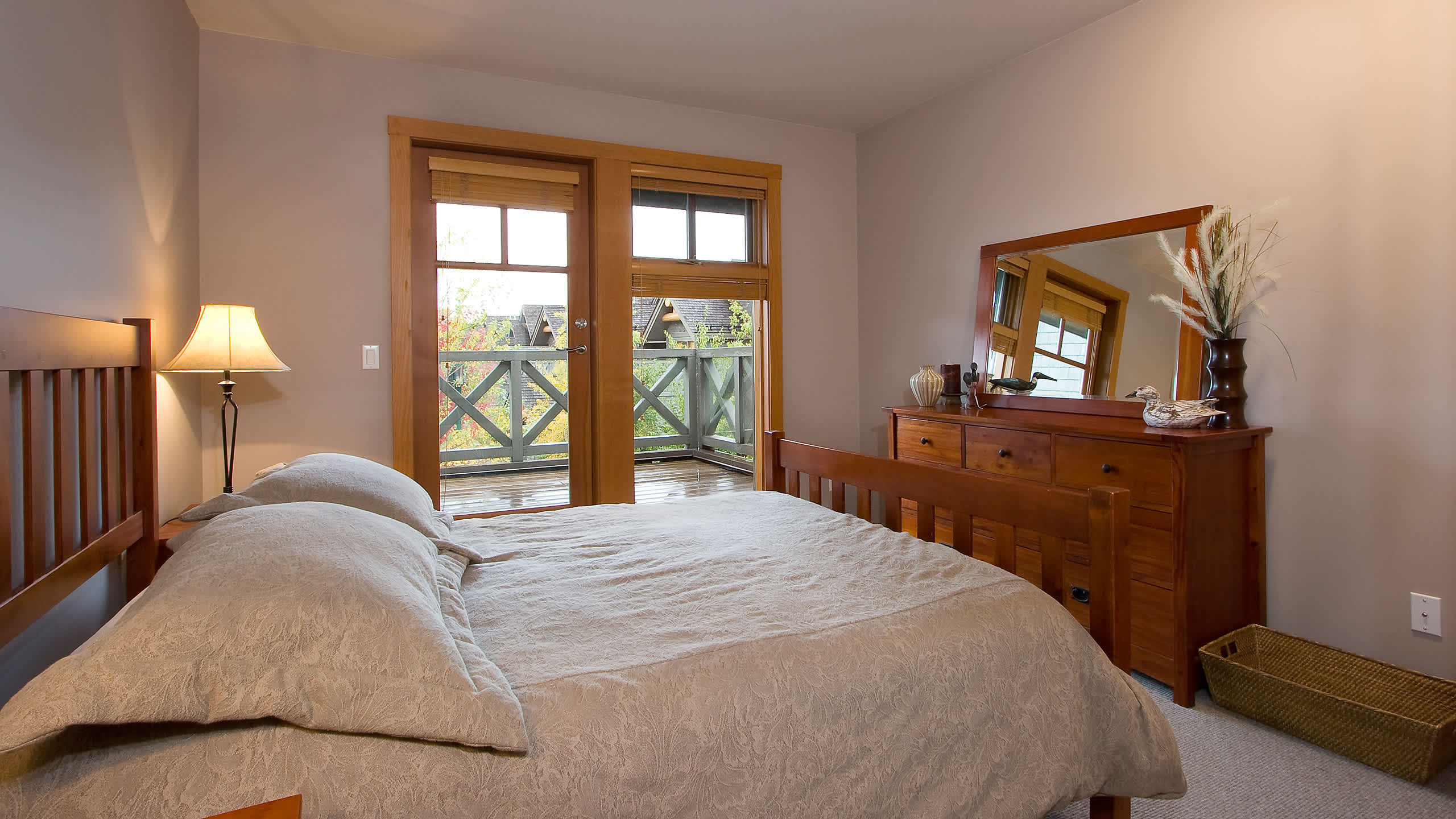 This two-level townhome accommodates up to eight guests across four bedrooms. The upper level features the primary bedroom with a king bed, fireplace, TV with cable, and a private balcony. Its ensuite includes a double vanity, deep-soaking tub, a glass-enclosed shower, and heated floors. Also upstairs are two additional bedrooms, each with a double bed and direct access to the hot tub. Both offer private ensuites, one with a glass-enclosed shower and the other with heated floors and a bathtub-shower combo. On the main level, a fourth bedroom offers a queen bed, TV, and patio access, along with an ensuite featuring heated floors and a glass-enclosed shower. A powder room adds extra convenience on this floor.