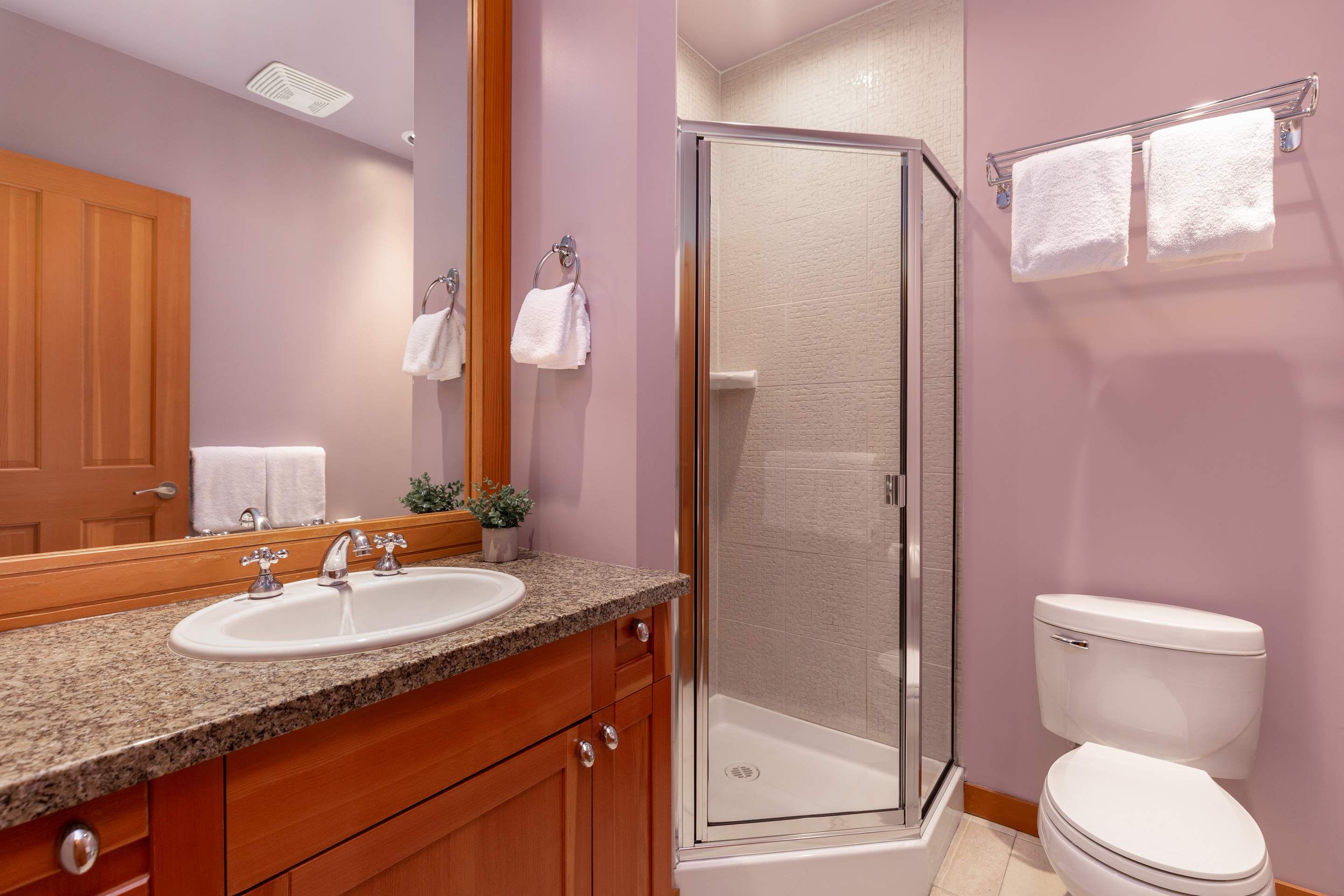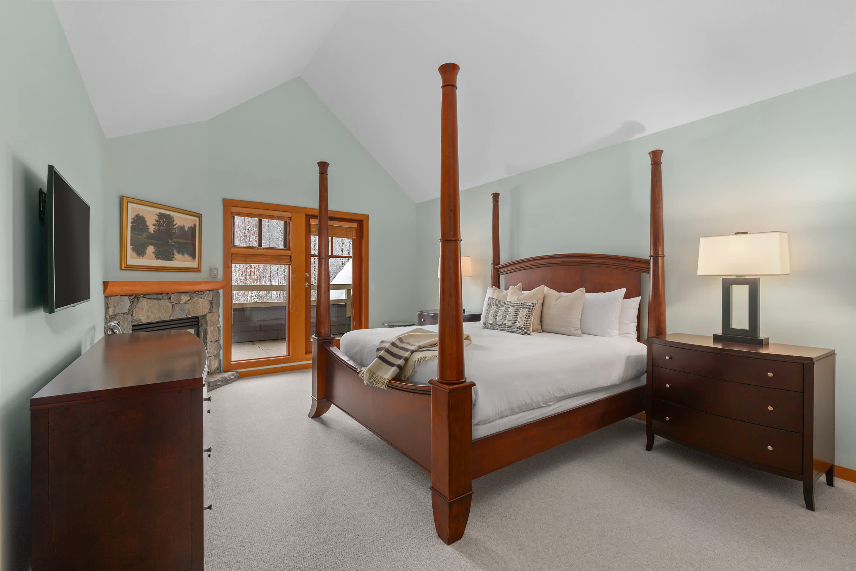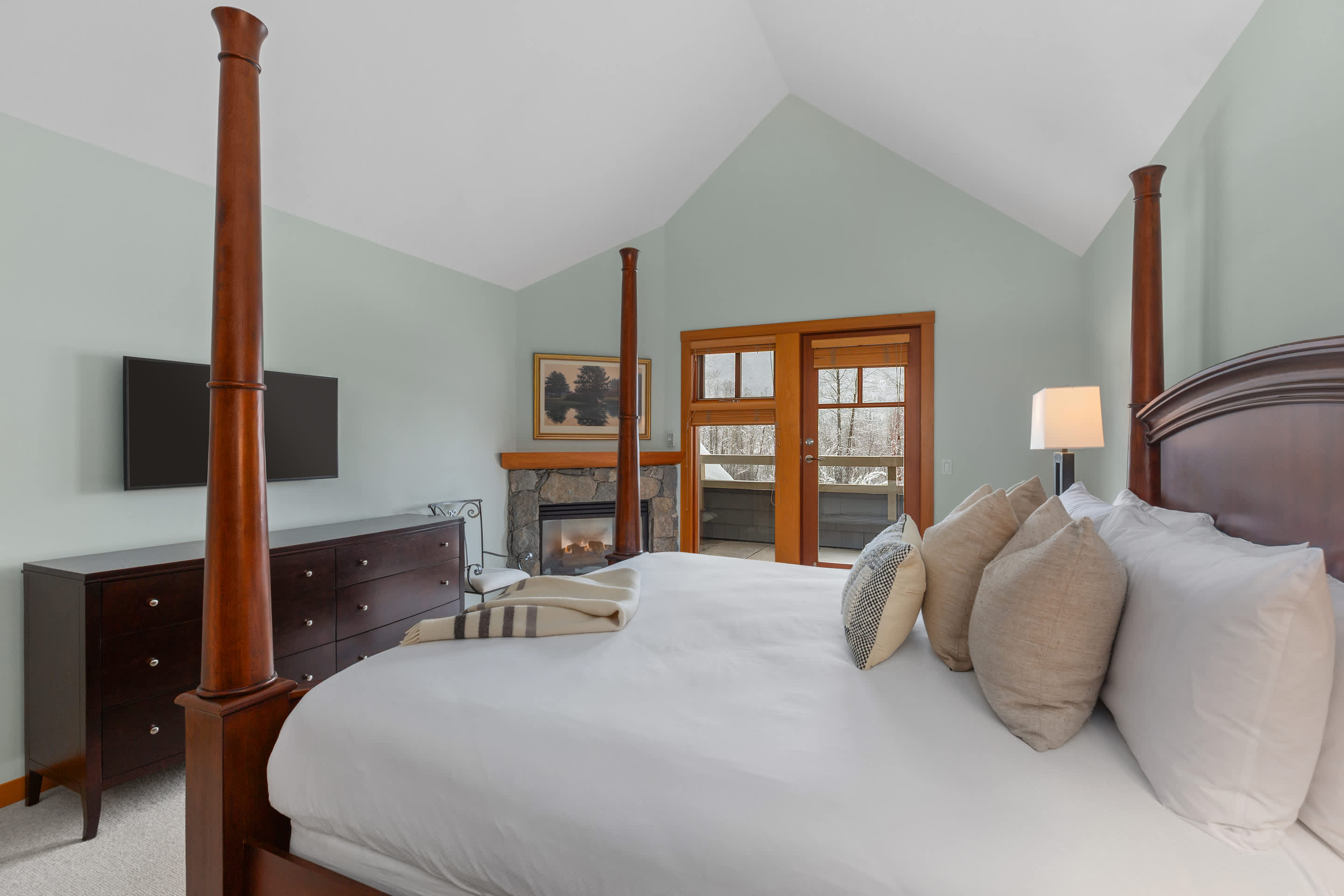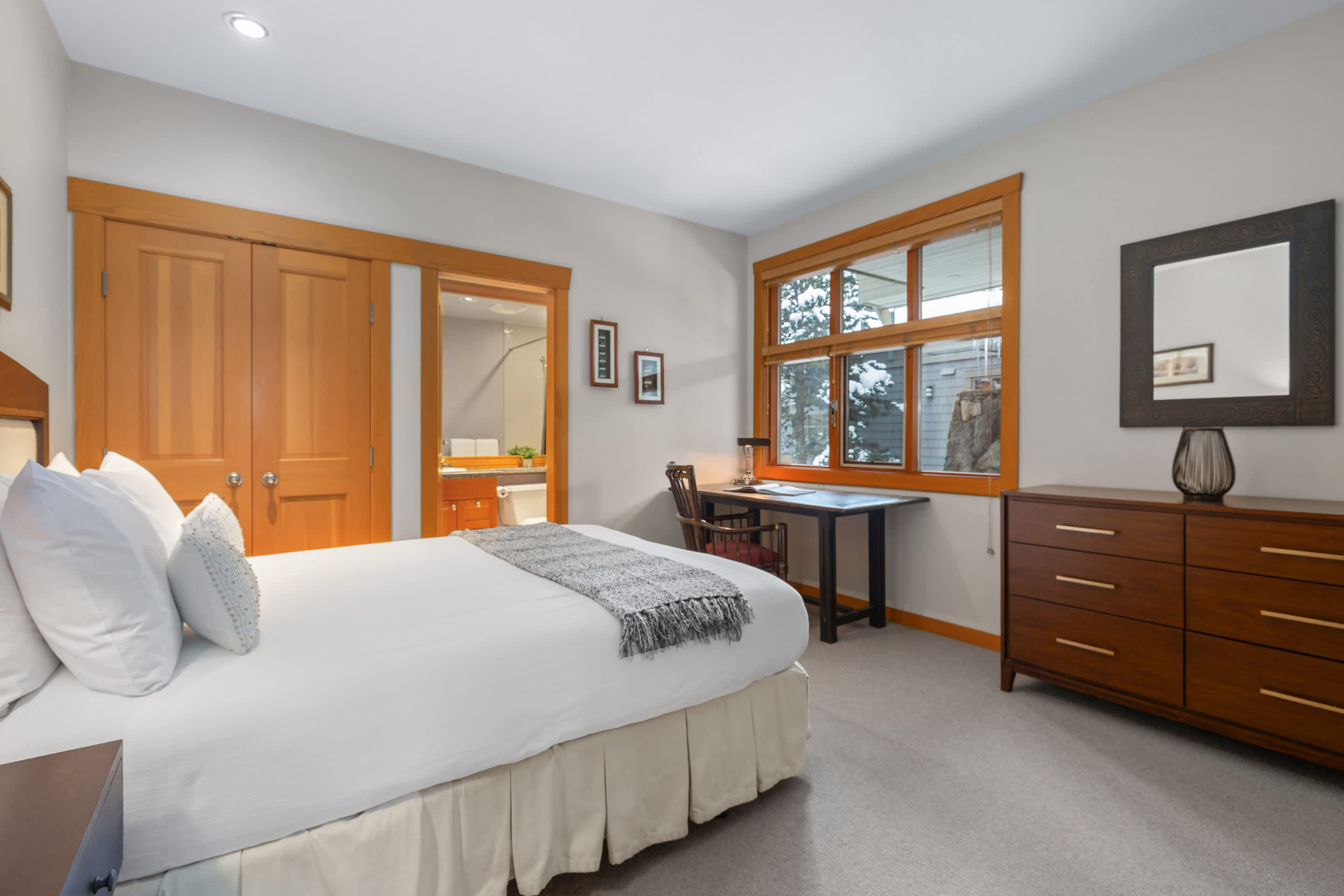 Four bedrooms comfortably host up to eight guests. Upstairs, the primary bedroom includes a king bed, fireplace, a private balcony overlooking Green Lake, and an ensuite with a double vanity, deep soaking tub, and glass-enclosed shower. The second bedroom offers a queen bed beside a full bathroom with a walk-in shower. The third bedroom features a king-split bed that can convert into two twins, with its own ensuite and a bathtub-shower combo. On the main level, the fourth bedroom includes a queen bed, a desk, and a private ensuite, with an additional powder room nearby.