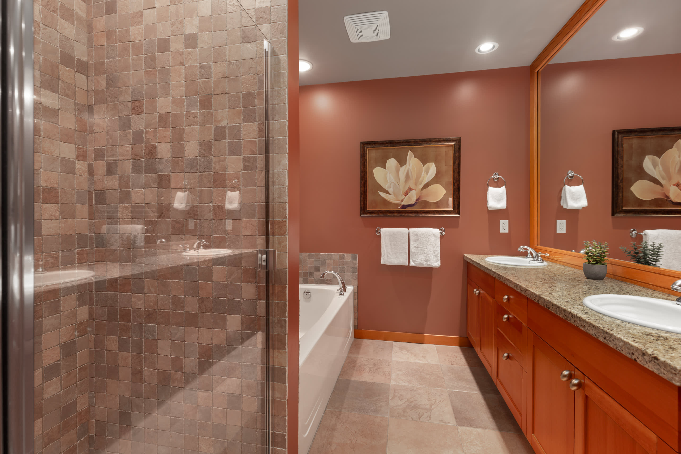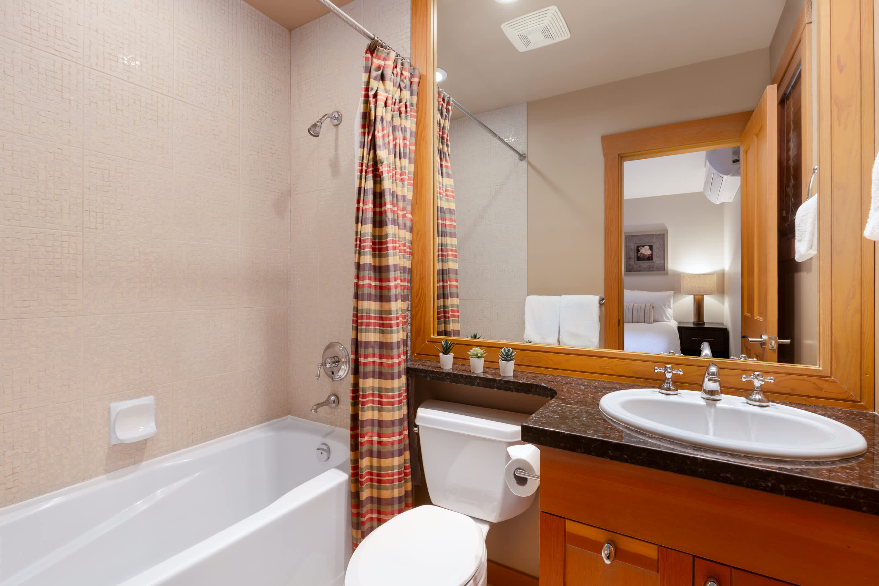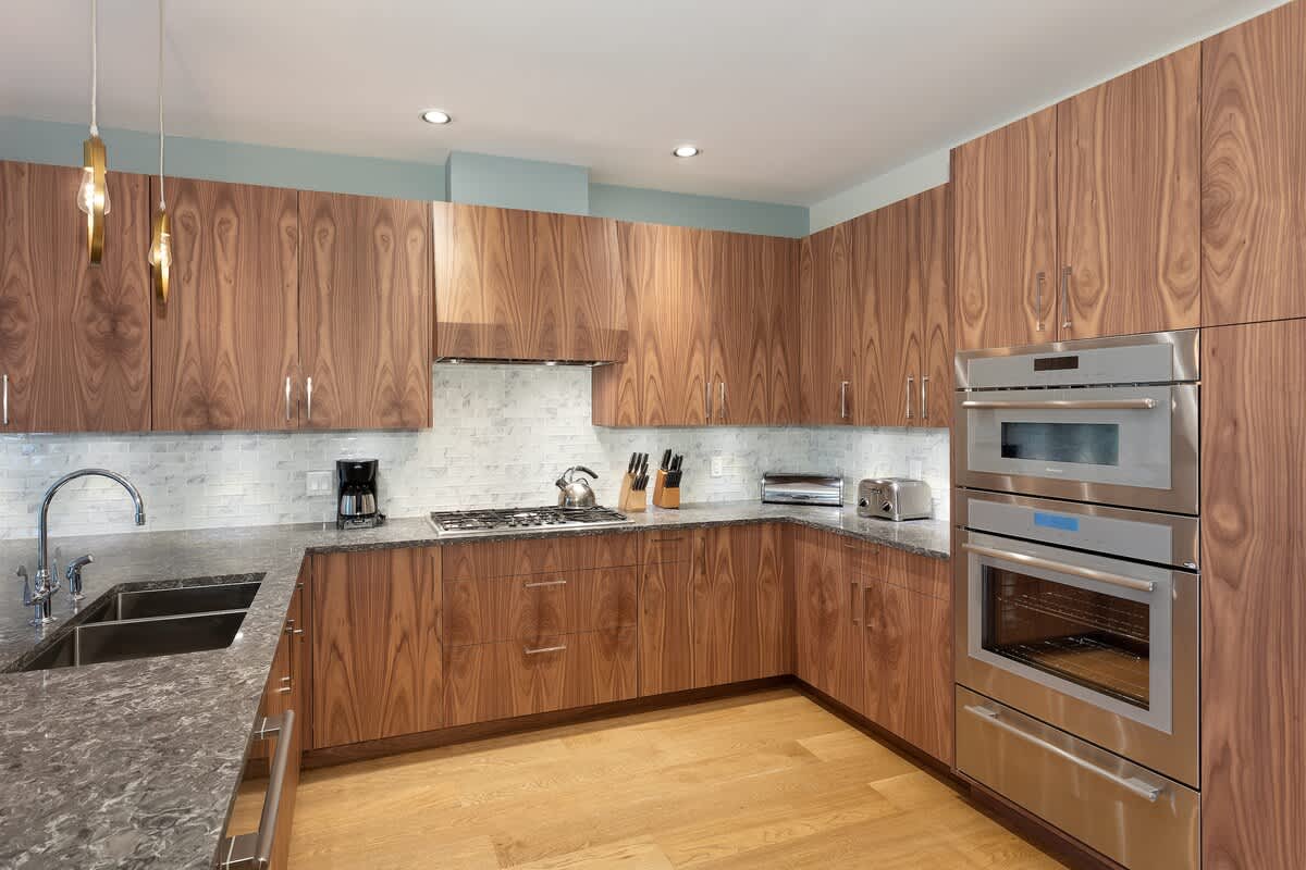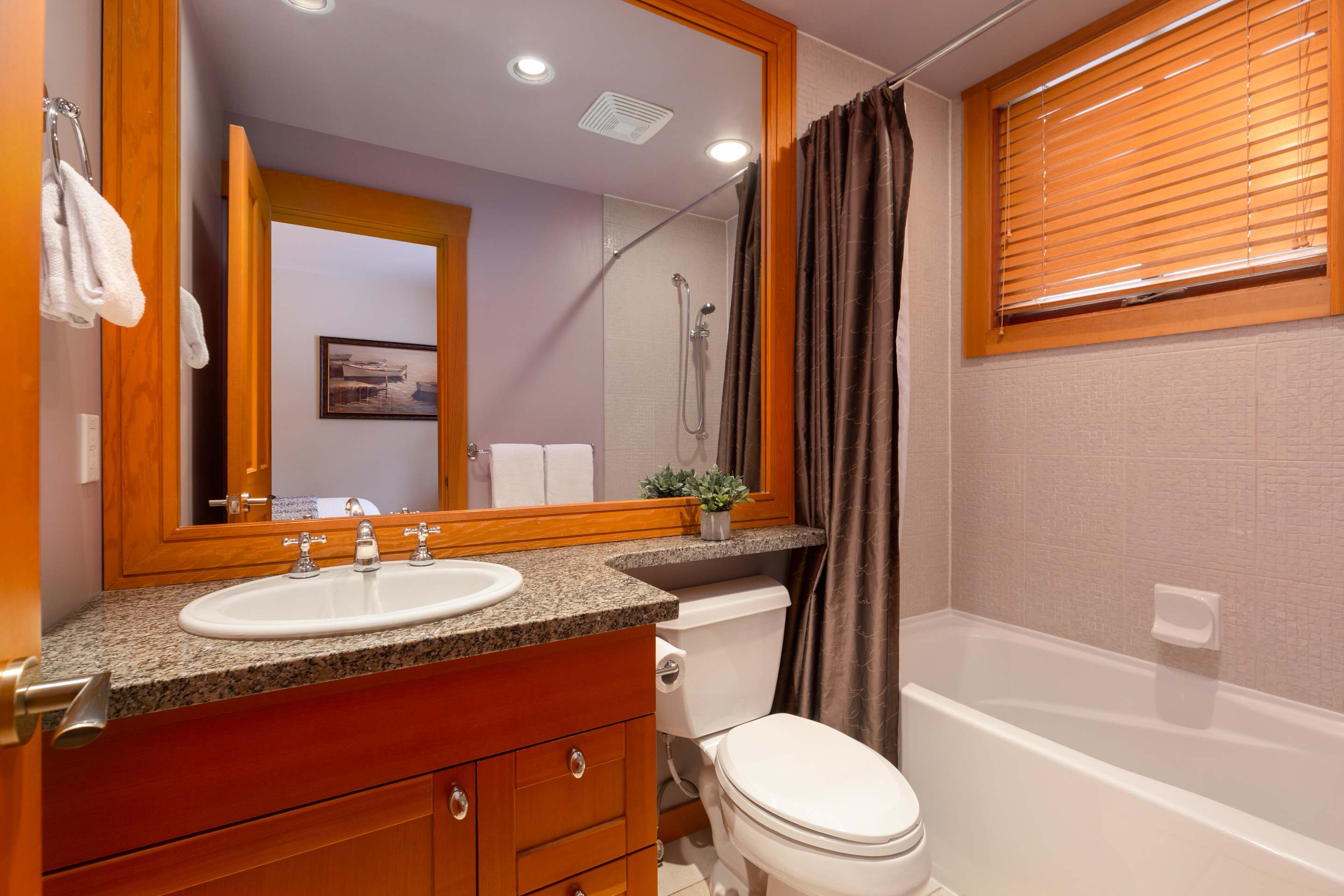 Four bedrooms comfortably host up to eight guests. Upstairs, the primary bedroom includes a king bed, fireplace, a private balcony overlooking Green Lake, and an ensuite with a double vanity, deep soaking tub, and glass-enclosed shower. The second bedroom offers a queen bed beside a full bathroom with a walk-in shower. The third bedroom features a king-split bed that can convert into two twins, with its own ensuite and a bathtub-shower combo. On the main level, the fourth bedroom includes a queen bed, a desk, and a private ensuite, with an additional powder room nearby.