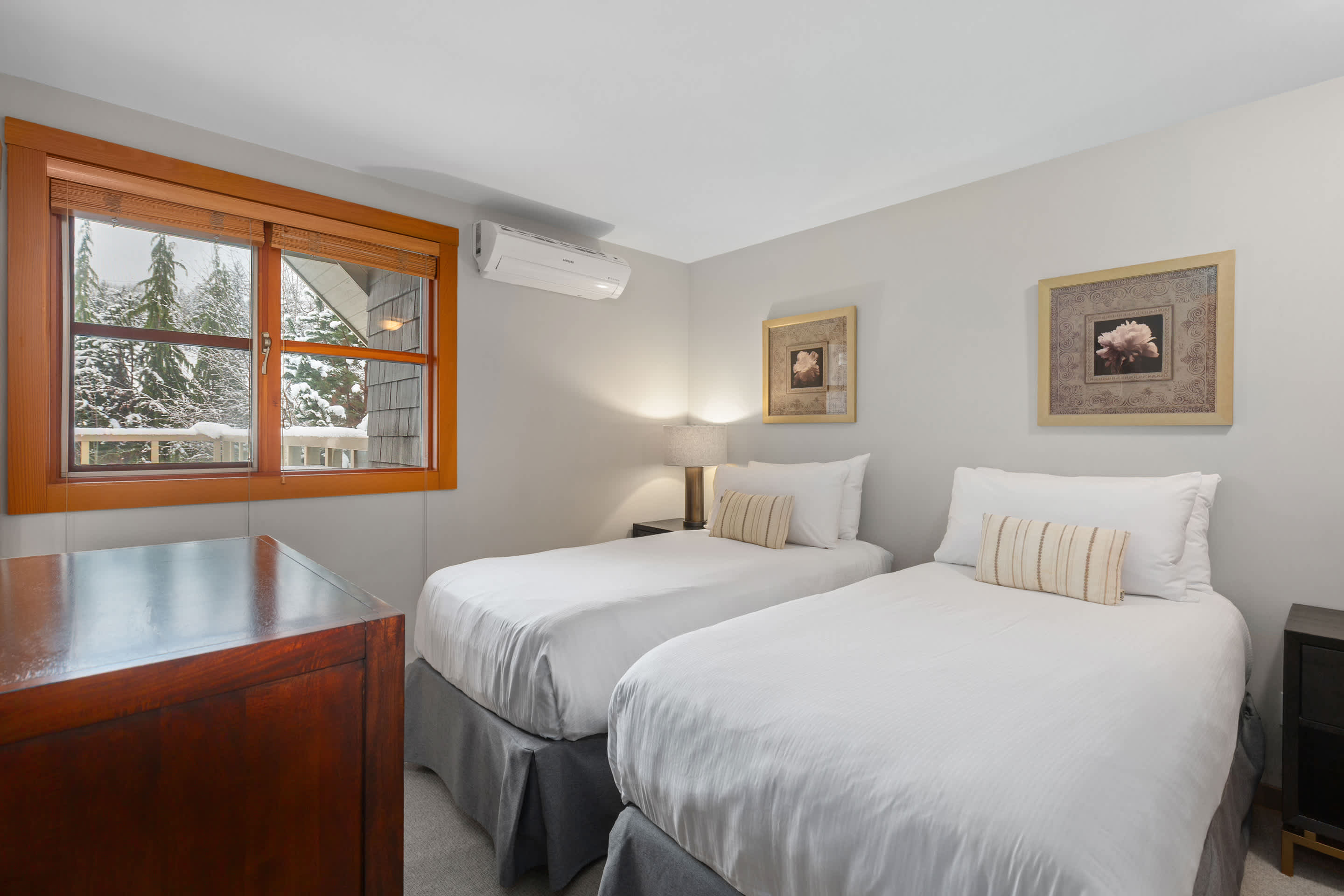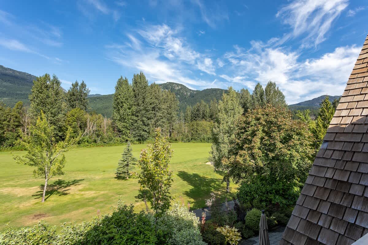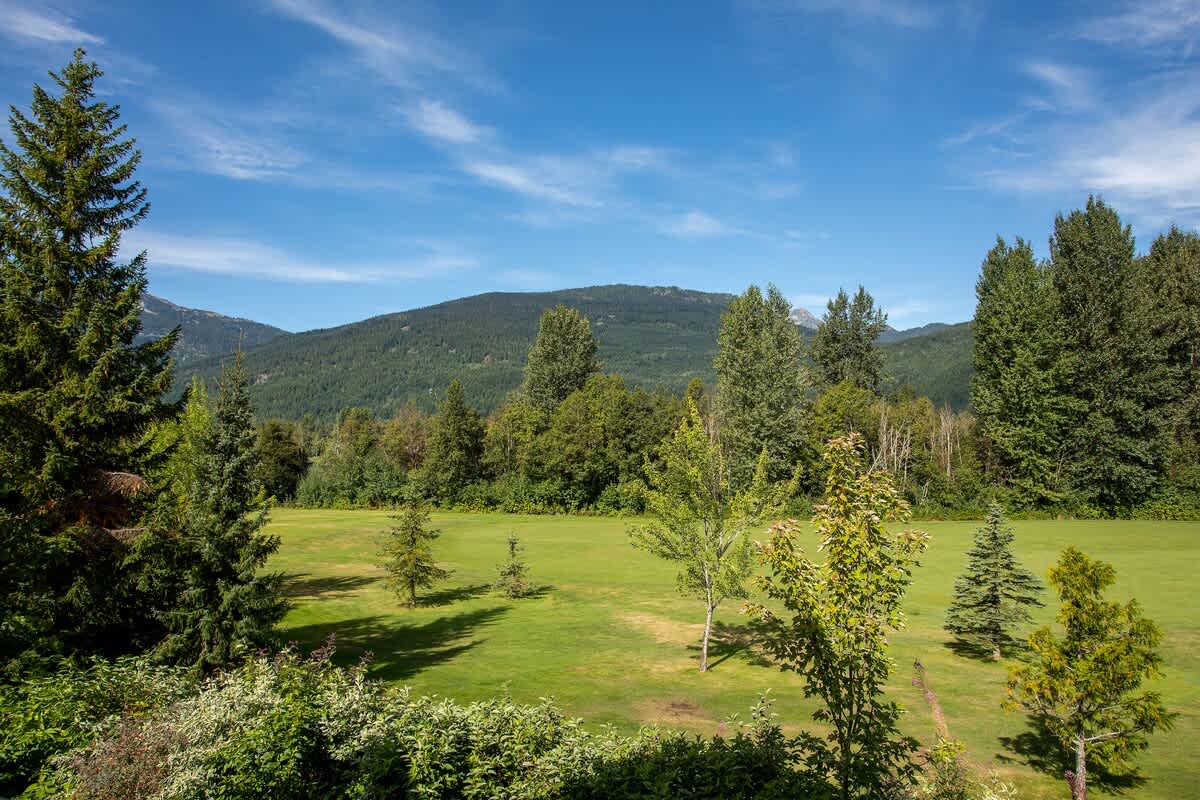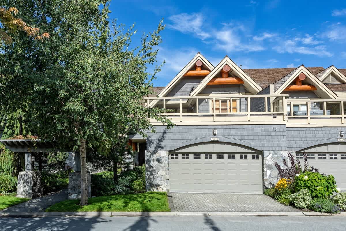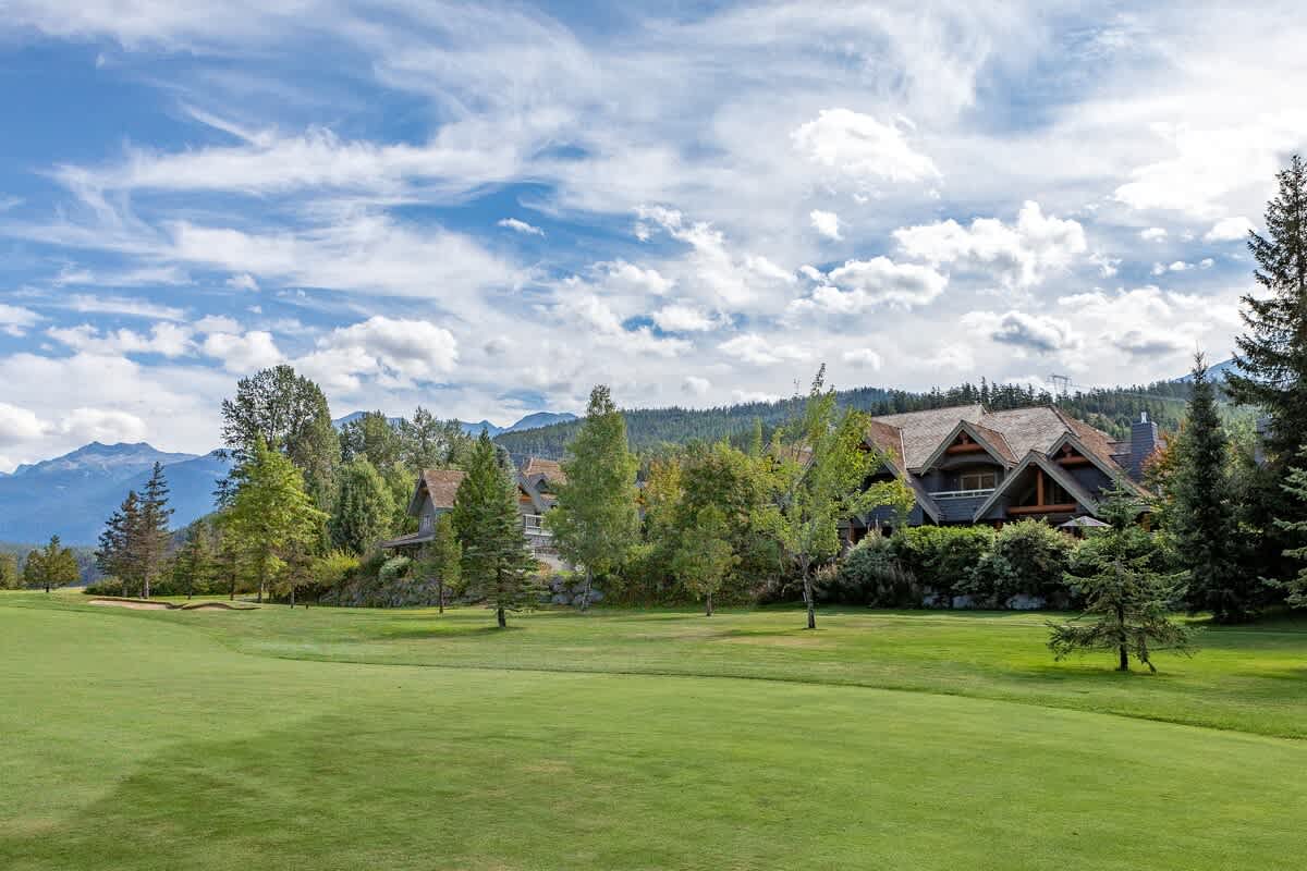 Goldenwood 8337 is a bright two-story townhouse set along the 16th fairway of Nicklaus North Golf Course, just a short 7-minute drive from Whistler Village and the base of the mountains. Renovated in December 2019, the open-concept main level features vaulted ceilings, exposed log beams, warm hardwood floors, and expansive windows framing views of Whistler and Blackcomb. Air conditioning runs throughout, creating a comfortable retreat after a day outdoors.