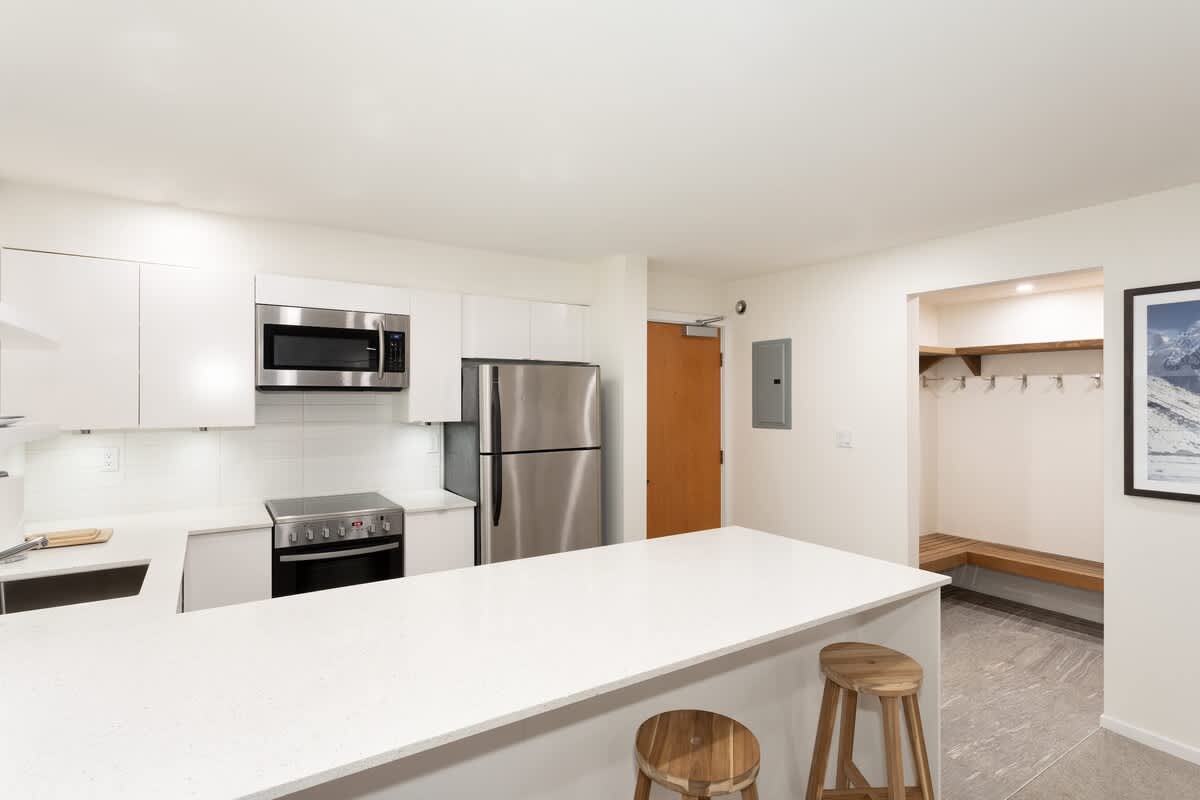 Stainless-steel appliances and granite counters equip the kitchen for preparing everything from quick breakfasts to relaxed evening meals. A breakfast bar with four stools keeps conversations flowing, and the dining table for six offers space to gather after exploring the village. With a grocery and liquor store located just downstairs, picking up essentials could not be more convenient.