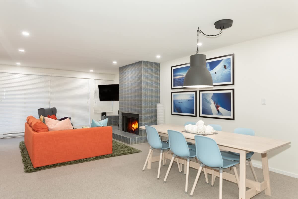 An open-plan living area creates a welcoming place to settle between snowy adventures. A stone-surround Presto log fireplace adds a cozy focal point, while comfortable seating invites you to unwind with a warm drink. Sliding doors lead to the deck, where a private hot tub offers a peaceful retreat after time on the mountain. Heated slate flooring at the entry keeps gear dry, and secured underground parking makes transitions between the village and the slopes simple. High-speed Wifi and a dedicated workspace support guests who need to stay connected during their stay.