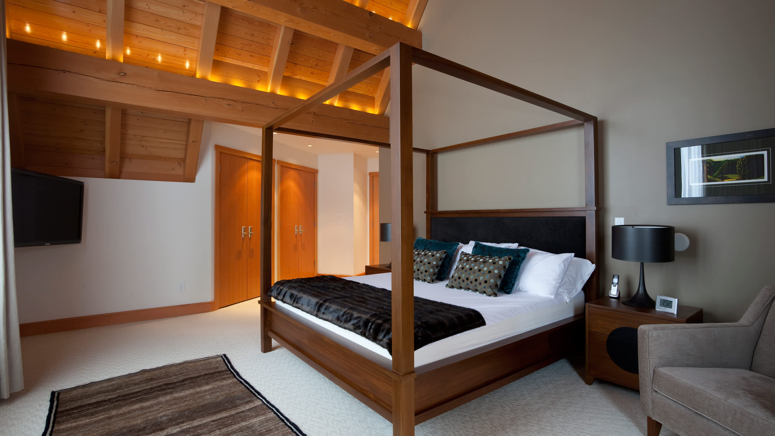 Designed for families and friends to gather in comfort, the home sleeps 10 across 4 bedrooms, 5 beds, and 5.5 baths. On the upper level, the primary suite features a king bed, a sitting area with gas fireplace, and a private deck, along with an ensuite with heated floors, double vanity, soaking bath, and glass-enclosed shower. A second primary includes a four-poster king bed, scenic views, its own private deck, and an ensuite bath with soaking tub and dual vanity. The third bedroom offers a double bed plus a loft with an additional double bed, served by an ensuite with shower. On the main level, a California king bedroom with sitting area connects to a full ensuite, while a nanny room with a single bed and TV has its own ensuite. A guest powder room adds convenience, and the lower level provides an additional bathroom with steam shower.