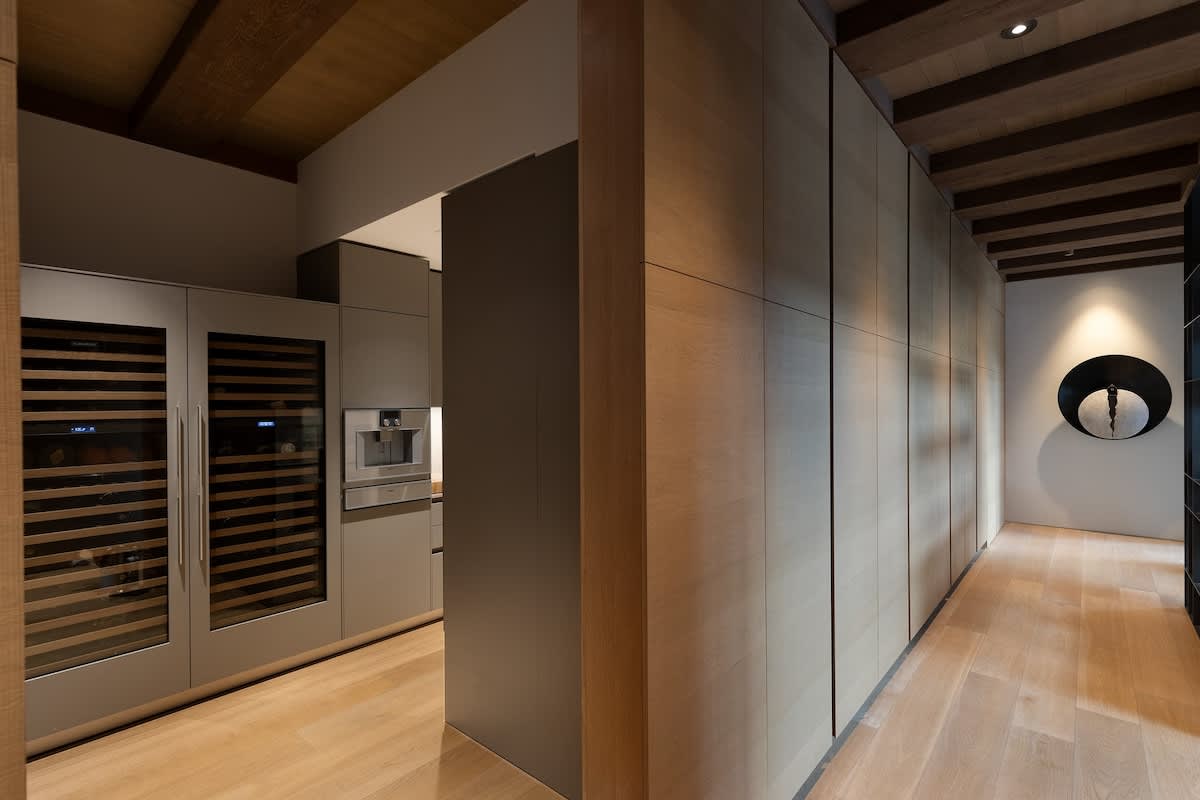 At the center of the home, a kitchen fitted with Gaggenau appliances makes shared meals easy and unhurried. Gather at the wrap-around breakfast bar that seats twelve, or settle in for long dinners at the 12-person dining table. With a scullery kitchen, butler’s pantry, and outdoor BBQ grill, hosting flows naturally from indoors to the terraces.