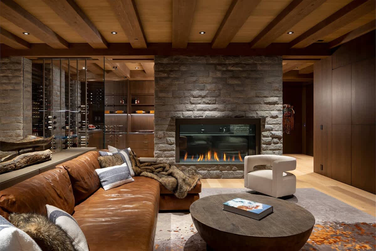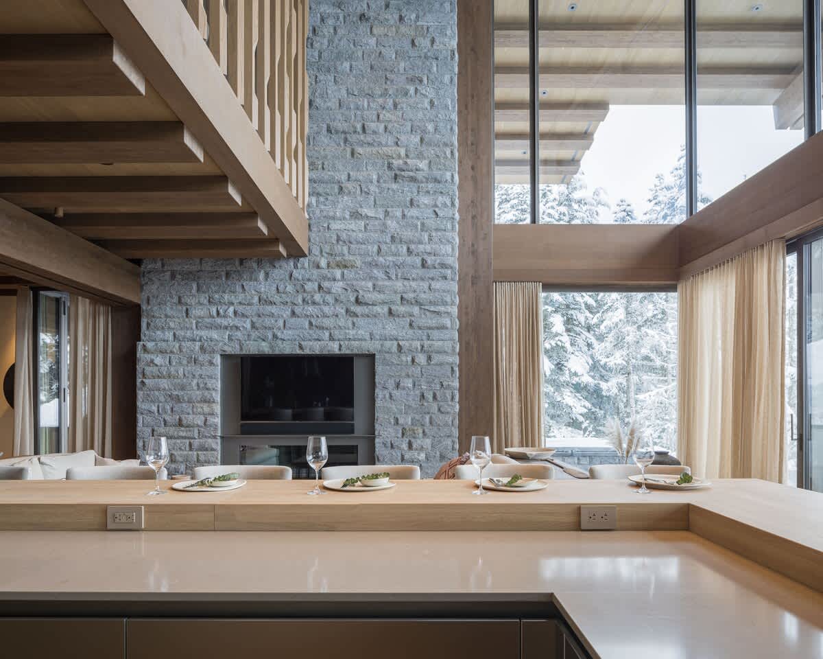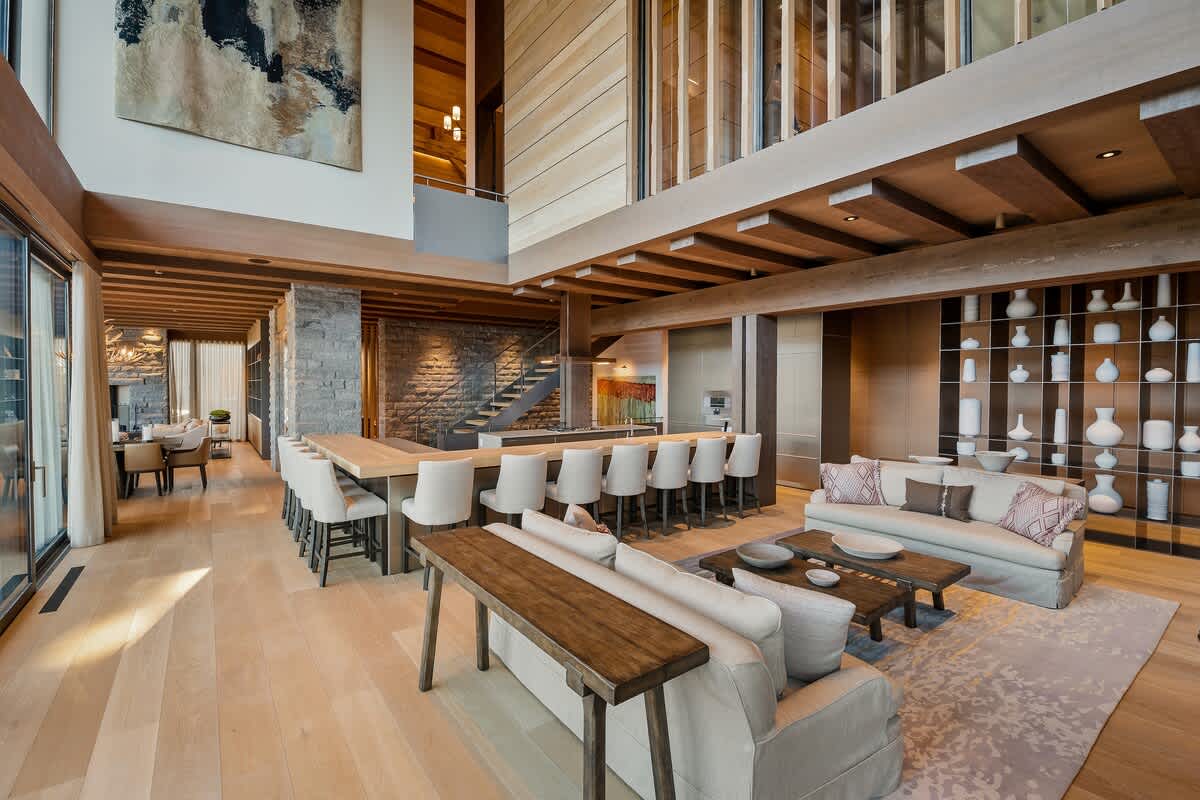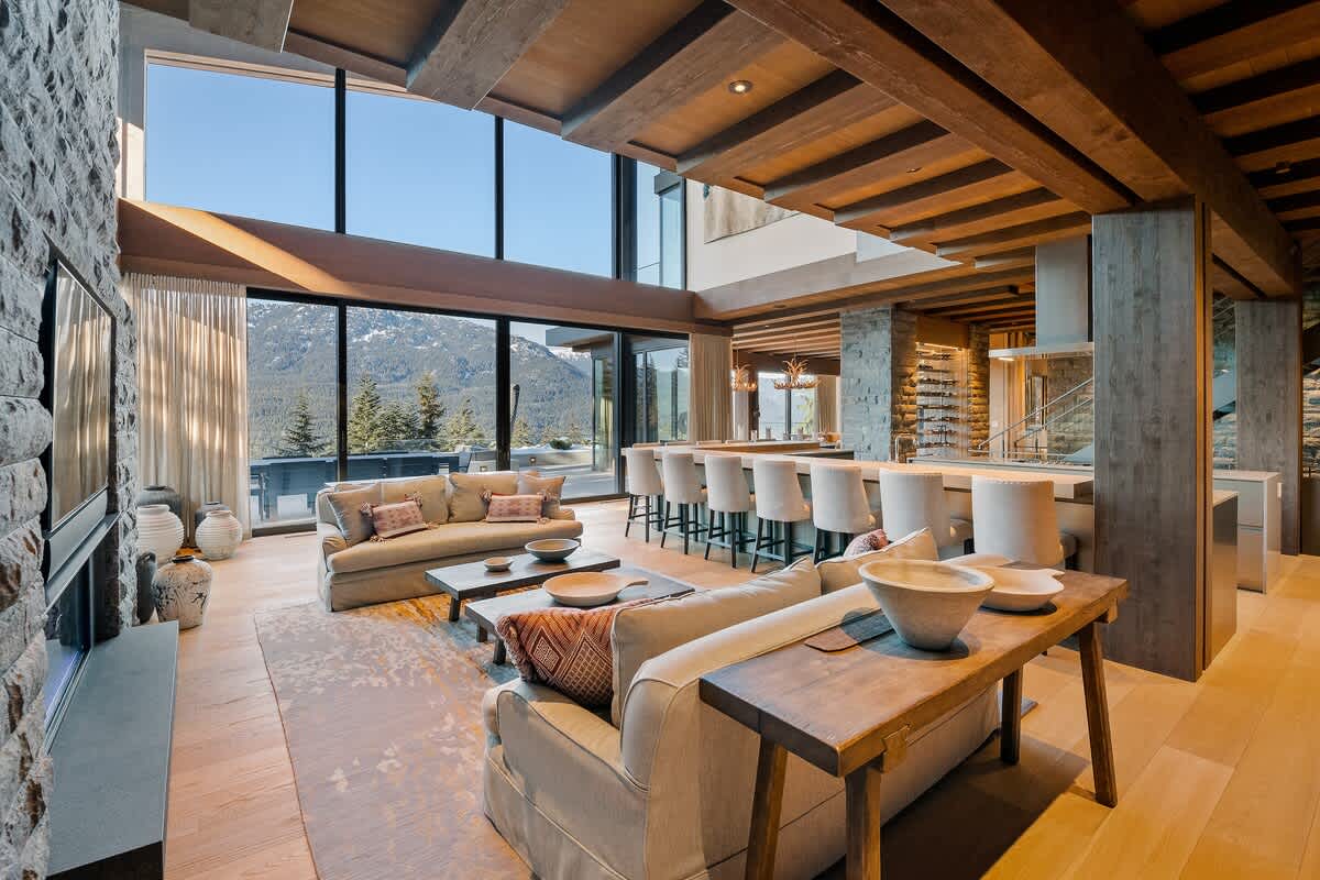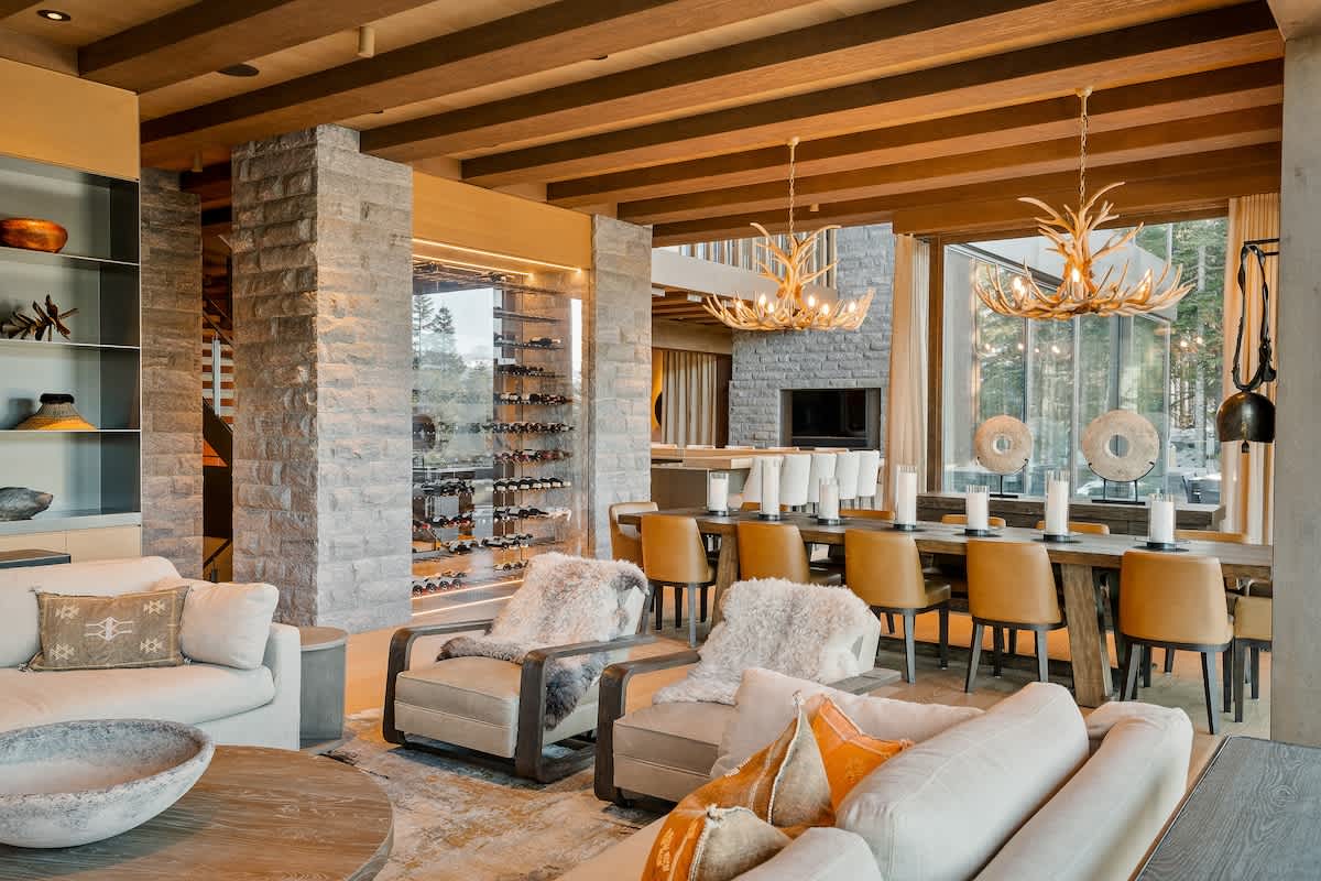 Mountainscape spans about 15,000 square feet of indoor and outdoor gathering space designed for connection across three levels. Vaulted rooms and floor-to-ceiling glass frame the surrounding mountains, lake, and forest, creating a warm place to return to after a day on the slopes. An elevator links each floor, and a double garage plus additional parking helps arrivals feel effortless.