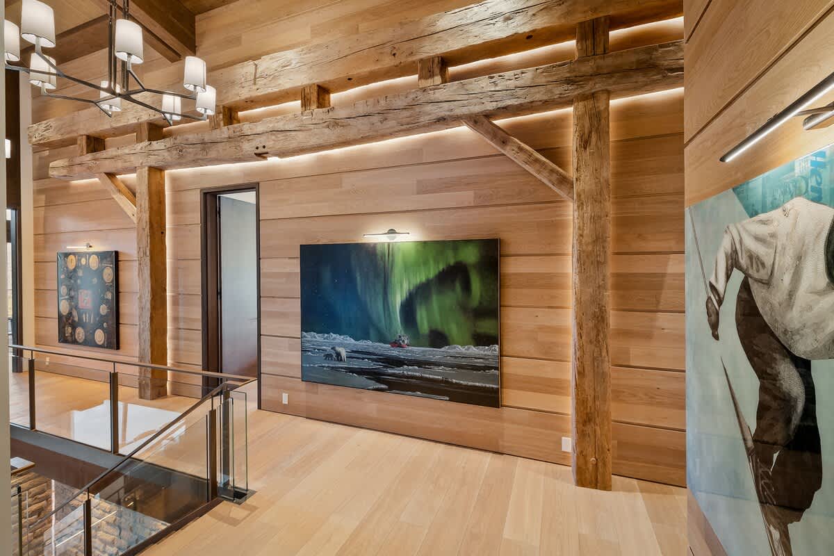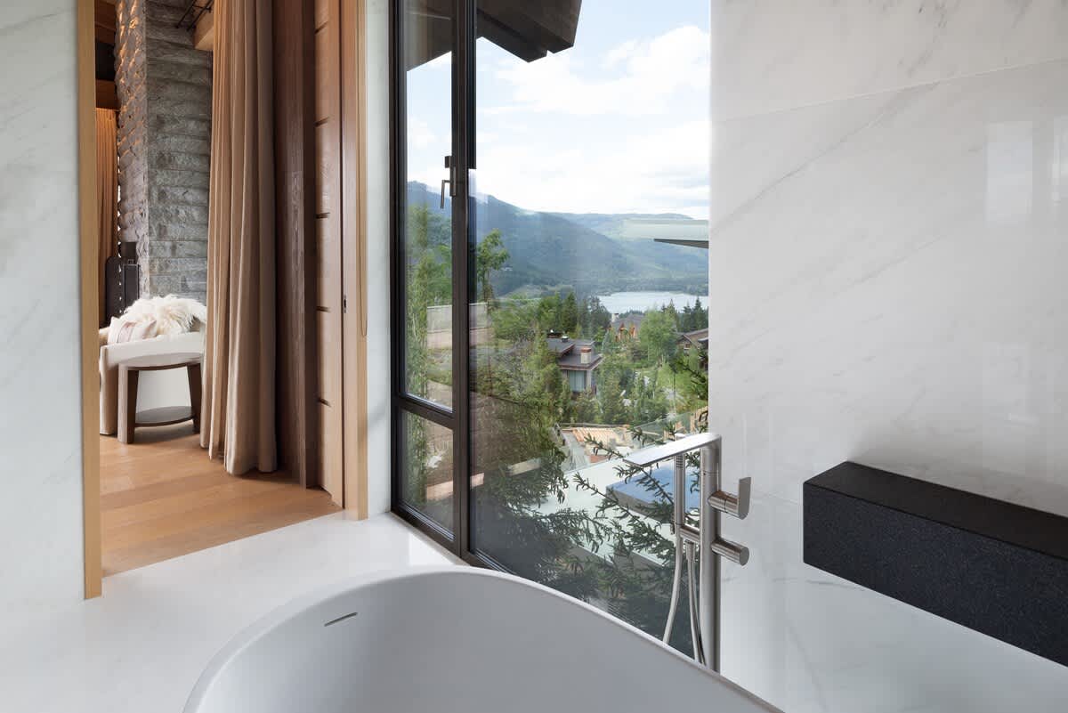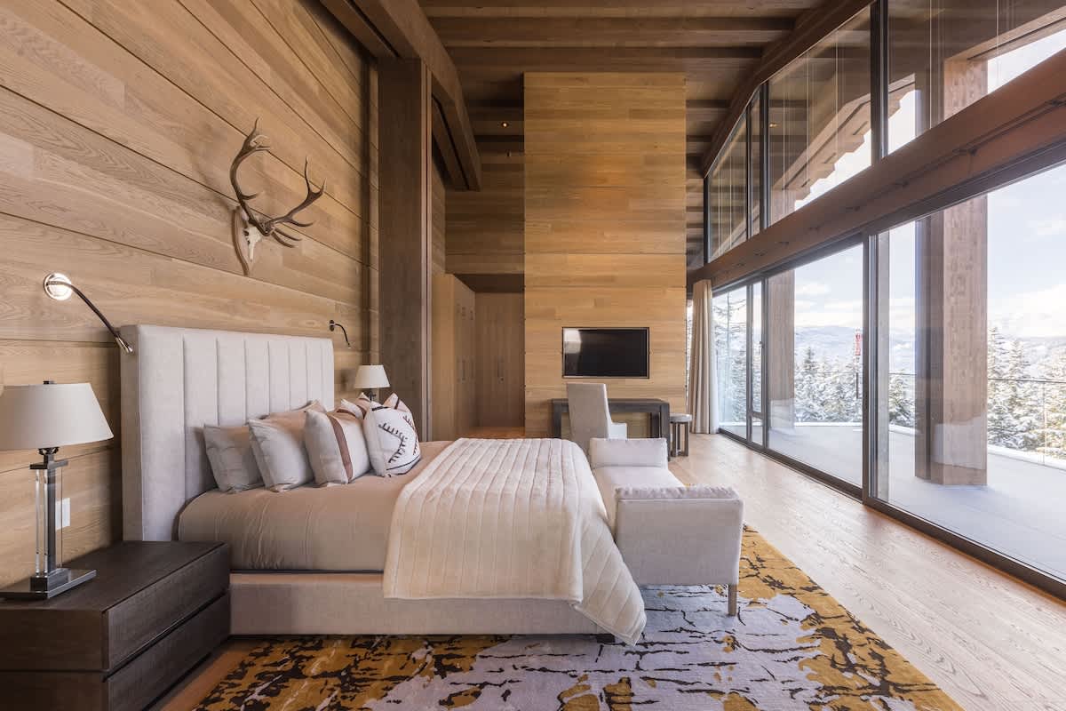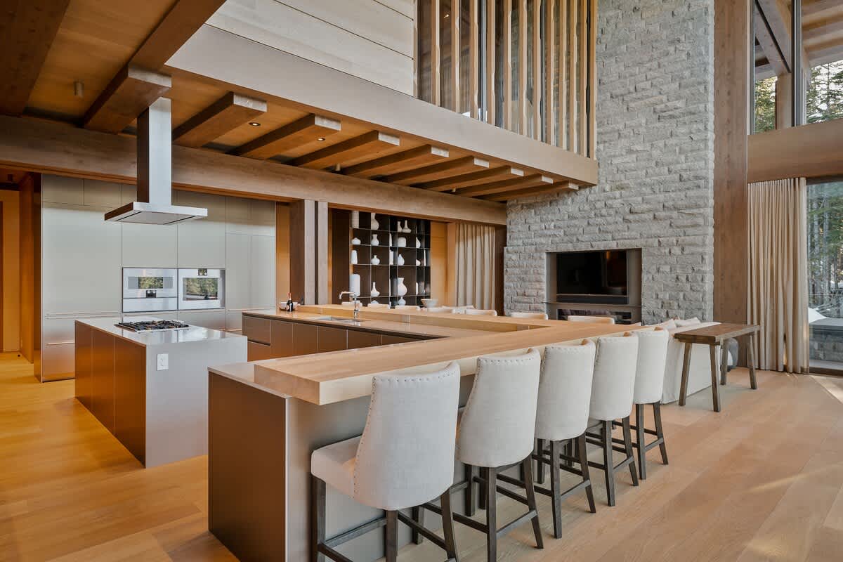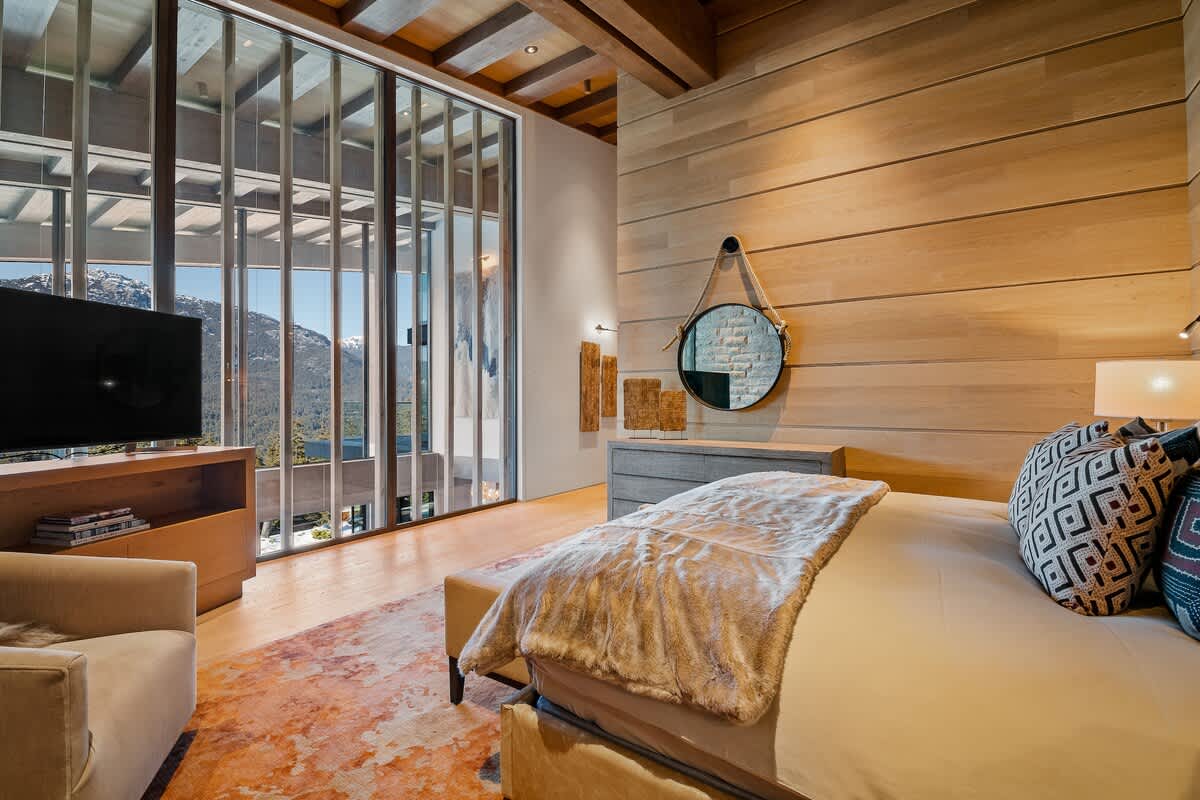 Mountainscape spans about 15,000 square feet of indoor and outdoor gathering space designed for connection across three levels. Vaulted rooms and floor-to-ceiling glass frame the surrounding mountains, lake, and forest, creating a warm place to return to after a day on the slopes. An elevator links each floor, and a double garage plus additional parking helps arrivals feel effortless.