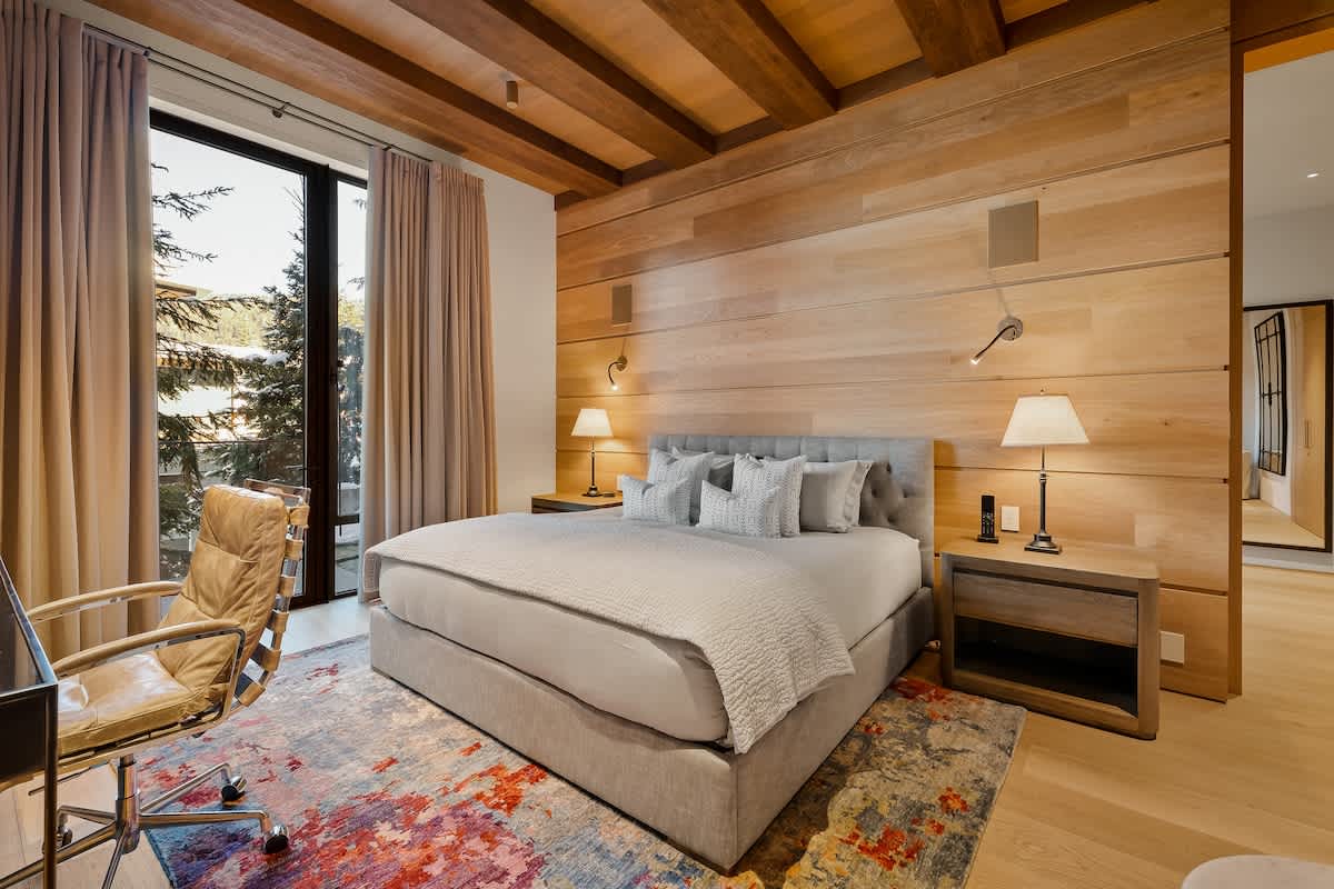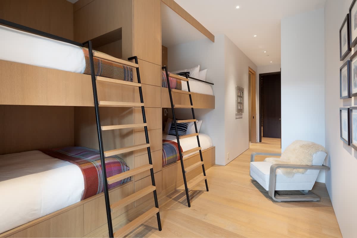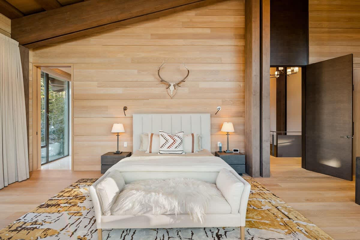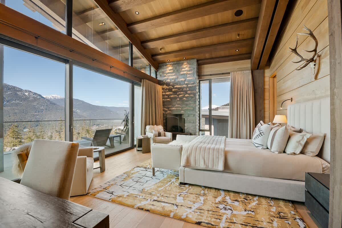 Seven bedrooms accommodate up to fourteen guests, with a thoughtful mix of private suites and relaxed bunk spaces. The primary suite features a king bed, fireplace, balcony, and ensuite with a deep soaker tub and heated floors. Three additional king bedrooms include private ensuites, while a fifth king bedroom offers a workspace and freestanding tub. On the lower level, two bunk rooms each hold two queen-sized bunk beds, both with private bathrooms.