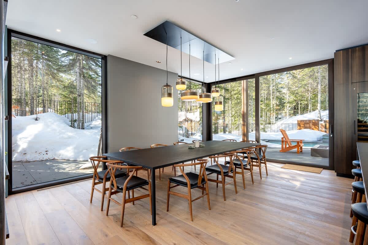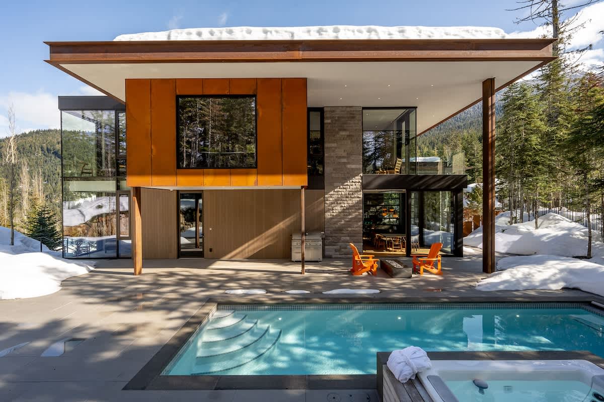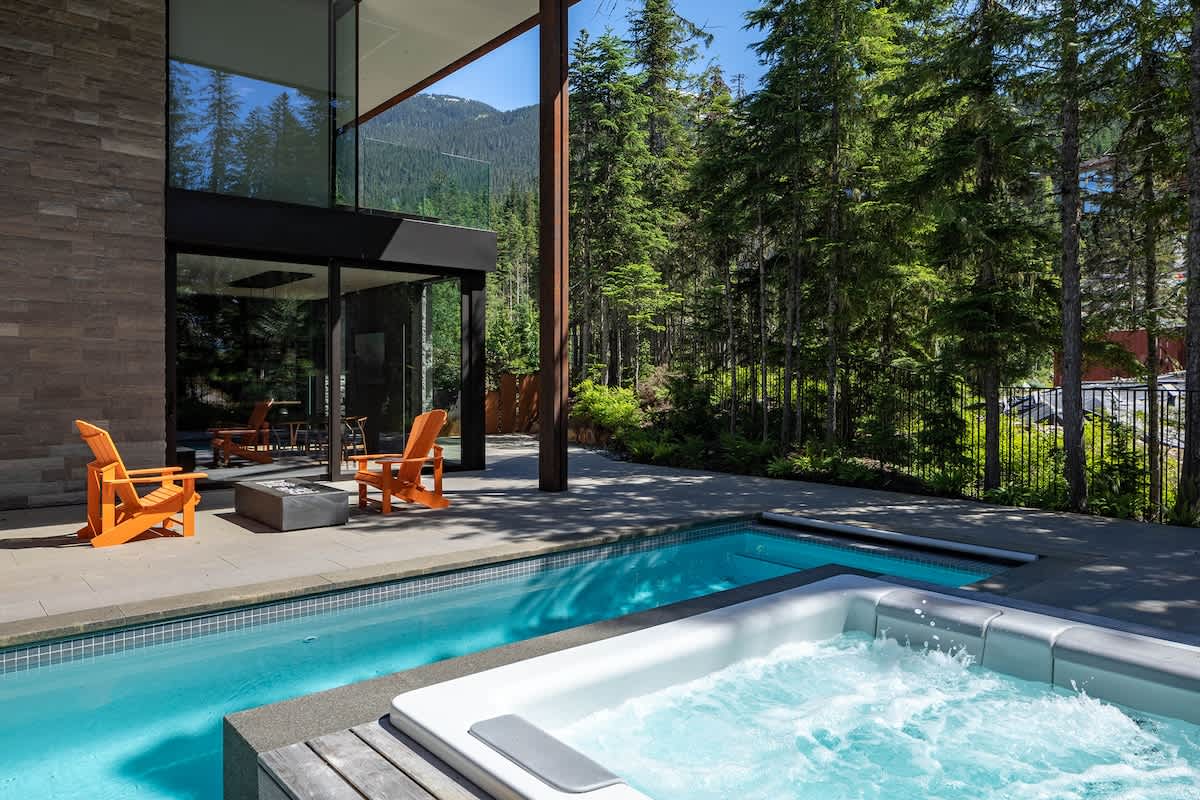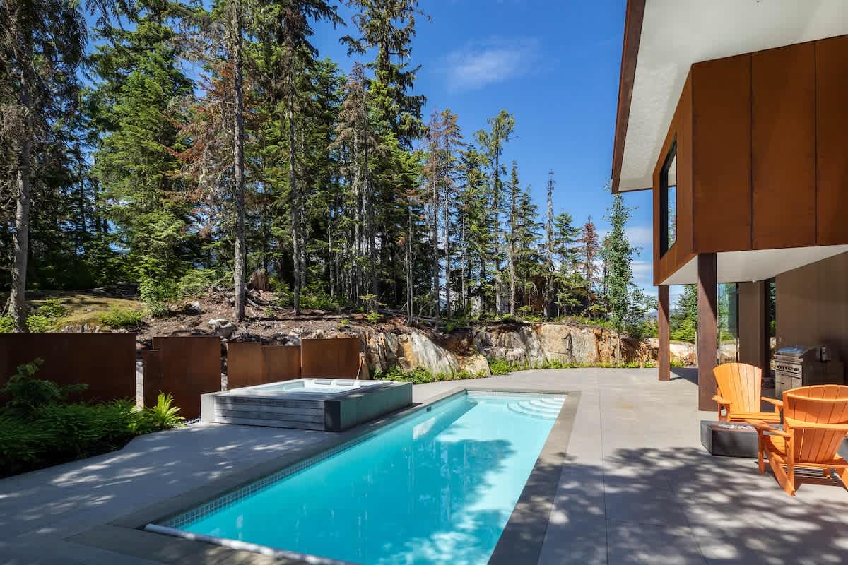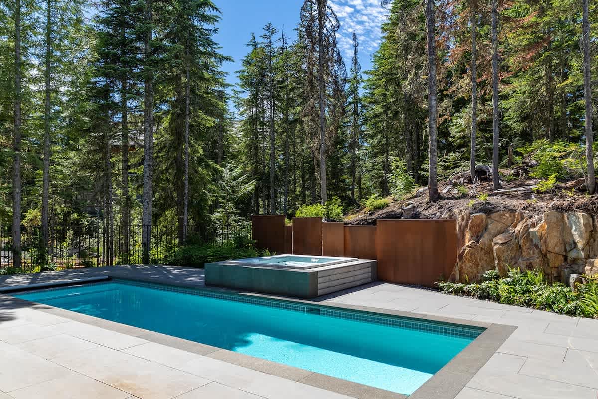 Winter days end well outdoors here. The private outdoor pool is heated and available all year, open 24 hours, and pairs naturally with the private hot tub for soaking beneath falling snow. The patio includes outdoor furniture, a fire pit, BBQ grill, outdoor kitchen, and dining area, all surrounded by old-growth forest that adds a sense of quiet and privacy.