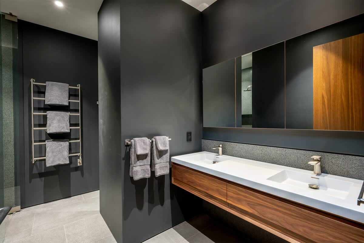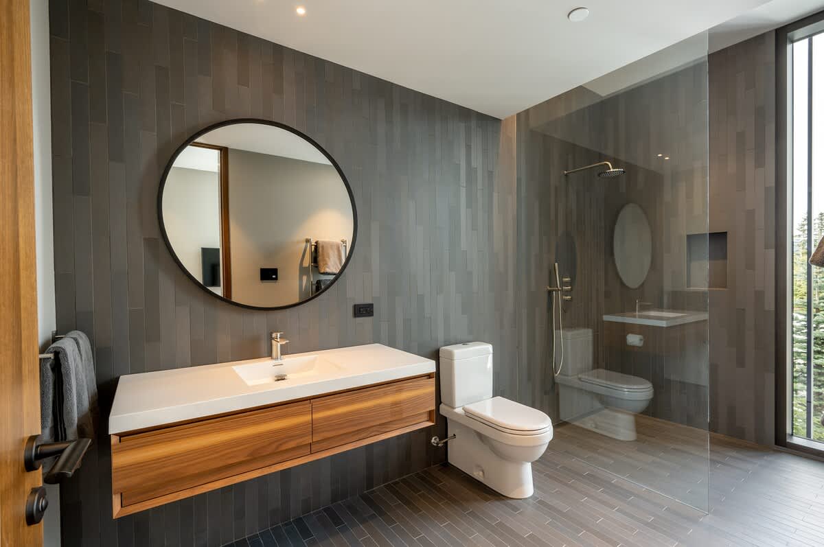 Spread across three levels, the home sleeps up to 14 guests in seven bedrooms. The primary suite includes a fireplace, walk-through closet, and an ensuite bathroom with double vanity and deep-soaker tub overlooking the forest. Five additional bedrooms each feature a queen-sized bed, TV, and ensuite bathroom with walk-in shower. On the lower level, a large bunk room offers two queen-sized bunk beds, a TV, game console, and a bathroom with double vanity. A separate powder room near the media room adds convenience for shared spaces.