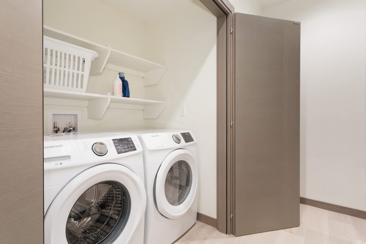 Even in winter, the patio’s gas fireplace offers a sheltered spot to take in the cool air before retreating indoors. Lake access via the Valley Trail leads to Lakeside Park just below the residence, ideal for peaceful shoreline walks during the colder season. The private entrance and smart lock make arrivals simple and seamless.