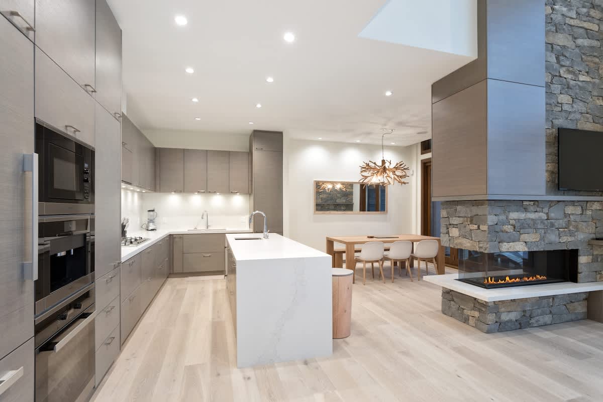 The chef’s kitchen centers around a gas cooktop, large island, and high-end appliances, creating a welcoming space for shared winter meals. A dining table for six and a breakfast bar for four ensure everyone has a comfortable place to gather. The kitchen includes a kitchen, refrigerator, microwave, dishwasher, stove, oven, cooking basics, and other essentials for preparing meals at home.