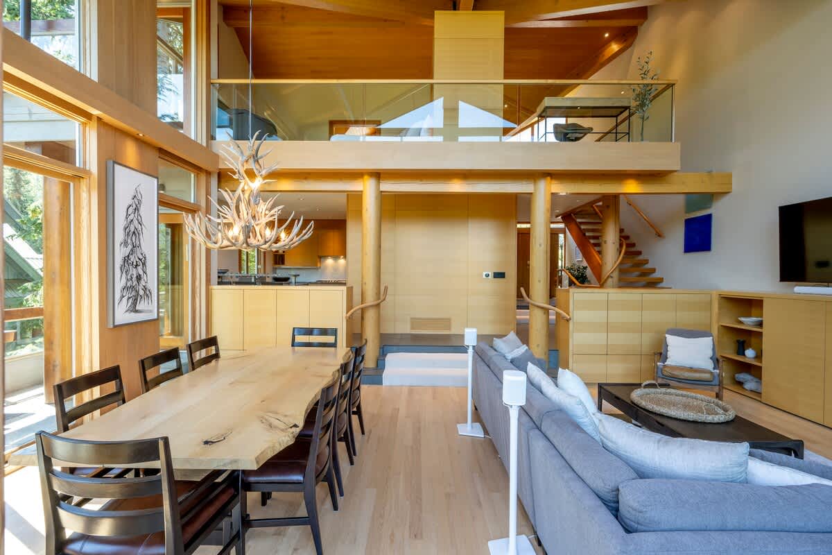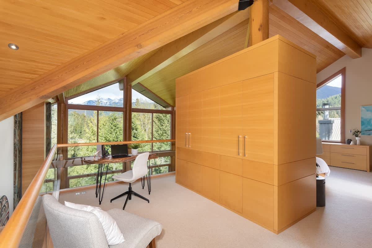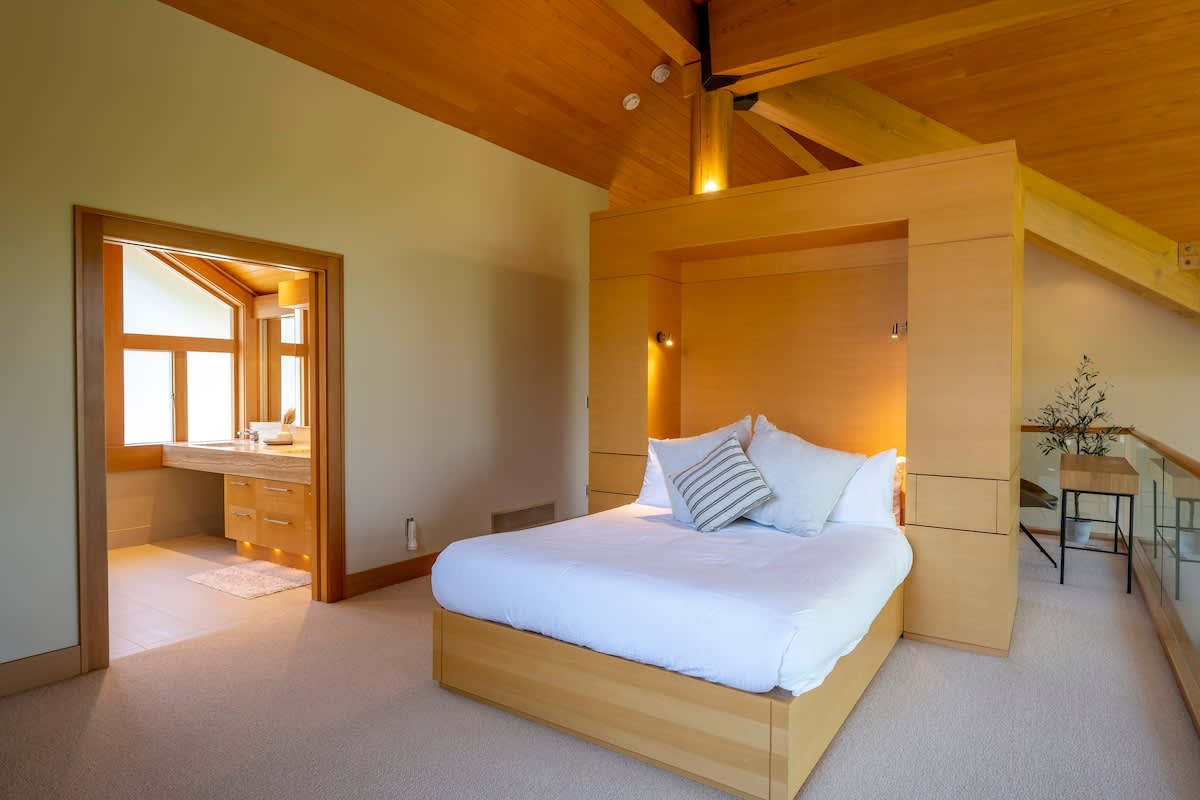 • Primary bedroom is an open loft. It is above the living room and does not offer privacy. The floor-to-ceiling windows in the living room do not have blinds. Early risers will love that sunlight will fill the open-plan bedroom from sunrise. If you prefer a darker sleeping environment, we recommend choosing one of the downstairs bedrooms instead.