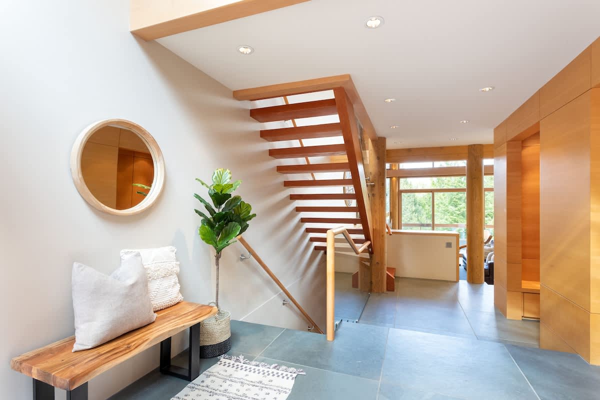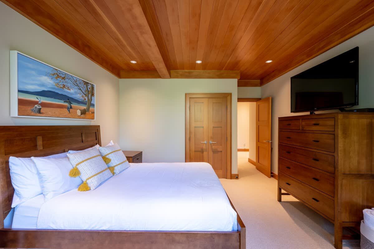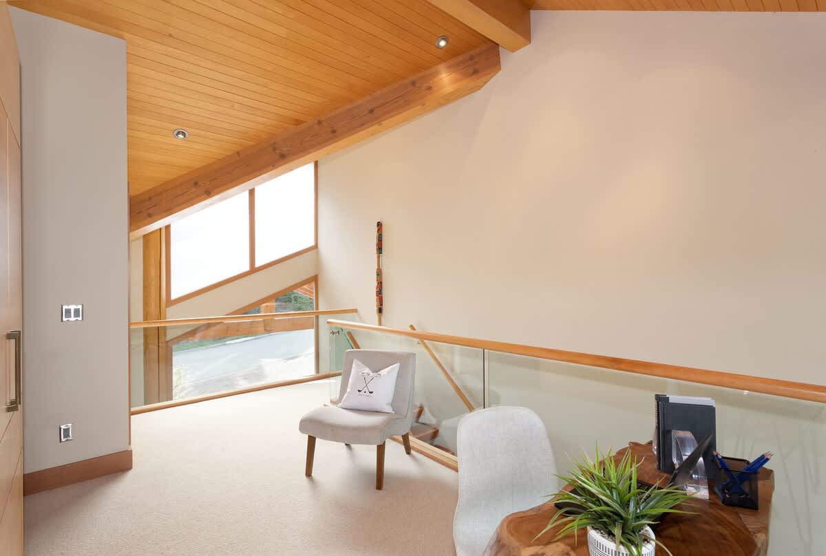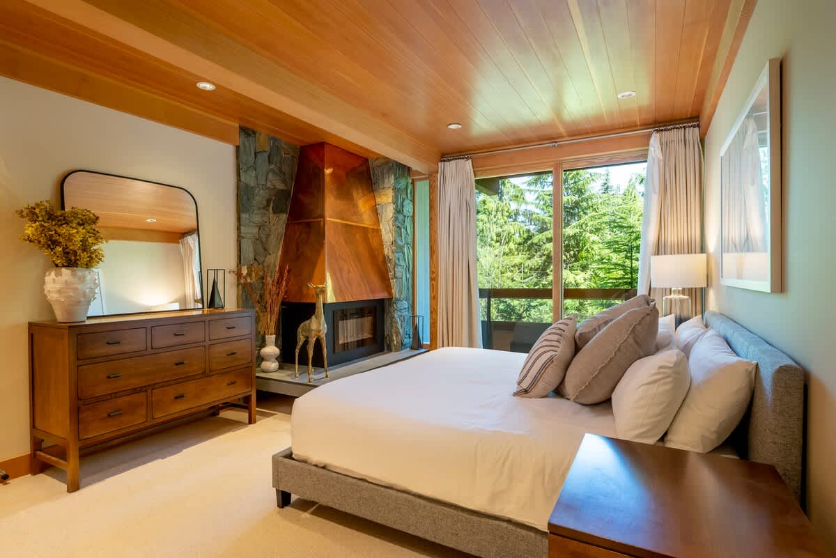 • Primary bedroom is an open loft. It is above the living room and does not offer privacy. The floor-to-ceiling windows in the living room do not have blinds. Early risers will love that sunlight will fill the open-plan bedroom from sunrise. If you prefer a darker sleeping environment, we recommend choosing one of the downstairs bedrooms instead.