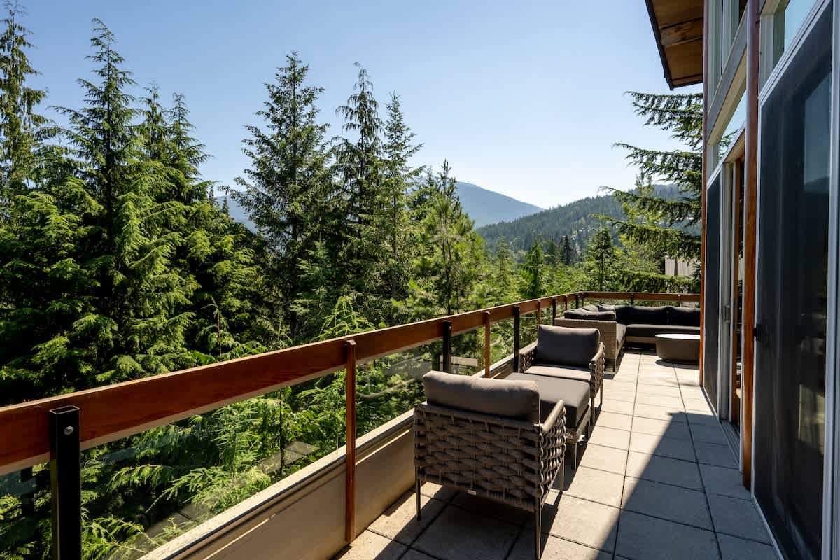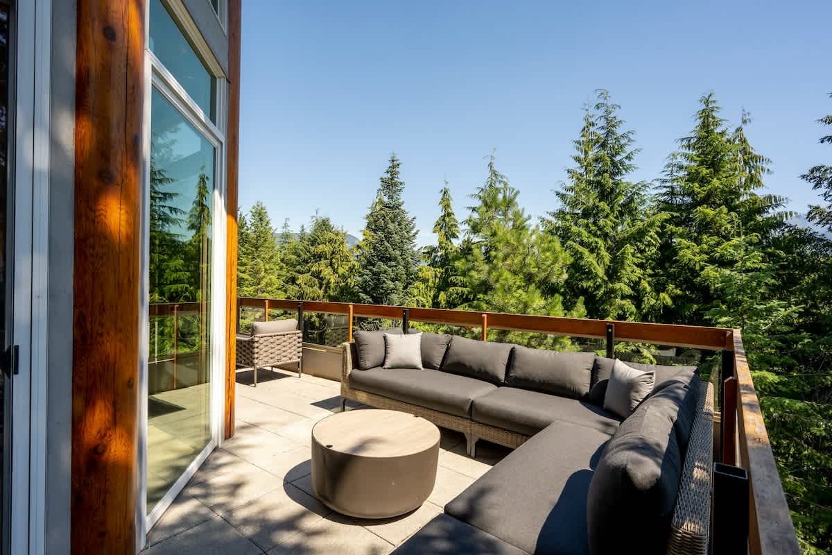 The lower deck is home to a hot tub where you can unwind after a day on the mountain, surrounded by winter stillness and sweeping views. Outdoor furniture creates space to pause and take it all in before heading back inside.